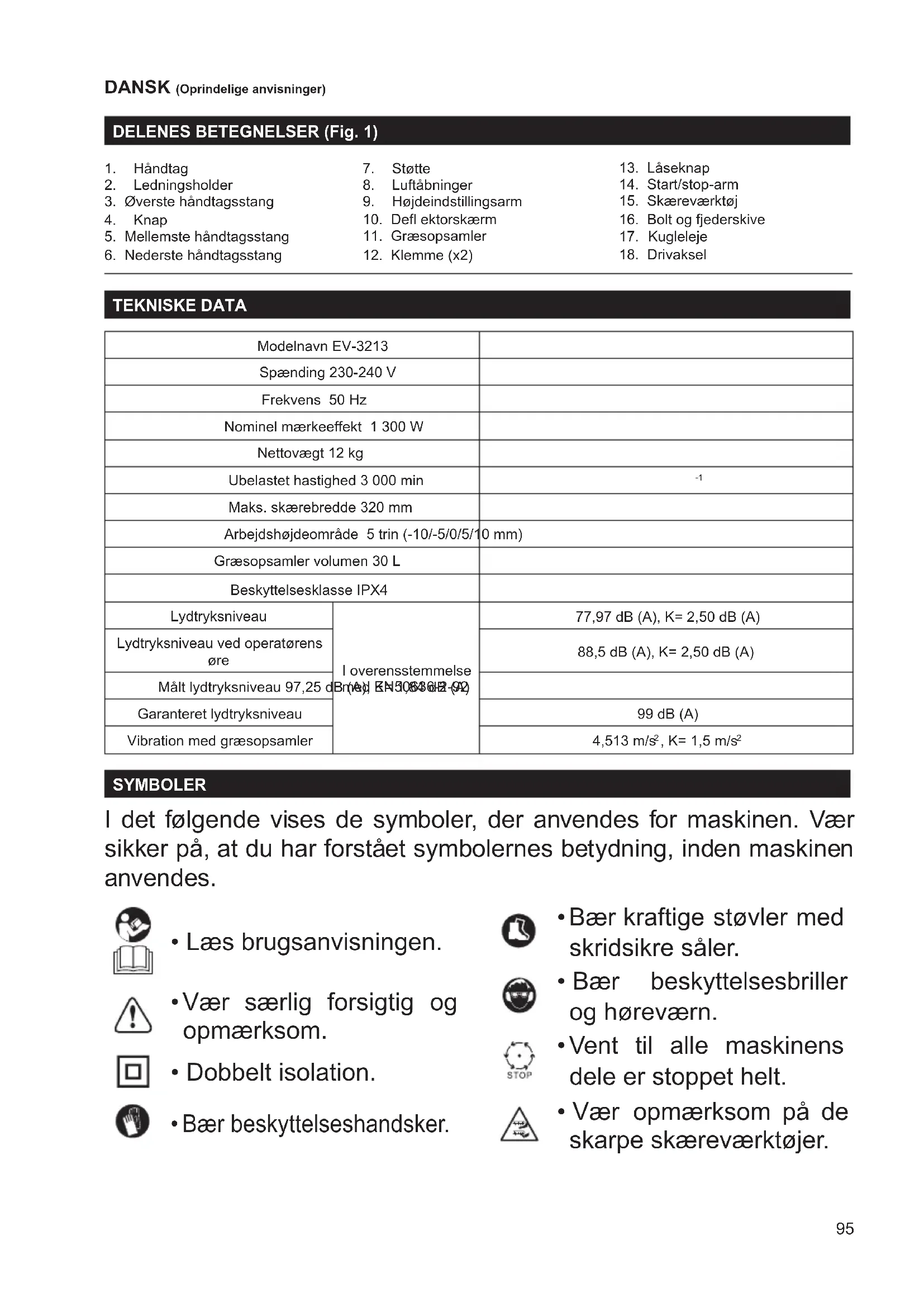 Maks. skærebredde 320 mm Arbejdshøjdeområde 5 trin (-10/-5/0/5/10 mm) Græsopsamler volumen 30 L Beskyttelsesklasse IPX4 Lydtryksniveau I overensstemmelse med EN50636-2-92 77,97 dB (A), K= 2,50 dB (A) Lydtryksniveau ved operatørens øre 88,5 dB (A), K= 2,50 dB (A) Målt lydtryksniveau 97,25 dB (A), K= 1,84 dB (A) Garanteret lydtryksniveau 99 dB (A) Vibration med græsopsamler 4,513 m/s