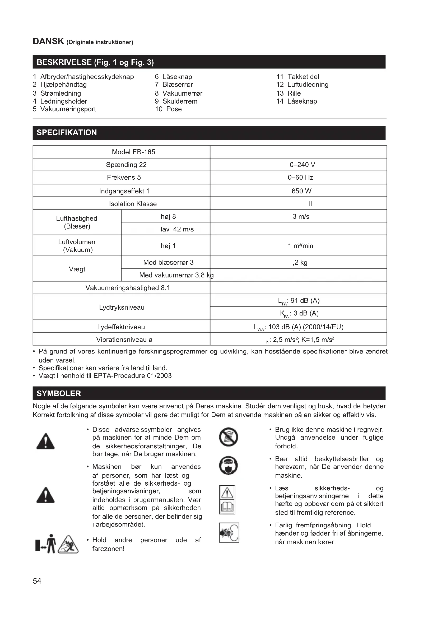 DANSK (Originale instruktioner) BESKRIVELSE (Fig. 1 og Fig. 3) 1 Afbryder/hastighedsskydeknap 2 Hjælpehåndtag 3 Strømledning 4 Ledningsholder 5 Vakuumeringsport 6 Låseknap 7 Blæserrør 8 Vakuumerrør 9 Skulderrem 10 Pose