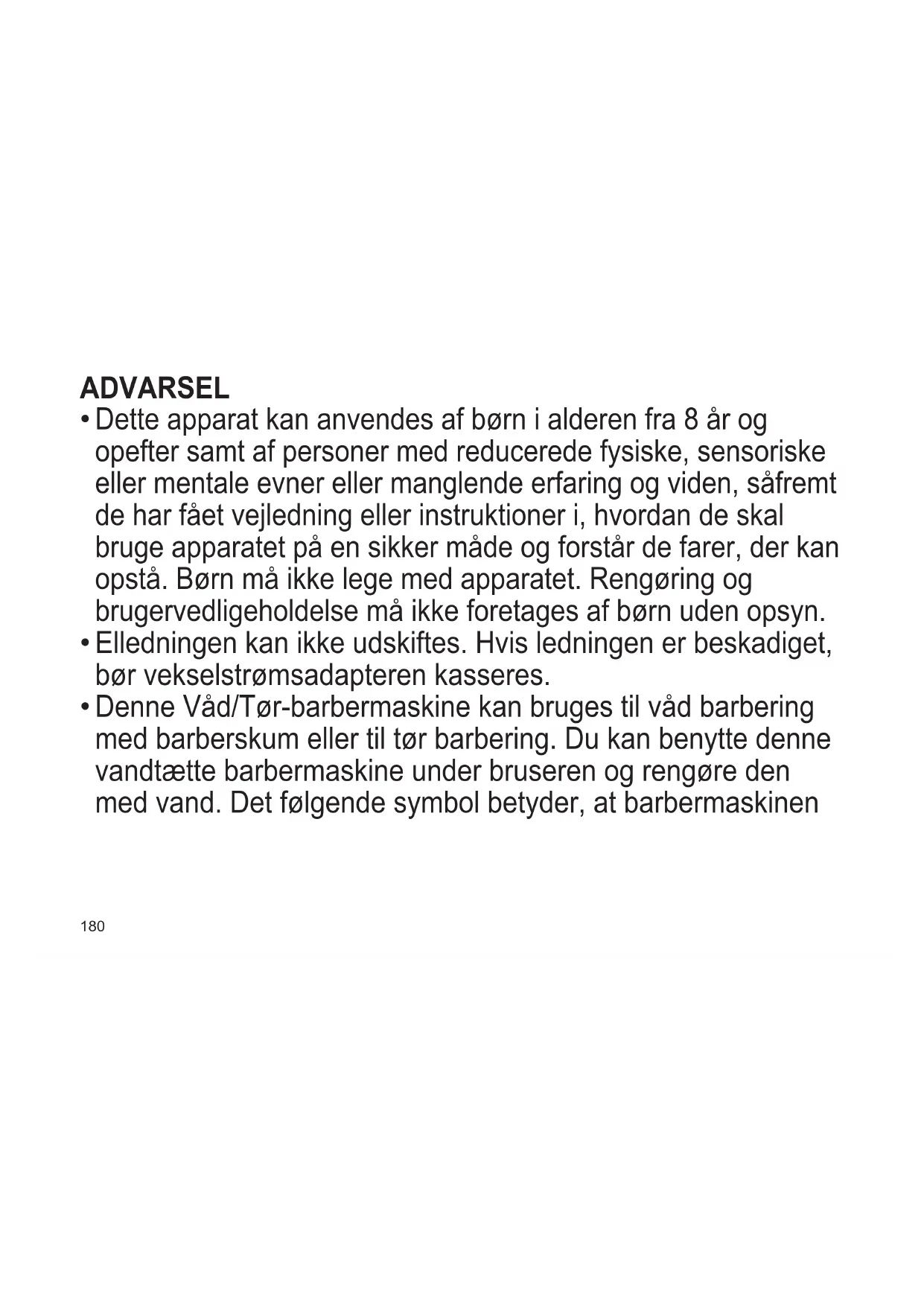 Dette apparat kan anvendes af børn i alderen fra 8 år og opefter samt af personer med reducerede fysiske, sensoriske eller mentale evner eller manglende erfaring og viden, såfremt de har fået vejledning eller instruktioner i, hvordan de skal bruge apparatet på en sikker måde og forstår de farer, der kan opstå. Børn må ikke lege med apparatet. Rengøring og brugervedligeholdelse må ikke foretages af børn uden opsyn.