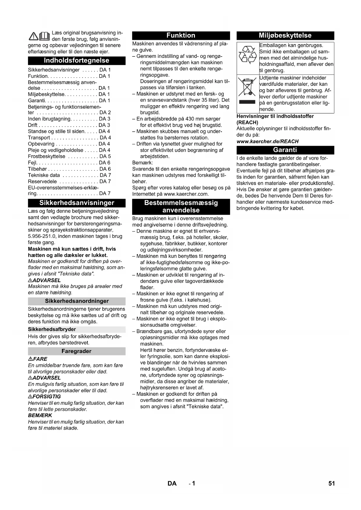 Chairman of the Board of Management Director Regulatory Affairs & Certification 50 PT- 1 Læs original brugsanvisning in- den første brug, følg anvisnin- gerne og opbevar vejledningen til senere efterlæsning eller til den næste ejer. Læs og følg denne betjeningsvejledning samt den vedlagte brochure med sikker- hedsanvisninger for børsterengøringsma- skiner og sprayekstraktionsapparater, 5.956-251.0, inden maskinen tages i brug første gang. Maskinen må kun sættes i drift, hvis hætten og alle dæksler er lukket. Maskinen er godkendt for driften på over- flader med en maksimal hældning, som an- gives i afsnit "Tekniske data". 몇 ADVARSEL Maskinen må ikke bruges på arealer med en større hældning. Sikkerhedsanordningerne tjener brugerens beskyttelse og må ikke sættes ud af drift og deres funktion må ikke omgås. Hvis der gives slip for sikkerhedsafbryde- ren, afbrydes børstedrevet. FARE En umiddelbar truende fare, som kan føre til alvorlige personskader eller død. 몇 ADVARSEL En muligvis farlig situation, som kan føre til alvorlige personskader eller til død. 몇 FORSIGTIG Henviser til en mulig farlig situation, der kan føre til lette personskader. BEMÆRK Henviser til en mulig farlig situation, der kan føre til materiel skade. Maskinen anvendes til vådrensning af pla- ne gulve. – Gennem indstilling af vand- og rengø- ringsmiddelmængden kan maskinen nemt tilpasses til den enkelte rengø- ringsopgave. Doseringen af rengøringsmiddel kan til- passes via tilførslen i tanken. – Maskinen er udstyret med en fersk- og en snavsevandstank (hver 35 liter). Det muliggør en effektiv rengøring ved lang brugstid. – En arbejdsbredde på 430 mm sørger for et effektivt brug ved høj brugstid. – Maskinen skubbes manuelt og under- støttes fra børsternes rotation. – Driften via lysnettet giver mulighed for stor effektivitet uden begrænsning af arbejdstiden. Bemærk: Svarende til den enkelte rengøringsopgave kan maskinen udstyres med forskelligt til- behør. Spørg efter vores katalog eller besøg os på Internettet på www.kaercher.com. Brug maskinen kun i overensstemmelse med angivelserne i denne driftsvejledning. – Denne maskine er egnet til erhvervs- mæssig brug, f.eks. på hoteller, skoler, sygehuse, fabrikker, butikker, kontorer og udlejningsvirksomheder. – Maskinen må kun benyttes til rengøring af ikke-fugtighedsfølsomme og ikke-po- leringsfølsomme glatte gulve. – Maskinen er udviklet til rengøring af in- dendørs gulve eller tagoverdækkede flader. – Maskinen er ikke egnet til rengøring af frosne gulve (f.eks. i kølehuse). – Maskinen må kun udstyres med origi- nalt tilbehør og originale reservedele. – Maskinen er ikke egnet til brug i eksplo- sionsudsatte omgivelser. – Brændbare gas, ufortyndede syrer eller opløsningsmidler må ikke optages med maskinen. Hertil hører benzin, fortyndervæske el- ler fyringsolie, som kan danne eksplosi- ve blandinger når de hvirvles sammen med sugeluften. Undgå brug af aceto- ne, ufortyndede syrer og opløsnings- midler, da disse angriber de materialer, højtryksrenseren er lavet af. – Maskinen er godkendt for driften på overflader med en maksimal hældning, som angives i afsnit "Tekniske data". Henvisninger til indholdsstoffer (REACH) Aktuelle oplysninger til indholdsstoffer fin- der du på: www.kaercher.de/REACH I de enkelte lande gælder de af vore for- handlere fastlagte garantibetingelser. Eventuelle fejl på dit tilbehør afhjælpes gra- tis inden for garantien, såfremt fejlen kan tilskrives en materiale- eller produktionsfejl. Hvis De ønsker at gøre garantien gælden- de, bedes De henvende Dem til Deres for- handler eller nærmeste kundeservice med- bringende kvittering for købet. Indholdsfortegnelse Sikkerhedsanvisninger . . . . . . DA 1 Funktion. . . . . . . . . . . . . . . . . . DA 1 Bestemmelsesmæssig anven- delse . . . . . . . . . . . . . . . . . . . . DA 1 Miljøbeskyttelse. . . . . . . . . . . . DA 1 Garanti. . . . . . . . . . . . . . . . . . . DA 1 Betjenings- og funktionselemen- ter . . . . . . . . . . . . . . . . . . . . . . DA 2 Inden ibrugtagning. . . . . . . . . . DA 3 Drift . . . . . . . . . . . . . . . . . . . . . DA 3 Standse og stille til siden. . . . . DA 4 Transport . . . . . . . . . . . . . . . . . DA 4 Opbevaring . . . . . . . . . . . . . . . DA 4 Pleje og vedligeholdelse . . . . . DA 4 Frostbeskyttelse . . . . . . . . . . . DA 5 Fejl. . . . . . . . . . . . . . . . . . . . . . DA 6 Tilbehør . . . . . . . . . . . . . . . . . . DA 6 Tekniske data . . . . . . . . . . . . . DA 7 Reservedele . . . . . . . . . . . . . . DA 7 EU-overensstemmelses-erklæ- ring. . . . . . . . . . . . . . . . . . . . . . DA 7 Sikkerhedsanvisninger Sikkerhedsanordninger Sikkerhedsafbryder Faregrader Funktion Bestemmelsesmæssig anvendelse Miljøbeskyttelse Emballagen kan genbruges. Smid ikke emballagen ud sam- men med det almindelige hus- holdningsaffald, men aflever den til genbrug. Udtjente maskiner indeholder værdifulde materialer, der kan og bør afleveres til genbrug. Af- lever derfor udtjente maskiner på en genbrugsstation eller lig- nende. Garanti 51DA- 2 1 Fnugfilter 2 Sikkerhedsafbryder 3 Aftapningsslangen for det snavsede vand med doseringsanordning 4 Holdeskinne for "Homebase" 5 Svømmerventil 6 Ferskvandtank 7 Låg ferskvandtank 8 Grebfordybning 9 Rensehoved 10 Skivebørste 11 Påfyldningsåbning ferskvandstank 12 Bøjle børsteskift 13 Snavsevandsbeholder 14 Indikator til ferskvandets påfyldnings- stand 15 Drejehåndtag til hældning af sugebjæl- ken 16 Højdejustering sugebjælke * 17 Vingemøtrikker til fastgørelse af suge- bjælken 18 Sugebjælke * 19 Sugeslange 20 Reguleringsknap vandmængde 21 Netkabel med netstik 22 Håndtag sugebjælkesænkning 23 Betjeningspanel 24 Bøjle 25 Opbevaring for rengøringssæt „Home- base Box“ 26 Dæksel til snavsevandsbeholder