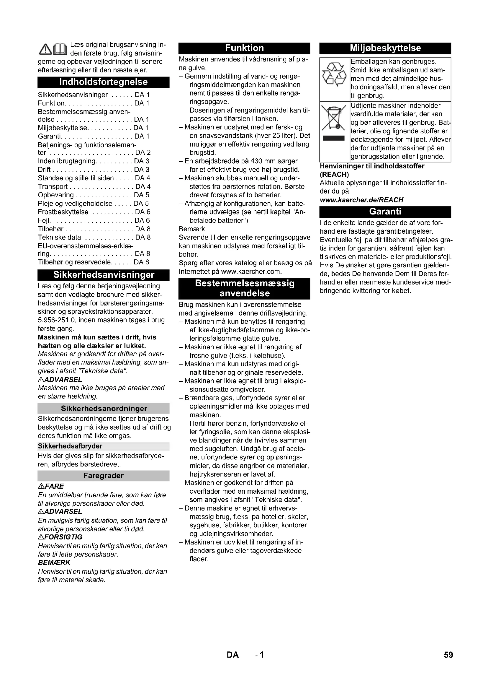 Acessórios e peças sobressalentes Chairman of the Board of Management Director Regulatory Affairs & Certification 58 PT- 1 Læs original brugsanvisning in- den første brug, følg anvisnin- gerne og opbevar vejledningen til senere efterlæsning eller til den næste ejer. Læs og følg denne betjeningsvejledning samt den vedlagte brochure med sikker- hedsanvisninger for børsterengøringsma- skiner og sprayekstraktionsapparater, 5.956-251.0, inden maskinen tages i brug første gang. Maskinen må kun sættes i drift, hvis hætten og alle dæksler er lukket. Maskinen er godkendt for driften på over- flader med en maksimal hældning, som an- gives i afsnit "Tekniske data". 몇 ADVARSEL Maskinen må ikke bruges på arealer med en større hældning. Sikkerhedsanordningerne tjener brugerens beskyttelse og må ikke sættes ud af drift og deres funktion må ikke omgås. Hvis der gives slip for sikkerhedsafbryde- ren, afbrydes børstedrevet. FARE En umiddelbar truende fare, som kan føre til alvorlige personskader eller død. 몇 ADVARSEL En muligvis farlig situation, som kan føre til alvorlige personskader eller til død. 몇 FORSIGTIG Henviser til en mulig farlig situation, der kan føre til lette personskader. BEMÆRK Henviser til en mulig farlig situation, der kan føre til materiel skade. Maskinen anvendes til vådrensning af pla- ne gulve. – Gennem indstilling af vand- og rengø- ringsmiddelmængden kan maskinen nemt tilpasses til den enkelte rengø- ringsopgave. Doseringen af rengøringsmiddel kan til- passes via tilførslen i tanken. – Maskinen er udstyret med en fersk- og en snavsevandstank (hver 25 liter). Det muliggør en effektiv rengøring ved lang brugstid. – En arbejdsbredde på 430 mm sørger for et effektivt brug ved høj brugstid. – Maskinen skubbes manuelt og under- støttes fra børsternes rotation. Børste- drevet forsynes af to batterier. – Afhængig af konfigurationen, kan batte- rierne udvælges (se hertil kapitel "An- befalede batterier") Bemærk: Svarende til den enkelte rengøringsopgave kan maskinen udstyres med forskelligt til- behør. Spørg efter vores katalog eller besøg os på Internettet på www.kaercher.com. Brug maskinen kun i overensstemmelse med angivelserne i denne driftsvejledning. – Maskinen må kun benyttes til rengøring af ikke-fugtighedsfølsomme og ikke-po- leringsfølsomme glatte gulve. – Maskinen er ikke egnet til rengøring af frosne gulve (f.eks. i kølehuse). – Maskinen må kun udstyres med origi- nalt tilbehør og originale reservedele. – Maskinen er ikke egnet til brug i eksplo- sionsudsatte omgivelser. – Brændbare gas, ufortyndede syrer eller opløsningsmidler må ikke optages med maskinen. Hertil hører benzin, fortyndervæske el- ler fyringsolie, som kan danne eksplosi- ve blandinger når de hvirvles sammen med sugeluften. Undgå brug af aceto- ne, ufortyndede syrer og opløsnings- midler, da disse angriber de materialer, højtryksrenseren er lavet af. – Maskinen er godkendt for driften på overflader med en maksimal hældning, som angives i afsnit "Tekniske data". – Denne maskine er egnet til erhvervs- mæssig brug, f.eks. på hoteller, skoler, sygehuse, fabrikker, butikker, kontorer og udlejningsvirksomheder. – Maskinen er udviklet til rengøring af in- dendørs gulve eller tagoverdækkede flader. Henvisninger til indholdsstoffer (REACH) Aktuelle oplysninger til indholdsstoffer fin- der du på: www.kaercher.de/REACH I de enkelte lande gælder de af vore for- handlere fastlagte garantibetingelser. Eventuelle fejl på dit tilbehør afhjælpes gra- tis inden for garantien, såfremt fejlen kan tilskrives en materiale- eller produktionsfejl. Hvis De ønsker at gøre garantien gælden- de, bedes De henvende Dem til Deres for- handler eller nærmeste kundeservice med- bringende kvittering for købet. Indholdsfortegnelse Sikkerhedsanvisninger . . . . . . DA 1 Funktion. . . . . . . . . . . . . . . . . . DA 1 Bestemmelsesmæssig anven- delse . . . . . . . . . . . . . . . . . . . . DA 1 Miljøbeskyttelse. . . . . . . . . . . . DA 1 Garanti. . . . . . . . . . . . . . . . . . . DA 1 Betjenings- og funktionselemen- ter . . . . . . . . . . . . . . . . . . . . . . DA 2 Inden ibrugtagning. . . . . . . . . . DA 3 Drift . . . . . . . . . . . . . . . . . . . . . DA 3 Standse og stille til siden . . . . . DA 4 Transport . . . . . . . . . . . . . . . . . DA 4 Opbevaring . . . . . . . . . . . . . . . DA 5 Pleje og vedligeholdelse . . . . . DA 5 Frostbeskyttelse . . . . . . . . . . . DA 6 Fejl. . . . . . . . . . . . . . . . . . . . . . DA 6 Tilbehør . . . . . . . . . . . . . . . . . . DA 8 Tekniske data . . . . . . . . . . . . . DA 8 EU-overensstemmelses-erklæ- ring. . . . . . . . . . . . . . . . . . . . . . DA 8 Tilbehør og reservedele. . . . . . DA 8 Sikkerhedsanvisninger Sikkerhedsanordninger Sikkerhedsafbryder Faregrader Funktion Bestemmelsesmæssig anvendelse Miljøbeskyttelse Emballagen kan genbruges. Smid ikke emballagen ud sam- men med det almindelige hus- holdningsaffald, men aflever den til genbrug. Udtjente maskiner indeholder værdifulde materialer, der kan og bør afleveres til genbrug. Bat- terier, olie og lignende stoffer er ødelæggende for miljøet. Aflever derfor udtjente maskiner på en genbrugsstation eller lignende. Garanti 59DA- 2 1 Fnugfilter 2 Sikkerhedsafbryder 3 Batteri * 4 Aftapningsslangen for det snavsede vand med doseringsanordning 5 Holdeskinne for "Homebase" 6 Svømmerventil 7 Ferskvandtank 8 Låg ferskvandtank 9 Rensehoved 10 Skivebørste 11 Påfyldningsåbning ferskvandstank 12 Bøjle børsteskift 13 Snavsevandsbeholder 14 Pedal transportkøretøj 15 Indikator til ferskvandets påfyldnings- stand 16 Drejehåndtag til hældning af sugebjæl- ken 17 Højdejustering sugebjælke * 18 Vingemøtrikker til fastgørelse af suge- bjælken 19 Sugebjælke * 20 Sugeslange 21 Reguleringsknap vandmængde 22 Batteristik 23 Håndtag sugebjælkesænkning 24 Betjeningspanel 25 Bøjle 26 Opbevaring for rengørings