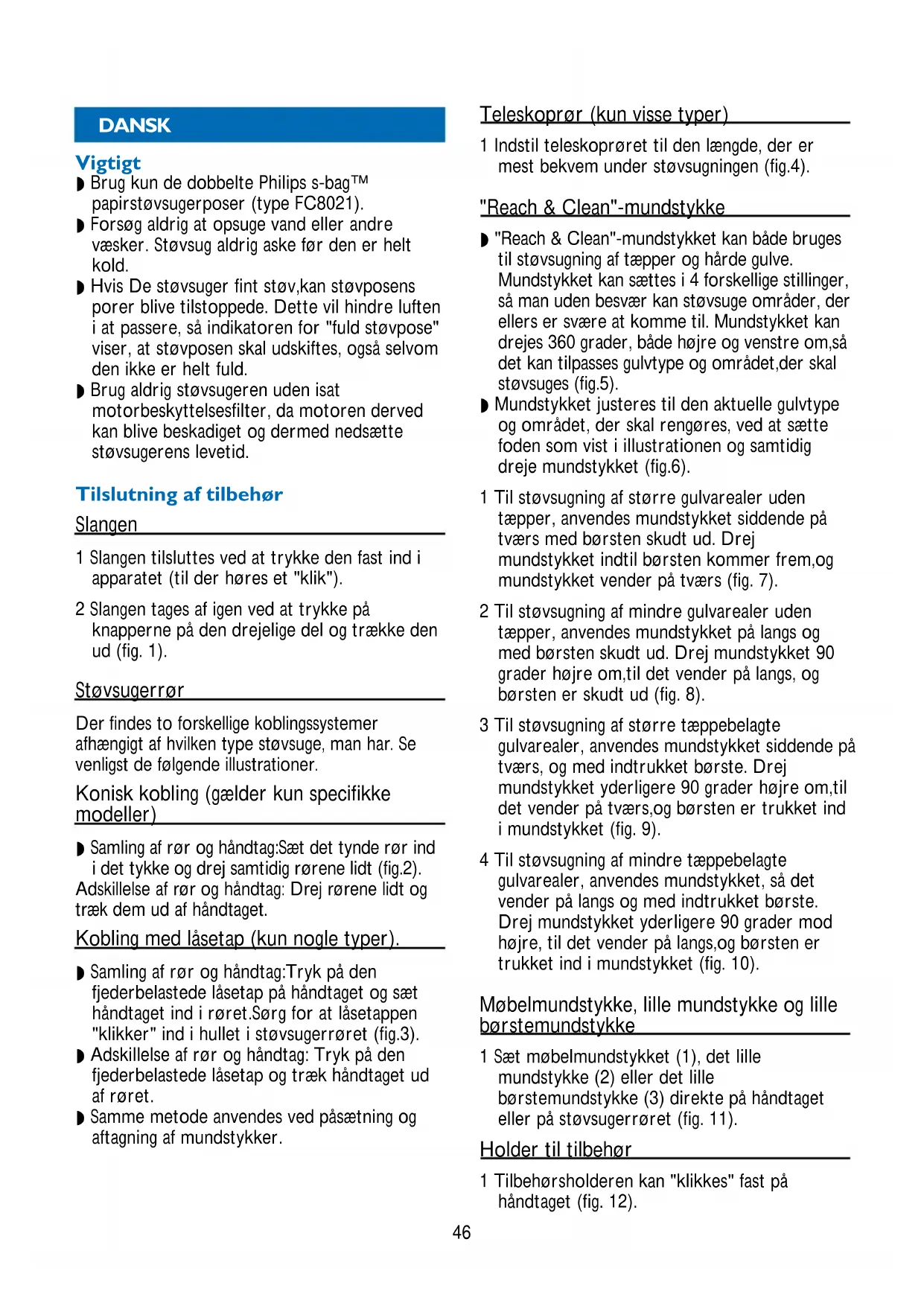 Vigtigt ◗ Brug kun de dobbelte Philips s-bag™ papirstøvsugerposer (type FC8021). ◗ Forsøg aldrig at opsuge vand eller andre væsker. Støvsug aldrig aske før den er helt kold. ◗ Hvis De støvsuger fint støv,kan støvposens porer blive tilstoppede. Dette vil hindre luften i at passere, så indikatoren for "fuld støvpose" viser, at støvposen skal udskiftes, også selvom den ikke er helt fuld. ◗ Brug aldrig støvsugeren uden isat motorbeskyttelsesfilter, da motoren derved kan blive beskadiget og dermed nedsætte støvsugerens levetid. Tilslutning af tilbehør Slangen 1 Slangen tilsluttes ved at trykke den fast ind i apparatet (til der høres et "klik"). 2 Slangen tages af igen ved at trykke på knapperne på den drejelige del og trække den ud (fig. 1). Støvsugerrør Der findes to forskellige koblingssystemer afhængigt af hvilken type støvsuge, man har. Se venligst de følgende illustrationer. Konisk kobling (gælder kun specifikke modeller) ◗ Samling af rør og håndtag:Sæt det tynde rør ind i det tykke og drej samtidig rørene lidt (fig.2). Adskillelse af rør og håndtag: Drej rørene lidt og træk dem ud af håndtaget. Kobling med låsetap (kun nogle typer). ◗ Samling af rør og håndtag:Tryk på den fjederbelastede låsetap på håndtaget og sæt håndtaget ind i røret.Sørg for at låsetappen "klikker" ind i hullet i støvsugerrøret (fig.3). ◗ Adskillelse af rør og håndtag: Tryk på den fjederbelastede låsetap og træk håndtaget ud af røret. ◗ Samme metode anvendes ved påsætning og aftagning af mundstykker. Teleskoprør (kun visse typer) 1 Indstil teleskoprøret til den længde, der er mest bekvem under støvsugningen (fig.4). "Reach & Clean"-mundstykke ◗ "Reach & Clean"-mundstykket kan både bruges til støvsugning af tæpper og hårde gulve. Mundstykket kan sættes i 4 forskellige stillinger, så man uden besvær kan støvsuge områder, der ellers er svære at komme til. Mundstykket kan drejes 360 grader, både højre og venstre om,så det kan tilpasses gulvtype og området,der skal støvsuges (fig.5). ◗ Mundstykket justeres til den aktuelle gulvtype og området, der skal rengøres, ved at sætte foden som vist i illustrationen og samtidig dreje mundstykket (fig.6). 1 Til støvsugning af større gulvarealer uden tæpper, anvendes mundstykket siddende på tværs med børsten skudt ud. Drej mundstykket indtil børsten kommer frem,og mundstykket vender på tværs (fig. 7). 2 Til støvsugning af mindre gulvarealer uden tæpper, anvendes mundstykket på langs og med børsten skudt ud. Drej mundstykket 90 grader højre om,til det vender på langs, og børsten er skudt ud (fig. 8). 3 Til støvsugning af større tæppebelagte gulvarealer, anvendes mundstykket siddende på tværs, og med indtrukket børste. Drej mundstykket yderligere 90 grader højre om,til det vender på tværs,og børsten er trukket ind i mundstykket (fig. 9). 4 Til støvsugning af mindre tæppebelagte gulvarealer, anvendes mundstykket, så det vender på langs og med indtrukket børste. Drej mundstykket yderligere 90 grader mod højre, til det vender på langs,og børsten er trukket ind i mundstykket (fig. 10). Møbelmundstykke, lille mundstykke og lille børstemundstykke 1 Sæt møbelmundstykket (1), det lille mundstykke (2) eller det lille børstemundstykke (3) direkte på håndtaget eller på støvsugerrøret (fig. 11). Holder til tilbehør 1 Tilbehørsholderen kan "klikkes" fast på håndtaget (fig. 12). DANSK47 ◗ Tilbehøret kan opbevares på to måder i tilbehørsholderen. ◗ Møbelmundstykket og det lille mundstykke kan opbevares i tilbehørsholderen ved at skubbe mundstykkerne ind i holderen.De tages ud ved at trække dem ud af holderen (fig. 13). Venligst vær opmærksom på, det lille mundstykkets placering i tilbehørsholderen. w I stedet for det lille mundstykke kan det lille børstemundstykke opbevares i tilbehørsholderen ved at skubbe det ind i holderen.Det tages ud ved at trække det ud af holderen (fig.14). Husdyrsbørste (kun specielle typer) Ved at børste Deres hund eller kat med husdyrsbørsten, fjernes snavs, løse hår og hårknuder.Ved regelmæssig børstning stimuleres den beskyttende effekt i hundens eller kattens pels. 1 Sæt husdyrsbørsten på håndtaget ("klik") (fig.15). 2 Stil støvsugeren så langt væk fra hunden eller katten som muligt.Sæt sugestyrken i laveste stilling. 3 Det bedste resultat opnås ved hele tiden at børste kattens eller hundens pels i samme retning. 4 Hårene fjernes nemmest fra børsten ved at tage den af og støvsuge den (fig 16). Sådan bruges støvsugeren Regulering af sugestyrken ◗ Sugestyrken kan reguleres under støvsugningen. 1 Brug skydeknappen oven på støvsugeren (fig.17). 2 Vælg maximal sugestyrke til støvsugning af meget snavsede tæpper og gulve. 3 Vælg laveste sugestyrke til støvsugning af gardiner,duge og lignende Infrarød fjernbetjening (kun visse typer) 1 Sæt batterierne i batterirummet (fig.18). Sørg for at - og + vender rigtigt. ◗ Med den infrarøde fjernbetjening kan man vælge 5 forskellige sugestyrker. Når støvsugeren tændes,starter den altid med den kraftigste sugestyrke. 2 Ved at trykke på - knappen reguleres sugestyrken ét trin ned (fig. 19). 3 Ved at trykke på + knappen reguleres sugestyrken ét trin op. 4 Man kan slukke midlertidigt for støvsugeren ved at trykke på standby-knappen, f.eks. mens man flytter et møbel. 5 Støvsugningen forsættes ved et enkelt tryk på - eller + knappen. Apparatet starter ved den senest valgte sugestyrke. "Parkering" af støvsugerrøret 1 Sæt falsen på mundstykket ind i "parkerings"- beslaget. Røret "parkeres" hermed nemt og praktisk (fig. 20). Opbevaring af støvsugeren 1 Stil apparatet i opretstående stilling og fastgør mundstykket/røret (fig.21). Udskiftning af støvpose 1 Støvposen skal udskiftes,så snart indikatoren for "fuld støvpose" skifter farve (fig 22). Støvposen skal udskiftes, så snart indikatoren for "fuld støvpose" ski
