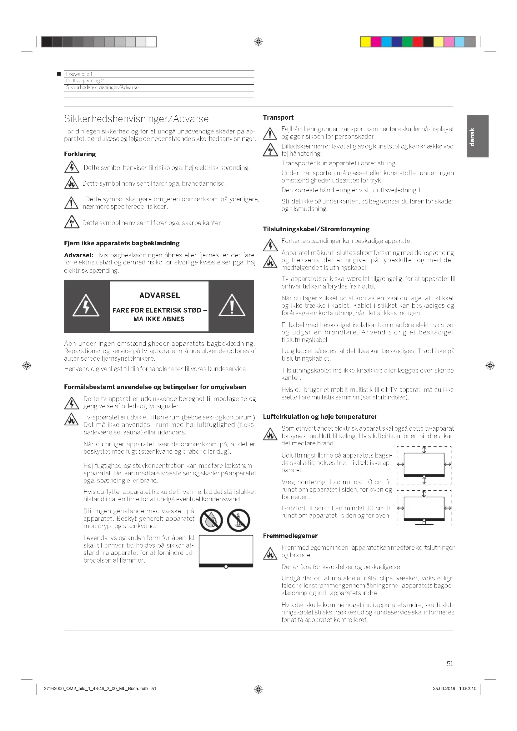 Transport Fejlhåndtering under transport kan medføre skader på displayet og øge risikoen for personskader. Billedskærmen er lavet af glas og kunststof og kan knække ved fejlhåndtering. Transportér kun apparatet i opret stilling. Under transporten må glasset eller kunststoffet under ingen omstændigheder udsættes for tryk. Den korrekte håndtering er vist i driftsvejledning 1. Stil det ikke på underkanten, så begrænser du faren for skader og tilsmudsning. Tilslutningskabel/Strømforsyning Forkerte spændinger kan beskadige apparatet. Apparatet må kun tilsluttes strømforsyning med den spænding og frekvens, der er angivet på typeskiltet og med det medfølgende tilslutningskabel. Tv-apparatets stik skal være let tilgængelig, for at apparatet til enhver tid kan afbrydes fra nettet. Når du tager stikket ud af kontakten, skal du tage fat i stikket og ikke trække i kablet. Kablet i stikket kan beskadiges og forårsage en kortslutning, når det stikkes ind igen. Et kabel med beskadiget isolation kan medføre elektrisk stød og udgør en brandfare. Anvend aldrig et beskadiget tilslutningskabel. Læg kablet således, at det ikke kan beskadiges. Træd ikke på tilslutningskablet. Tilslutningskablet må ikke knækkes eller lægges over skarpe kanter. Hvis du bruger et mobilt multistik til dit TV-apparat, må du ikke sætte flere multistik sammen (serieforbindelse). Luftcirkulation og høje temperaturer Som ethvert andet elektrisk apparat skal også dette tv-apparat forsynes med luft til køling. Hvis luftcirkulationen hindres, kan det medføre brand. Udluftningsrillerne på apparatets bagsi- de skal altid holdes frie. Tildæk ikke ap- paratet. Vægmontering: Lad mindst 10 cm fri rundt om apparatet i siden, for oven og for neden. Fod/fod til bord: Lad mindst 10 cm fri rundt om apparatet i siden og for oven. Fremmedlegemer Fremmedlegemer inden i apparatet kan medføre kortslutninger og brande. Der er fare for kvæstelser og beskadigelse. Undgå derfor, at metaldele, nåle, clips, væsker, voks el.lign. falder eller strømmer gennem åbningerne i apparatets bagbe- klædning og ind i apparatets indre. Hvis der skulle komme noget ind i apparatets indre, skal tilslut- ningskablet straks trækkes ud og kundeservice skal informeres for at få apparatet kontrolleret. 37162000_OM2_bild_1_43-49_2_00_ML_Buch.indb 5137162000_OM2_bild_1_43-49_2_00_ML_Buch.indb 51 25.03.2019 10:52:1025.03.2019 10:52:10Loewe bild 1 Driftsvejledning 2