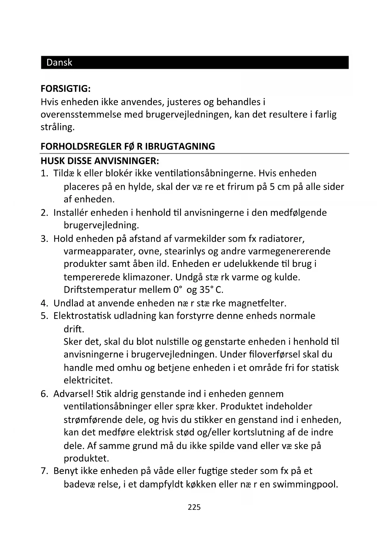varmeapparater, ovne, stearinlys og andre varmegenererende produkter samt åben ild. Enheden er udelukkende til brug i tempererede klimazoner. Undgå stæ rk varme og kulde. Driftstemperatur mellem 0° og 35°C.