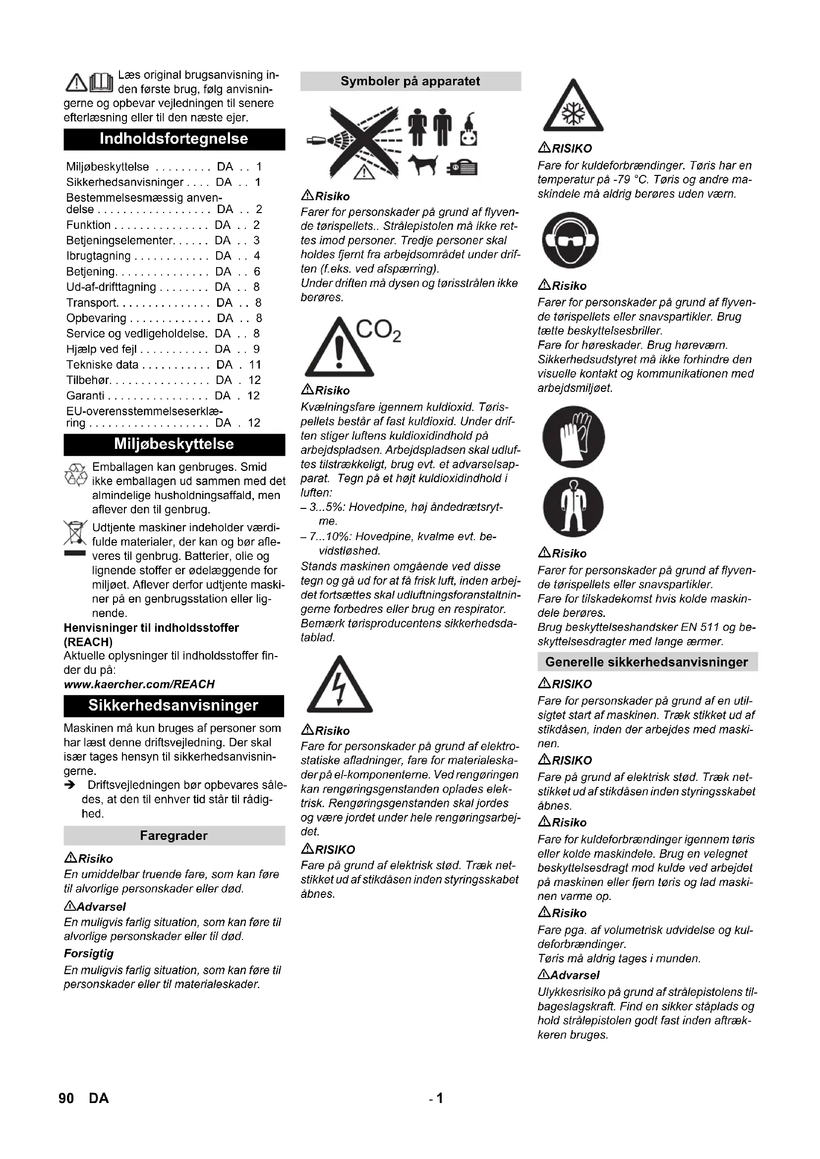 Produto: Aparelho de jacto para gelo seco Tipo: 1.574-xxx Respectivas Directrizes da UE 2011/65/EU 2006/42/CE (+2009/127/CE) 2014/30/UE 2009/125/EG + 2009/1781 Normas harmonizadas aplicadas EN 55014–1: 2017 + A11: 2020 EN 55014–2: 2015 EN 60204–1 EN 61000–3–2: 2014 EN 61000–3–3: 2013 EN IEC 63000: 2018 EN 62233: 2008 Normas nacionais aplicadas GS-STE-13 (em apoio) Chairman of the Board of Management Director Regulatory Affairs & Certification 89PT- 1 Læs original brugsanvisning in- den første brug, følg anvisnin- gerne og opbevar vejledningen til senere efterlæsning eller til den næste ejer. Emballagen kan genbruges. Smid ikke emballagen ud sammen med det almindelige husholdningsaffald, men aflever den til genbrug. Udtjente maskiner indeholder værdi- fulde materialer, der kan og bør afle- veres til genbrug. Batterier, olie og lignende stoffer er ødelæggende for miljøet. Aflever derfor udtjente maski- ner på en genbrugsstation eller lig- nende. Henvisninger til indholdsstoffer (REACH) Aktuelle oplysninger til indholdsstoffer fin- der du på: www.kaercher.com/REACH Maskinen må kun bruges af personer som har læst denne driftsvejledning. Der skal især tages hensyn til sikkerhedsanvisnin- gerne. Driftsvejledningen bør opbevares såle- des, at den til enhver tid står til rådig- hed. Risiko En umiddelbar truende fare, som kan føre til alvorlige personskader eller død. 몇 Advarsel En muligvis farlig situation, som kan føre til alvorlige personskader eller til død. Forsigtig En muligvis farlig situation, som kan føre til personskader eller til materialeskader. Risiko Farer for personskader på grund af flyven- de tørispellets.. Strålepistolen må ikke ret- tes imod personer. Tredje personer skal holdes fjernt fra arbejdsområdet under drif- ten (f.eks. ved afspærring). Under driften må dysen og tørisstrålen ikke berøres. Risiko Kvælningsfare igennem kuldioxid. Tøris- pellets består af fast kuldioxid. Under drif- ten stiger luftens kuldioxidindhold på arbejdspladsen. Arbejdspladsen skal udluf- tes tilstrækkeligt, brug evt. et advarselsap- parat. Tegn på et højt kuldioxidindhold i luften: – 3...5%: Hovedpine, høj åndedrætsryt- me. – 7...10%: Hovedpine, kvalme evt. be- vidstløshed. Stands maskinen omgående ved disse tegn og gå ud for at få frisk luft, inden arbej- det fortsættes skal udluftningsforanstaltnin- gerne forbedres eller brug en respirator. Bemærk tørisproducentens sikkerhedsda- tablad. Risiko Fare for personskader på grund af elektro- statiske afladninger, fare for materialeska- der på el-komponenterne. Ved rengøringen kan rengøringsgenstanden oplades elek- trisk. Rengøringsgenstanden skal jordes og være jordet under hele rengøringsarbej- det. RISIKO Fare på grund af elektrisk stød. Træk net- stikket ud af stikdåsen inden styringsskabet åbnes. RISIKO Fare for kuldeforbrændinger. Tøris har en temperatur på -79 °C. Tøris og andre ma- skindele må aldrig berøres uden værn. Risiko Farer for personskader på grund af flyven- de tørispellets eller snavspartikler. Brug tætte beskyttelsesbriller. Fare for høreskader. Brug høreværn. Sikkerhedsudstyret må ikke forhindre den visuelle kontakt og kommunikationen med arbejdsmiljøet. Risiko Farer for personskader på grund af flyven- de tørispellets eller snavspartikler. Fare for tilskadekomst hvis kolde maskin- dele berøres. Brug beskyttelseshandsker EN 511 og be- skyttelsesdragter med lange ærmer. RISIKO Fare for personskader på grund af en util- sigtet start af maskinen. Træk stikket ud af stikdåsen, inden der arbejdes med maski- nen. RISIKO Fare på grund af elektrisk stød. Træk net- stikket ud af stikdåsen inden styringsskabet åbnes. Risiko Fare for kuldeforbrændinger igennem tøris eller kolde maskindele. Brug en velegnet beskyttelsesdragt mod kulde ved arbejdet på maskinen eller fjern tøris og lad maski- nen varme op. Risiko Fare pga. af volumetrisk udvidelse og kul- deforbrændinger. Tøris må aldrig tages i munden. 몇 Advarsel Ulykkesrisiko på grund af strålepistolens til- bageslagskraft. Find en sikker ståplads og hold strålepistolen godt fast inden aftræk- keren bruges. Indholdsfortegnelse Miljøbeskyttelse . . . . . . . . . DA . . 1 Sikkerhedsanvisninger . . . . DA . . 1 Bestemmelsesmæssig anven- delse . . . . . . . . . . . . . . . . . . DA . . 2 Funktion . . . . . . . . . . . . . . . DA . . 2 Betjeningselementer. . . . . . DA . . 3 Ibrugtagning . . . . . . . . . . . . DA . . 4 Betjening. . . . . . . . . . . . . . . DA . . 6 Ud-af-drifttagning . . . . . . . . DA . . 8 Transport. . . . . . . . . . . . . . . DA . . 8 Opbevaring . . . . . . . . . . . . . DA . . 8 Service og vedligeholdelse. DA . . 8 Hjælp ved fejl . . . . . . . . . . . DA . . 9 Tekniske data . . . . . . . . . . . DA . 11 Tilbehør. . . . . . . . . . . . . . . . DA . 12 Garanti . . . . . . . . . . . . . . . . DA . 12 EU-overensstemmelseserklæ- ring . . . . . . . . . . . . . . . . . . . DA . 12 Miljøbeskyttelse Sikkerhedsanvisninger Faregrader Symboler på apparatet Generelle sikkerhedsanvisninger 90 DA- 2