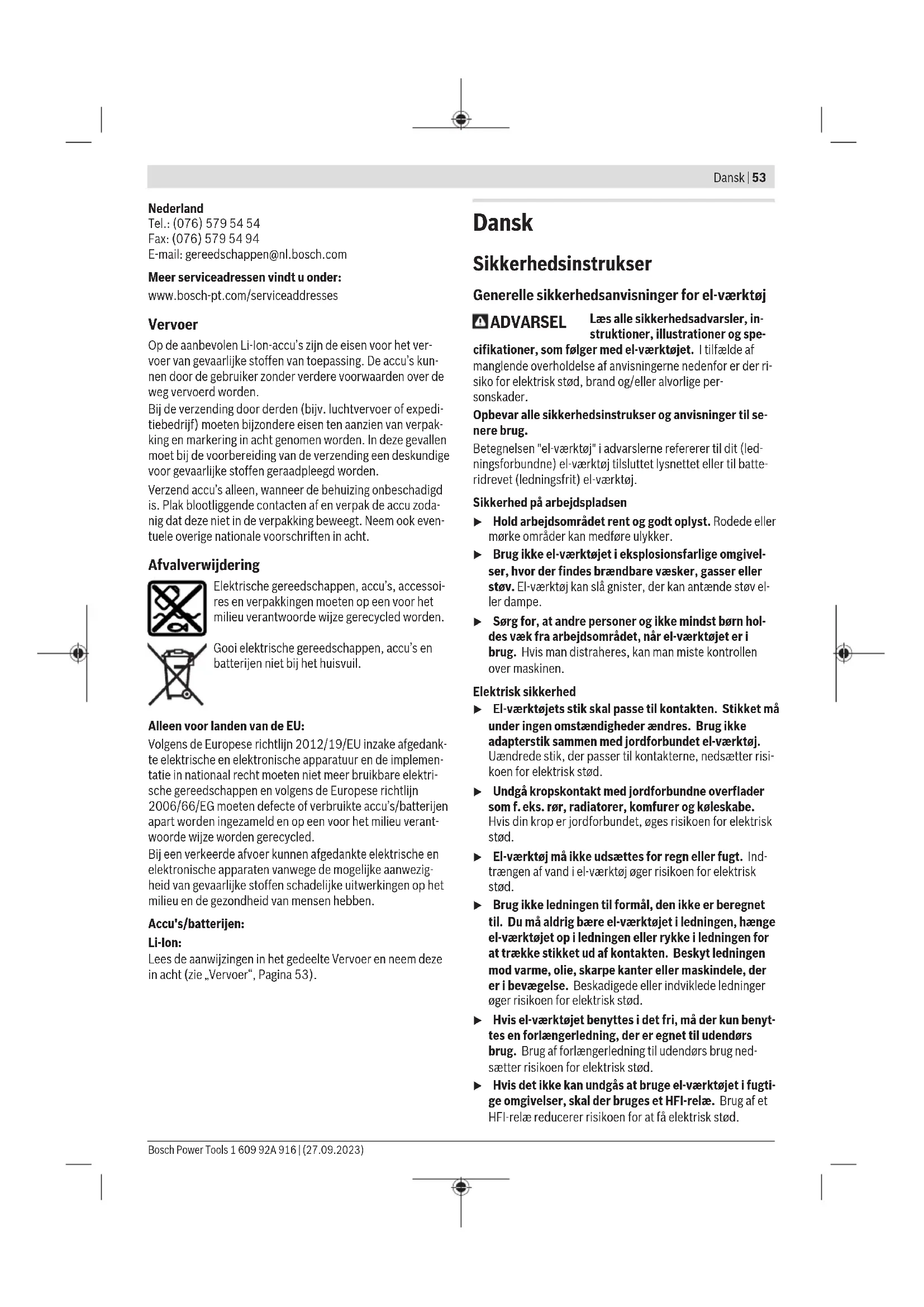Stel de instelring draaimomentinstelling(3) op het gewenste draaimoment in. Voor een maxi- maal draaimoment zet u de instelring modusin- stelling (4) op het symbool "Boren/schroeven MAX". Schroeven en boren Voor het indraaien van grote schroeven en voor het boren zet u de instelring modusinstelling(4) op het symbool "Boren/ schroeven MAX". Klopboren Voor het klopboren in metselwerk zet u de in- stelring modusinstelling(4) op het symbool „Klopboren“. Volautomatische blokkering van de uitgaande as (Auto- Lock) Als de aan/uit-schakelaar (10) niet is ingedrukt, wordt de uitgaande as en dus de gereedschapopname (1) vergren- deld. Hierdoor kunnen schroeven, ook als de accu (7) leeg is, wor- den ingedraaid of kan het elektrische gereedschap ook als schroevendraaier worden gebruikt. Temperatuurafhankelijke beveiliging tegen overbelasting Bij reglementair gebruik kan het elektrische gereedschap niet overbelast worden. Bij een te sterke belasting of het overschrijden van de toegestane accutemperatuur schakelt de elektronica het elektrische gereedschap uit tot dit zich weer in het optimale werktemperatuurbereik bevindt. Aanwijzingen voor werkzaamheden u Plaats het elektrische gereedschap alleen uitgescha- keld op de moer/schroef. Draaiende inzetgereedschap- pen kunnen wegglijden. Na langere tijd werken met een klein toerental moet u het elektrische gereedschap ter afkoeling ca. 3 minuten lang bij maximaal toerental onbelast laten draaien. Onderhoud en service Onderhoud en reiniging u Neem vóór alle werkzaamheden aan het elektrische gereedschap (zoals het uitvoeren van onderhoud of het wisselen van inzetgereedschappen e.d.) en vóór het vervoeren en opbergen altijd de accu uit het elek- trische gereedschap. Bij per ongeluk bedienen van de aan/uit-schakelaar bestaat gevaar voor letsel. u Houd het elektrische gereedschap en de ventilatie- openingen altijd schoon om goed en veilig te werken. Klantenservice en gebruiksadvies Onze klantenservice beantwoordt uw vragen over reparatie en onderhoud van uw product en over vervangingsonderde- len. Explosietekeningen en informatie over vervangingson- derdelen vindt u ook op: www.bosch-pt.com Het Bosch-gebruiksadviesteam helpt u graag bij vragen over onze producten en accessoires. Vermeld bij vragen en bestellingen van vervangingsonderde- len altijd het uit tien cijfers bestaande productnummer vol- gens het typeplaatje van het product. 1 609 92A 916 | (27.09.2023) Bosch Power ToolsDansk | 53 Nederland Tel.: (076) 579 54 54 Fax: (076) 579 54 94 E-mail: gereedschappen@nl.bosch.com Meer serviceadressen vindt u onder: www.bosch-pt.com/serviceaddresses Vervoer Op de aanbevolen Li-Ion-accu’s zijn de eisen voor het ver- voer van gevaarlijke stoffen van toepassing. De accu’s kun- nen door de gebruiker zonder verdere voorwaarden over de weg vervoerd worden. Bij de verzending door derden (bijv. luchtvervoer of expedi- tiebedrijf) moeten bijzondere eisen ten aanzien van verpak- king en markering in acht genomen worden. In deze gevallen moet bij de voorbereiding van de verzending een deskundige voor gevaarlijke stoffen geraadpleegd worden. Verzend accu’s alleen, wanneer de behuizing onbeschadigd is. Plak blootliggende contacten af en verpak de accu zoda- nig dat deze niet in de verpakking beweegt. Neem ook even- tuele overige nationale voorschriften in acht. Afvalverwijdering Elektrische gereedschappen, accu’s, accessoi- res en verpakkingen moeten op een voor het milieu verantwoorde wijze gerecycled worden. Gooi elektrische gereedschappen, accu’s en batterijen niet bij het huisvuil. Alleen voor landen van de EU: Volgens de Europese richtlijn 2012/19/EU inzake afgedank- te elektrische en elektronische apparatuur en de implemen- tatie in nationaal recht moeten niet meer bruikbare elektri- sche gereedschappen en volgens de Europese richtlijn 2006/66/EG moeten defecte of verbruikte accu’s/batterijen apart worden ingezameld en op een voor het milieu verant- woorde wijze worden gerecycled. Bij een verkeerde afvoer kunnen afgedankte elektrische en elektronische apparaten vanwege de mogelijke aanwezig- heid van gevaarlijke stoffen schadelijke uitwerkingen op het milieu en de gezondheid van mensen hebben. Accu's/batterijen: Li-Ion: Lees de aanwijzingen in het gedeelte Vervoer en neem deze in acht (zie „Vervoer“, Pagina53). Dansk Sikkerhedsinstrukser Generelle sikkerhedsanvisninger for el-værktøj ADVARSEL Læs alle sikkerhedsadvarsler, in- struktioner, illustrationer og spe- cifikationer, som følger med el-værktøjet. I tilfælde af manglende overholdelse af anvisningerne nedenfor er der ri- siko for elektrisk stød, brand og/eller alvorlige per- sonskader. Opbevar alle sikkerhedsinstrukser og anvisninger til se- nere brug. Betegnelsen "el-værktøj" i advarslerne refererer til dit (led- ningsforbundne) el-værktøj tilsluttet lysnettet eller til batte- ridrevet (ledningsfrit) el-værktøj. Sikkerhed på arbejdspladsen u Hold arbejdsområdet rent og godt oplyst. Rodede eller mørke områder kan medføre ulykker. u Brug ikke el‑værktøjet i eksplosionsfarlige omgivel- ser, hvor der findes brændbare væsker, gasser eller støv. El‑værktøj kan slå gnister, der kan antænde støv el- ler dampe. u Sørg for, at andre personer og ikke mindst børn hol- des væk fra arbejdsområdet, når el-værktøjet er i brug. Hvis man distraheres, kan man miste kontrollen over maskinen. Elektrisk sikkerhed u El‑værktøjets stik skal passe til kontakten. Stikket må under ingen omstændigheder ændres. Brug ikke adapterstik sammen med jordforbundet el‑værktøj. Uændrede stik, der passer til kontakterne, nedsætter risi- koen for elektrisk stød. u Undgå kropskontakt med jordforbundne overflader som f. eks. rør, radiatorer, komfurer og køleskabe. Hvis din krop er jordforbundet, øges risikoen for elektrisk stød. u El-værktøj må ikke udsættes for regn eller fugt. Ind- trængen af vand i el‑værktøj øger risikoen for elektrisk stød. u Brug ikke ledning