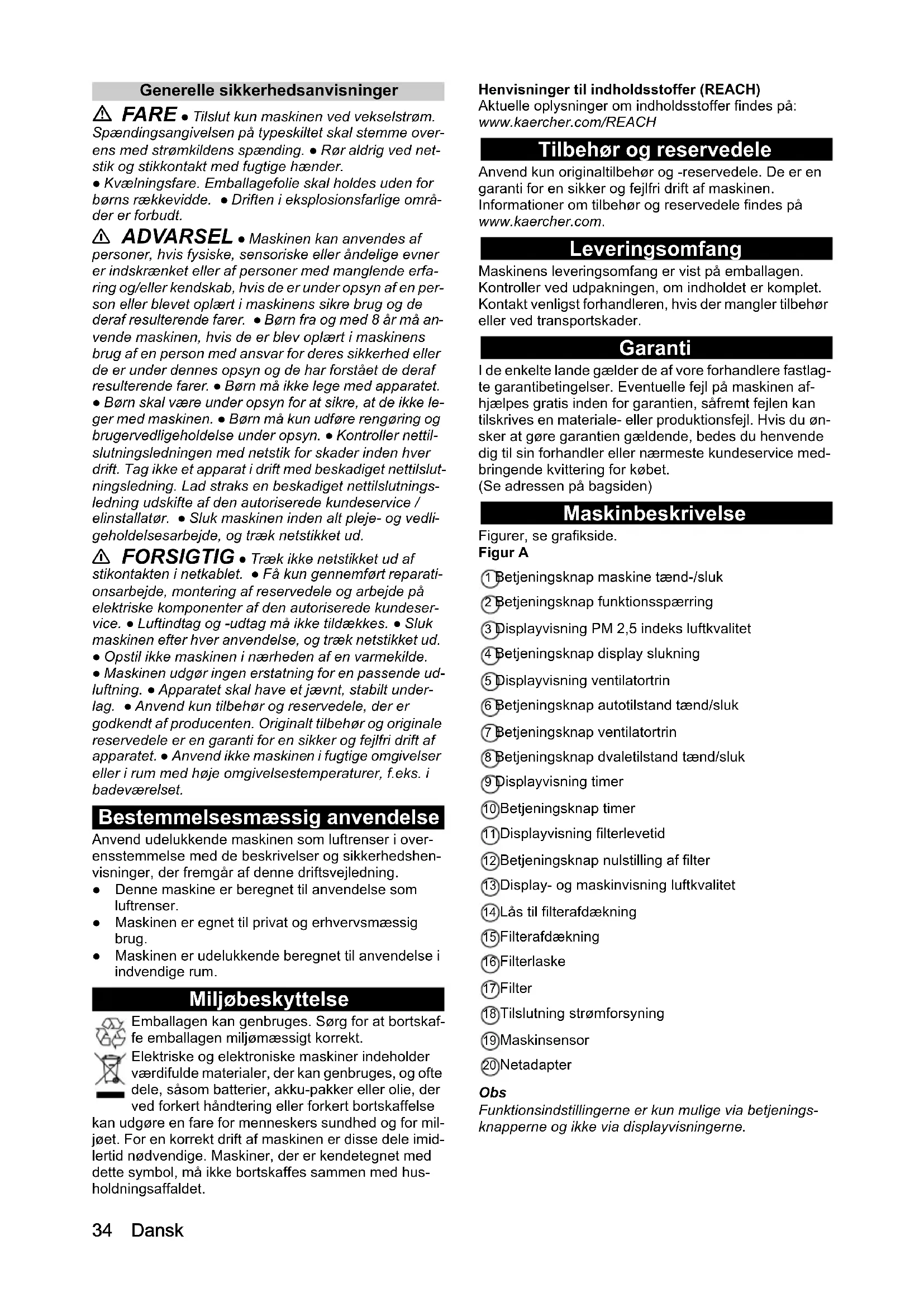 - Tekniske data Dansk Generelle sikkerhedsanvisninger FARE ● Tilslut kun maskinen ved vekselstrøm. Spændingsangivelsen på typeskiltet skal stemme over- ens med strømkildens spænding. ● Rør aldrig ved net- stik og stikkontakt med fugtige hænder. ● Kvælningsfare. Emballagefolie skal holdes uden for børns rækkevidde. ● Driften i eksplosionsfarlige områ- der er forbudt. 몇 ADVARSEL ● Maskinen kan anvendes af personer, hvis fysiske, sensoriske eller åndelige evner er indskrænket eller af personer med manglende erfa- ring og/eller kendskab, hvis de er under opsyn af en per- son eller blevet oplært i maskinens sikre brug og de deraf resulterende farer. ● Børn fra og med 8 år må an- vende maskinen, hvis de er blev oplært i maskinens brug af en person med ansvar for deres sikkerhed eller de er under dennes opsyn og de har forstået de deraf resulterende farer. ● Børn må ikke lege med apparatet. ● Børn skal være under opsyn for at sikre, at de ikke le- ger med maskinen. ● Børn må kun udføre rengøring og brugervedligeholdelse under opsyn. ● Kontroller nettil- slutningsledningen med netstik for skader inden hver drift. Tag ikke et apparat i drift med beskadiget nettilslut- ningsledning. Lad straks en beskadiget nettilslutnings- ledning udskifte af den autoriserede kundeservice / elinstallatør. ● Sluk maskinen inden alt pleje- og vedli- geholdelsesarbejde, og træk netstikket ud. 몇 FORSIGTIG ● Træk ikke netstikket ud af stikontakten i netkablet. ● Få kun gennemført reparati- onsarbejde, montering af reservedele og arbejde på elektriske komponenter af den autoriserede kundeser- vice. ● Luftindtag og -udtag må ikke tildækkes. ● Sluk maskinen efter hver anvendelse, og træk netstikket ud. ● Opstil ikke maskinen i nærheden af en varmekilde. ● Maskinen udgør ingen erstatning for en passende ud- luftning. ● Apparatet skal have et jævnt, stabilt under- lag. ● Anvend kun tilbehør og reservedele, der er godkendt af producenten. Originalt tilbehør og originale reservedele er en garanti for en sikker og fejlfri drift af apparatet. ● Anvend ikke maskinen i fugtige omgivelser eller i rum med høje omgivelsestemperaturer, f.eks. i badeværelset. Bestemmelsesmæssig anvendelse Anvend udelukkende maskinen som luftrenser i over- ensstemmelse med de beskrivelser og sikkerhedshen- visninger, der fremgår af denne driftsvejledning. ● Denne maskine er beregnet til anvendelse som luftrenser. ● Maskinen er egnet til privat og erhvervsmæssig brug. ● Maskinen er udelukkende beregnet til anvendelse i indvendige rum. Miljøbeskyttelse Emballagen kan genbruges. Sørg for at bortskaf- fe emballagen miljømæssigt korrekt. Elektriske og elektroniske maskiner indeholder værdifulde materialer, der kan genbruges, og ofte dele, såsom batterier, akku-pakker eller olie, der ved forkert håndtering eller forkert bortskaffelse kan udgøre en fare for menneskers sundhed og for mil- jøet. For en korrekt drift af maskinen er disse dele imid- lertid nødvendige. Maskiner, der er kendetegnet med dette symbol, må ikke bortskaffes sammen med hus- holdningsaffaldet. Henvisninger til indholdsstoffer (REACH) Aktuelle oplysninger om indholdsstoffer findes på: www.kaercher.com/REACH Tilbehør og reservedele Anvend kun originaltilbehør og -reservedele. De er en garanti for en sikker og fejlfri drift af maskinen. Informationer om tilbehør og reservedele findes på www.kaercher.com. Leveringsomfang Maskinens leveringsomfang er vist på emballagen. Kontroller ved udpakningen, om indholdet er komplet. Kontakt venligst forhandleren, hvis der mangler tilbehør eller ved transportskader. Garanti I de enkelte lande gælder de af vore forhandlere fastlag- te garantibetingelser. Eventuelle fejl på maskinen af- hjælpes gratis inden for garantien, såfremt fejlen kan tilskrives en materiale- eller produktionsfejl. Hvis du øn- sker at gøre garantien gældende, bedes du henvende dig til sin forhandler eller nærmeste kundeservice med- bringende kvittering for købet. (Se adressen på bagsiden) Maskinbeskrivelse Figurer, se grafikside. Figur A 1 Betjeningsknap maskine tænd-/sluk 2 Betjeningsknap funktionsspærring 3 Displayvisning PM 2,5 indeks luftkvalitet 4 Betjeningsknap display slukning 5 Displayvisning ventilatortrin 6 Betjeningsknap autotilstand tænd/sluk 7 Betjeningsknap ventilatortrin 8 Betjeningsknap dvaletilstand tænd/sluk 9 Displayvisning timer 10 Betjeningsknap timer 11 Displayvisning filterlevetid 12 Betjeningsknap nulstilling af filter 13 Display- og maskinvisning luftkvalitet 14 Lås til filterafdækning 15 Filterafdækning 16 Filterlaske 17 Filter 18 Tilslutning strømforsyning 19 Maskinsensor 20 Netadapter Obs Funktionsindstillingerne er kun mulige via betjenings- knapperne og ikke via displayvisningerne.Dansk 35 Montering af filteret Før første ibrugtagning skal finfiltrene, der allerede er indsat i maskinen, pakkes ud. p. 3734