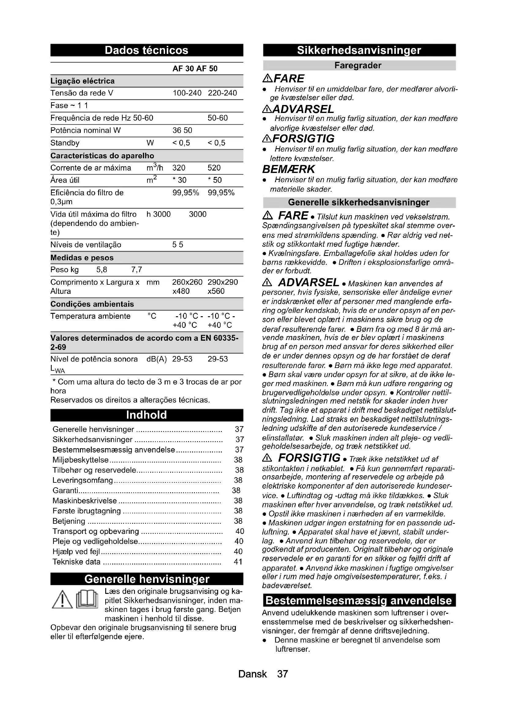 • Com uma altura do tecto de 3 m e 3 trocas de ar por hora Reservados os direitos a alterações técnicas. Indhold Generelle henvisninger Læs den originale brugsanvising og ka- pitlet Sikkerhedsanvisninger, inden ma- skinen tages i brug første gang. Betjen maskinen i henhold til disse. Opbevar den originale brugsanvisning til senere brug eller til efterfølgende ejere. Sikkerhedsanvisninger Faregrader FARE ● Henviser til en umiddelbar fare, der medfører alvorli- ge kvæstelser eller død. 몇 ADVARSEL ● Henviser til en mulig farlig situation, der kan medføre alvorlige kvæstelser eller død. 몇 FORSIGTIG ● Henviser til en mulig farlig situation, der kan medføre lettere kvæstelser. BEMÆRK ● Henviser til en mulig farlig situation, der kan medføre materielle skader. Generelle sikkerhedsanvisninger FARE ● Tilslut kun maskinen ved vekselstrøm. Spændingsangivelsen på typeskiltet skal stemme over- ens med strømkildens spænding. ● Rør aldrig ved net- stik og stikkontakt med fugtige hænder. ● Kvælningsfare. Emballagefolie skal holdes uden for børns rækkevidde. ● Driften i eksplosionsfarlige områ- der er forbudt. 몇 ADVARSEL ● Maskinen kan anvendes af personer, hvis fysiske, sensoriske eller åndelige evner er indskrænket eller af personer med manglende erfa- ring og/eller kendskab, hvis de er under opsyn af en per- son eller blevet oplært i maskinens sikre brug og de deraf resulterende farer. ● Børn fra og med 8 år må an- vende maskinen, hvis de er blev oplært i maskinens brug af en person med ansvar for deres sikkerhed eller de er under dennes opsyn og de har forstået de deraf resulterende farer. ● Børn må ikke lege med apparatet. ● Børn skal være under opsyn for at sikre, at de ikke le- ger med maskinen. ● Børn må kun udføre rengøring og brugervedligeholdelse under opsyn. ● Kontroller nettil- slutningsledningen med netstik for skader inden hver drift. Tag ikke et apparat i drift med beskadiget nettilslut- ningsledning. Lad straks en beskadiget nettilslutnings- ledning udskifte af den autoriserede kundeservice / elinstallatør. ● Sluk maskinen inden alt pleje- og vedli- geholdelsesarbejde, og træk netstikket ud. 몇 FORSIGTIG ● Træk ikke netstikket ud af stikontakten i netkablet. ● Få kun gennemført reparati- onsarbejde, montering af reservedele og arbejde på elektriske komponenter af den autoriserede kundeser- vice. ● Luftindtag og -udtag må ikke tildækkes. ● Sluk maskinen efter hver anvendelse, og træk netstikket ud. ● Opstil ikke maskinen i nærheden af en varmekilde. ● Maskinen udgør ingen erstatning for en passende ud- luftning. ● Apparatet skal have et jævnt, stabilt under- lag. ● Anvend kun tilbehør og reservedele, der er godkendt af producenten. Originalt tilbehør og originale reservedele er en garanti for en sikker og fejlfri drift af apparatet. ● Anvend ikke maskinen i fugtige omgivelser eller i rum med høje omgivelsestemperaturer, f.eks. i badeværelset. Bestemmelsesmæssig anvendelse Anvend udelukkende maskinen som luftrenser i over- ensstemmelse med de beskrivelser og sikkerhedshen- visninger, der fremgår af denne driftsvejledning. ● Denne maskine er beregnet til anvendelse som luftrenser. AF 30 AF 50 Ligação eléctrica Tensão da rede V 100-240 220-240 Fase ~ 1 1 Frequência de rede Hz 50-60 50-60 Potência nominal W