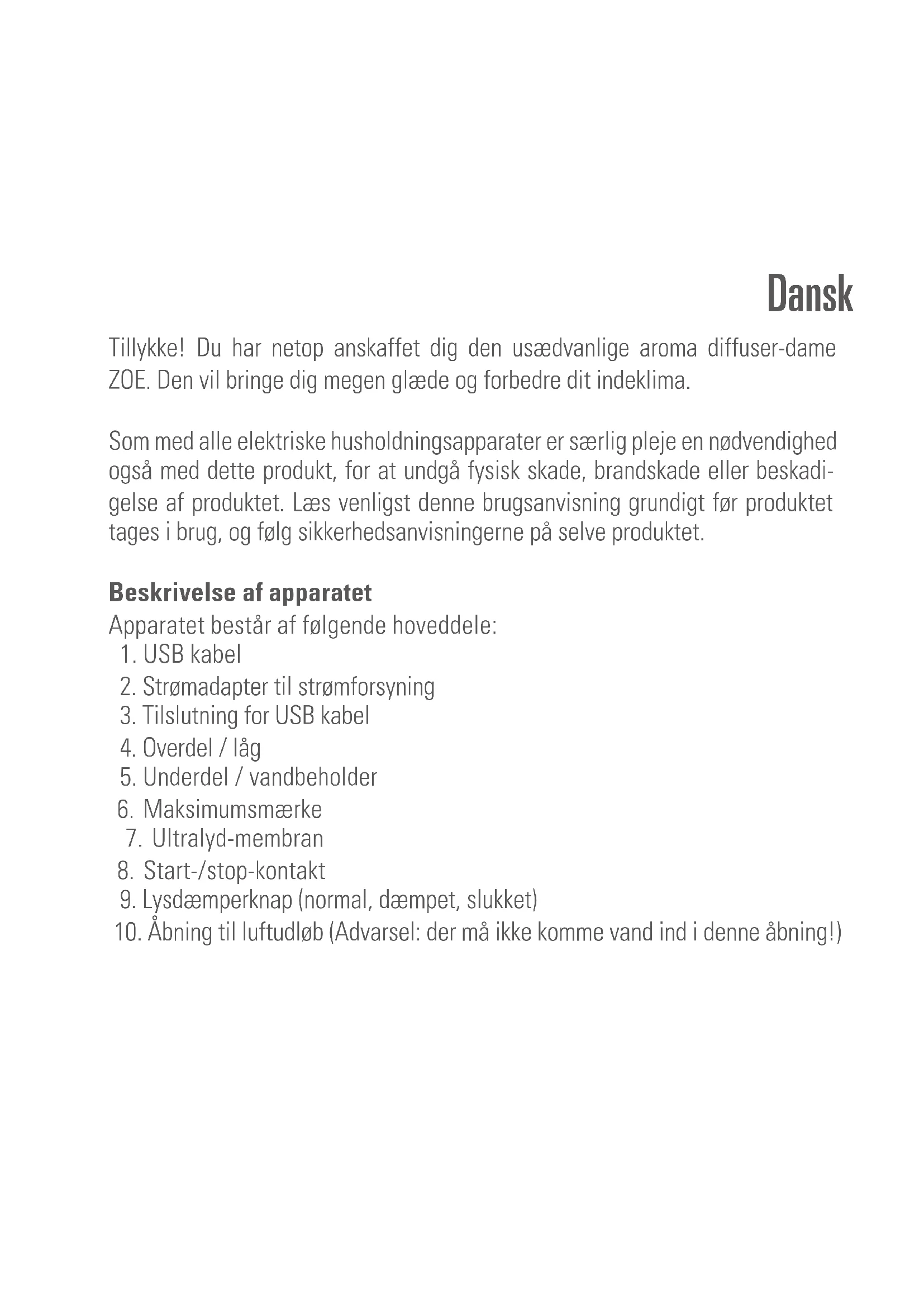 - I tilfælde af en reparation skal der tages højde for følgende, før apparatet sendes afsted eller afleveres hos forhandleren: Tøm alt vandet ud af appara- tet (vandbakken resp. vandbeholderen) og lad apparatet tørre fuldstændig ud.Hvis der er vandrester i apparatet under transporten, bliver apparatet beska- diget. I det tilfælde bortfalder garantien. Bortskaffelse EU-direktiv 2012 / 19 / CE om WEEE kræver, at brugte elektriske husholdnings- apparater ikke bortskaffes sammen med almindeligt affald. Brugte apparater skal indsamles separat for optimal genbrug og genanvendelse af apparatets elementer og reduktion af miljøpåvirkning og helbredsrisici. Symbolet med skraldespanden med et kryds over på produktet er en påmindelse til dig om din forpligtelse til at bortskaffe apparatet separat. Du bør kon- takte de lokale myndigheder eller forhandleren for at få oplysninger om korrekt bortskafning af brugte apparater. Specifikationer Mærkespænding DC 5 V Mærkeeffekt 5 W Mål 113 x 105 mm (diameter x højde) Vægt 0.3 kg Tankindhold 80 ml Støjniveau < 27 dB(A) I overensstemmelse med EU godkendelse CE / WEEE / RoHS / EAC Der tages forbehold for tekniske ændringerSuomi Onnittelut! Olet juuri ostanut poikkeuksellisen ZOE-aromidiffuusorin. Se tulee tuottamaan sinulle paljon iloa ja huoneilmasi parantuu. Kuten kaikissa sähkökäyttöisissä kotitalouslaitteissa myös tämän laitteen käytössä vaaditaan erityistä tarkkaavaisuutta, jotta vältettäisiin loukkaan- tumiset, palo- ja laitevauriot. Tutustu tähän käyttöohjeeseen ennen laitteen käyttöönottoa ja noudata laitteella olevia turvallisuusohjeita. Laitekuvaus Laite koostuu seuraavista komponenteista: