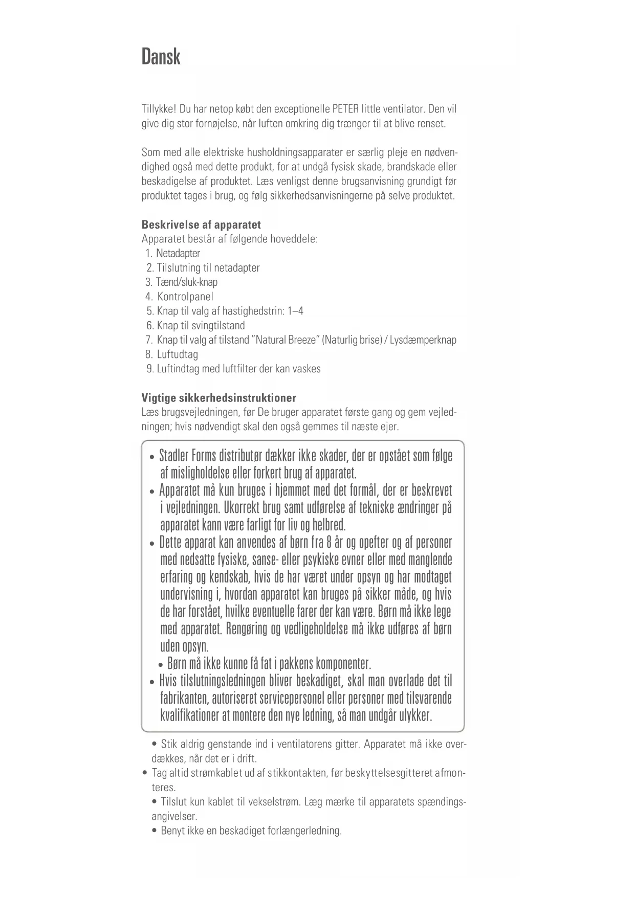 - Stadler Forms distributør dækker ikke skader, der er opstået som følge af misligholdelse eller forkert brug af apparatet.