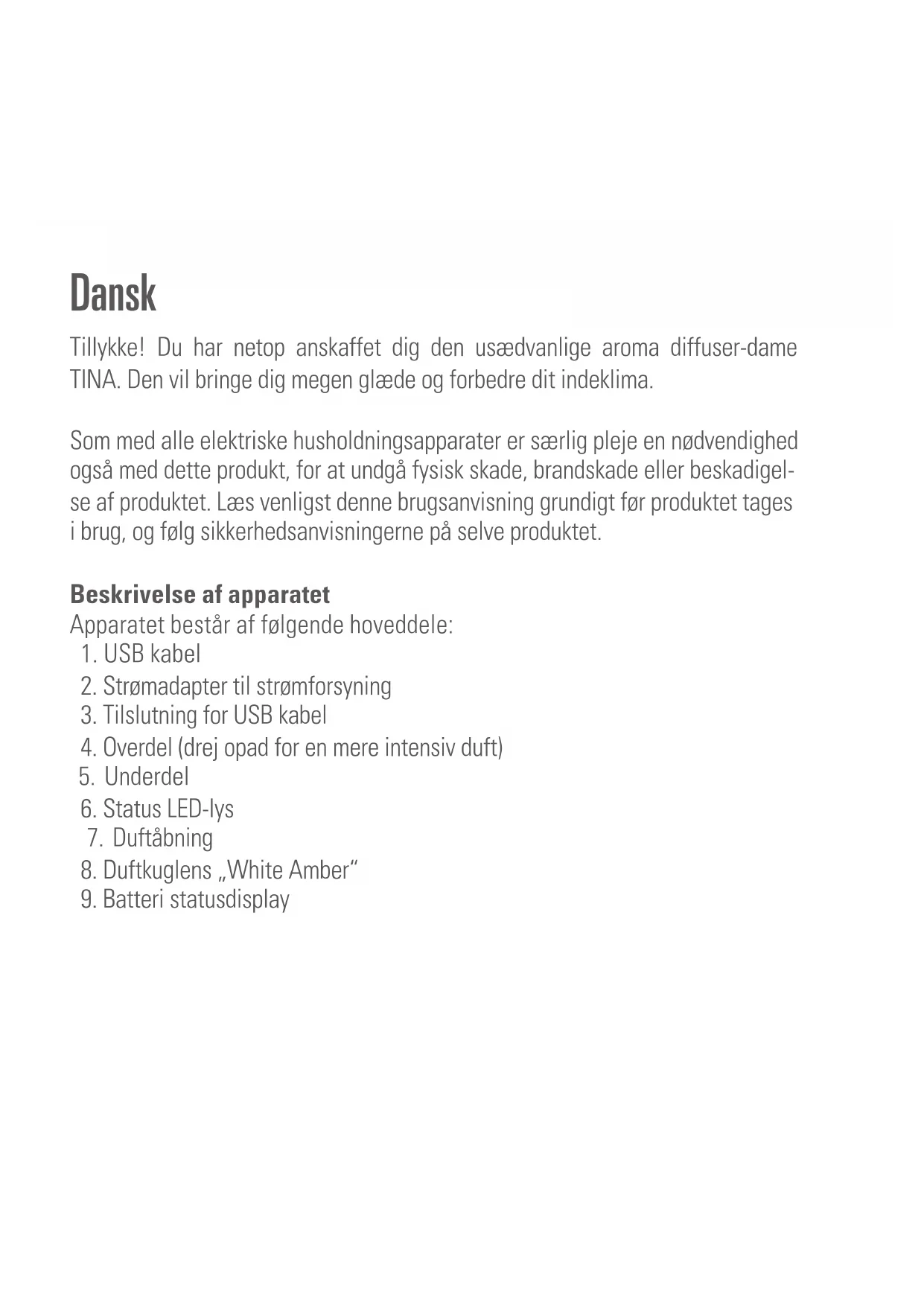 Din aroma diffuser fungerer efter det naturlige fordampningprincip. En ventilator blæser luft hen over duftkuglens små kugler, der er fyldt med duftolie, og afgiver dermed duften til luften i rummet. Vigtige sikkerhedsinstruktioner Læs brugsvejledningen, før De bruger apparatet første gang og gem vejlednin- gen; hvis nødvendigt skal den også gemmes til næste ejer