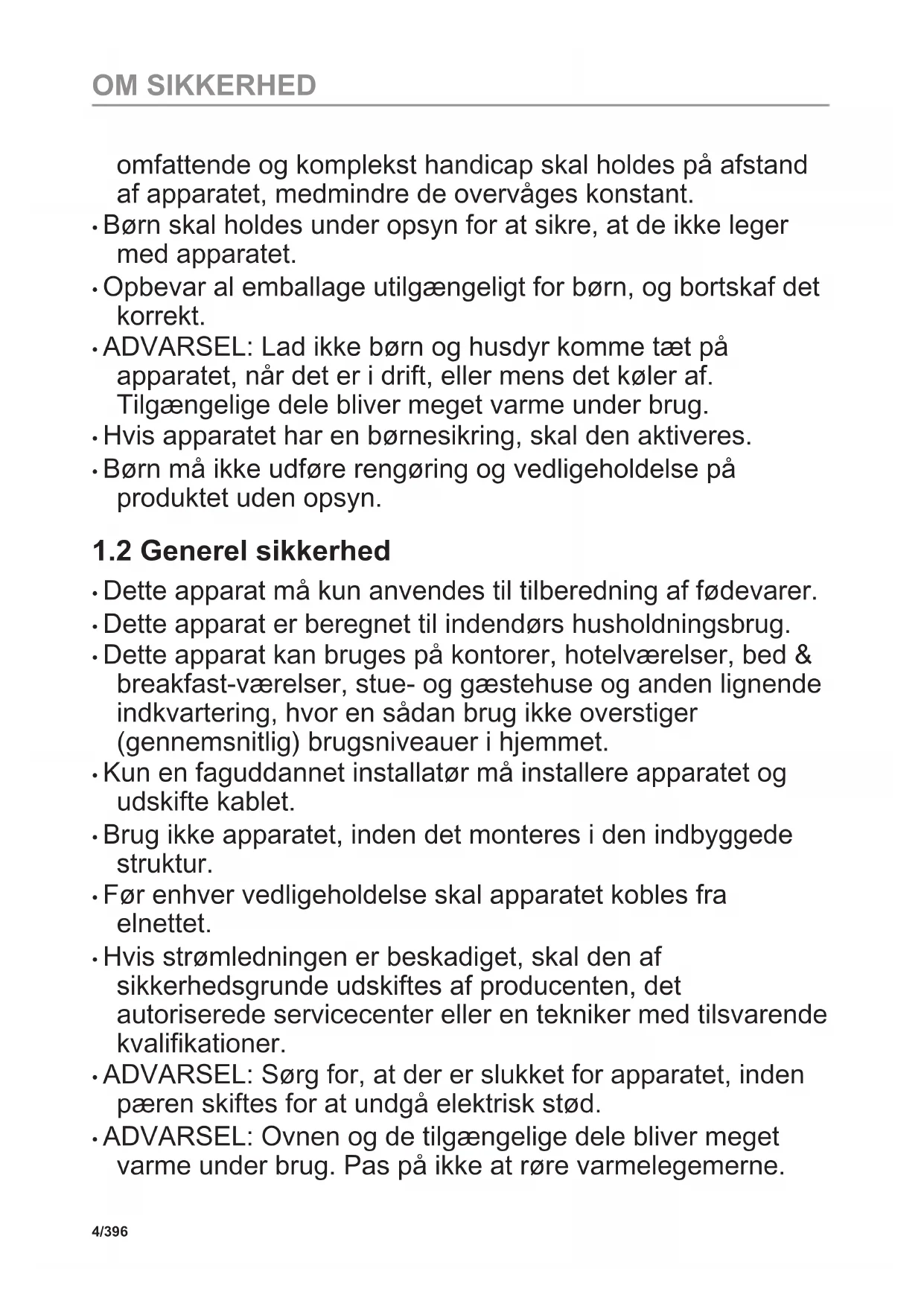 - Apparatet må kun bruges af børn fra 8 år og opefter samt af personer med nedsat fysisk, sensorisk eller psykisk funktionsevne, eller som mangler den nødvendige erfaring eller viden, hvis de er under opsyn eller er blevet instrueret i at bruge apparatet på en sikker måde samt forstår de farer, det indebærer. Børn under 8 år og personer med 3/396 OM SIKKERHEDomfattende og komplekst handicap skal holdes på afstand af apparatet, medmindre de overvåges konstant.