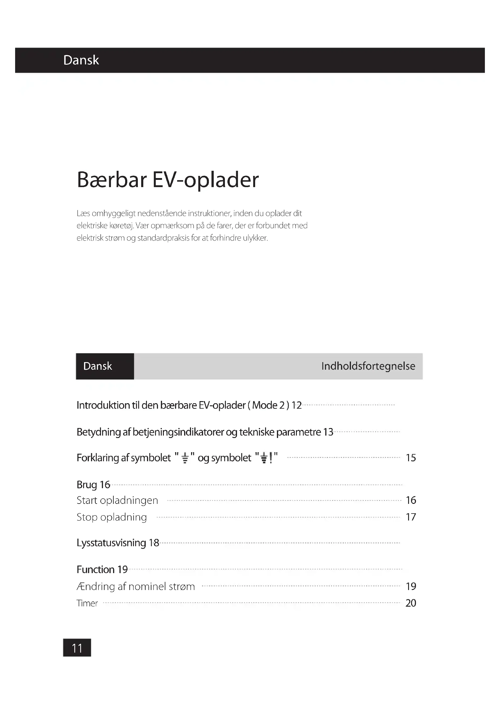 Timer Brug 16 Function 19 Dansk Dansk Bærbar EV-oplader Læs omhyggeligt nedenstående instruktioner, inden du oplader dit elektriske køretøj. Vær opmærksom på de farer, der er forbundet med elektrisk strøm og standardpraksis for at forhindre ulykker. IndholdsfortegnelseIntroduktion til den bærbare EV-oplader ( Mode 2 ) FORSIGTIG