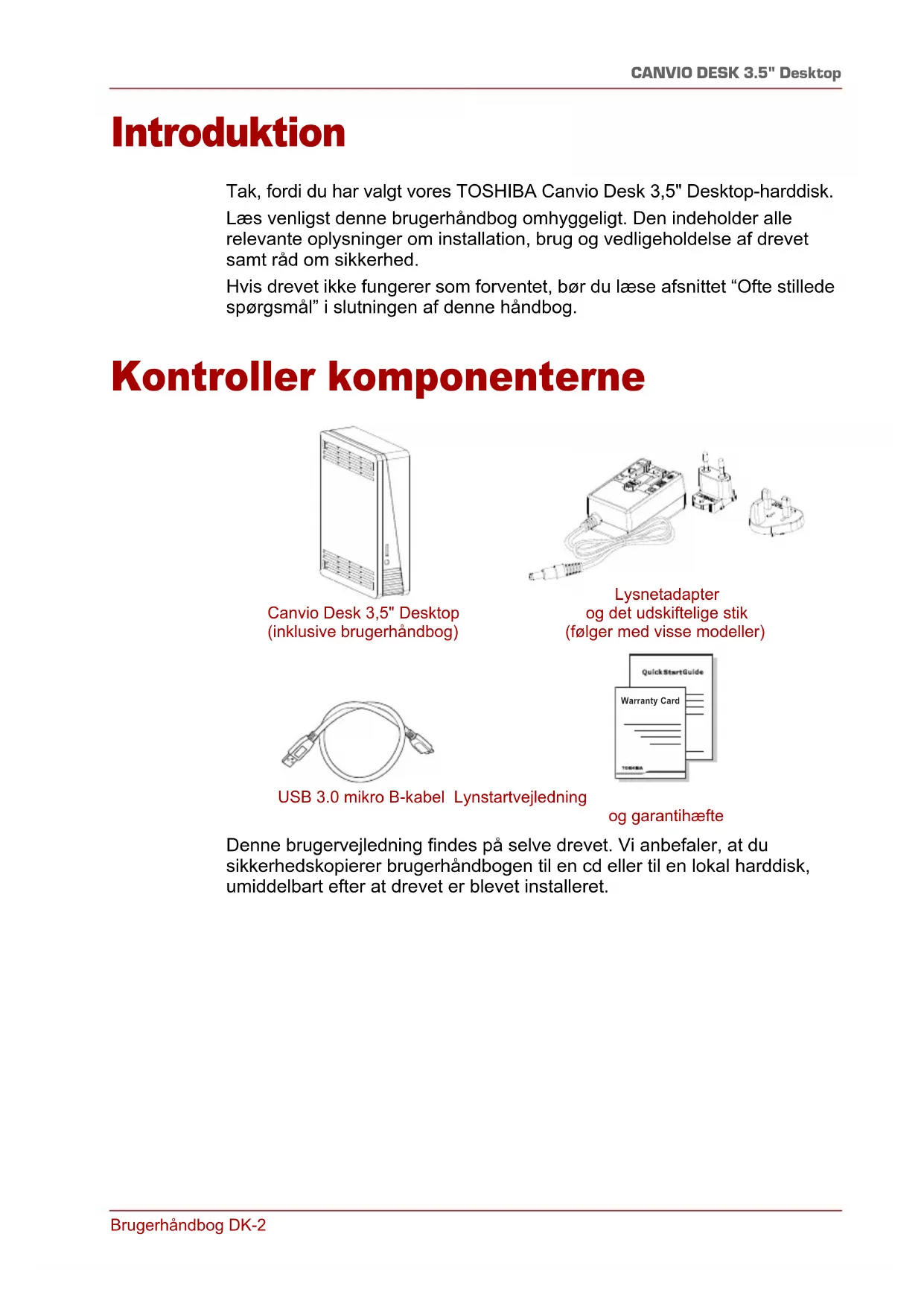 Rengøring af drevkabinettet Inden du rengør drevet, skal du sørge for, at det er koblet fysisk fra computeren. Vi anbefaler, at du bruger standardprodukter til at rengøre det og at du sørger for, at eventuel tilbageværende væske bliver tørret af. Yderligere råd Hvis du har brug for oplysninger om andre almindelige opgaver som f.eks. omdøbning af drevet, sikkerhedskopiering af data eller filhåndtering, anbefaler vi, at du læser brugerhåndbogen til din computers operativsystem. Hvis du har brug for oplysninger om vedligeholdelsesopgaver som f.eks. defragmentering og optimering, anbefaler vi, at du læser i brugerhåndbogen til dit operativsystem. Vi anbefaler også kraftigt, at du sørge for at have antivirussoftware installeret for at beskytte dine data mod at blive beskadiget af virus eller trojanske heste. Ofte stillede spørgsmål Sp.: Skal jeg formatere drevet efter installationen? Sv.: Producenten har på forhånd formateret med NTFS-filsystemet. Ved anvendelse med MS Windows/pc kræves der ingen yderligere formatering. For at sikre fuld kompatibilitet med Apple Mac-operativsystemer skal drevet omformateres til filsystemet HFS+. Du kan finde vejledning i brugerhåndbogen til din Mac.Brugerhåndbog DK-7 CANVIO DESK 3.5" Desktop Sp.: Skal jeg bruge USB-drivere til Windows Vista, Windows 7, 8, 8.1? Sv.: Nej, de findes allerede i dit operativsystem. Sp.: Kan jeg starte mit system fra drevet? Sv.: Nej. Windows understøtter ikke start fra eksterne harddiske. Sp.: Hvorfor har drevet ikke brug for en blæser? Sv.: Drevene er designet til at have en optimal varmeafledning, og der kræves derfor ingen blæser. Dette betyder, at drevet er næsten lydløst. Sp.: Hvorfor vises drevets kapacitet i Windows som lavere end den kapacitet, der ellers er angivet for drevet? Sv.: Denne forskel skyldes, at der anvendes forskellige metoder til at beregne kapaciteten. Harddiskproducenter bruger 10-talssystemet, mens operativsystemet bruger det binære talsystem. Eksempel på brug af 10-talssystemet: 1 GB = 1.000 MB = 1.000.000 KB = 1.000.000.000 byte Eksempel på brug af det binære talsystem: 1 GB = 1.024 MB = 1.048.576 KB = 1.073.741.824 byte Dette betyder, at en harddisk på 120 GB (i 10-talssystemet) i Windows ser ud til kun at være på 112 GB (i det binære talsystem). Sp.: Kan jeg bruge drevet til at kopiere et operativsystem fra én computer til en anden? Sv.: Nej. Du skal følge operativsystemleverandørens installationsvejledning. En simpel kopi vil ikke fungere. Sp.: Tilbyder Toshiba en datagendannelsesservice? Sv.: Ja, Toshiba tilbyder en datagendannelsesservice for eksterne harddiske. Tjek vores websted på www.toshiba-europe.com/services for at få flere oplysninger om denne service. Når en harddisk formateres, slettes alle data, som er gemt på det. Vi anbefaler, at du laver en sikkerhedskopi, inden du går videre med formateringsprocessen. BEMÆRKBrugerhåndbog DK-8 CANVIO DESK 3.5" Desktop Fejlfinding Min computer finder slet ikke harddisken. ■ Kontroller, at alle kabler er tilsluttet solidt. ■ Hvis du bruger et udvidelseskort, skal du kontrollere, at det fungerer korrekt og opdatere softwaren/firmwaren. Er det farligt, hvis drevet føles varmt, mens det arbejder? Sv.: Dette er normalt, og det er derfor ikke farligt. Drevet viser meddelelsen “Enheden kan ikke starte.” Sv.: Der er to mulige årsager. Det kan være et strømproblem, og du skal i så fald kontrollere tilslutningerne. Eller der kan være noget galt med drevet, og drevet kræver i så fald service. Jeg kan se mit drev i “Denne computer”, men det vises ikke i Enhedshåndtering. Sv.: Følg disse instruktioner:
