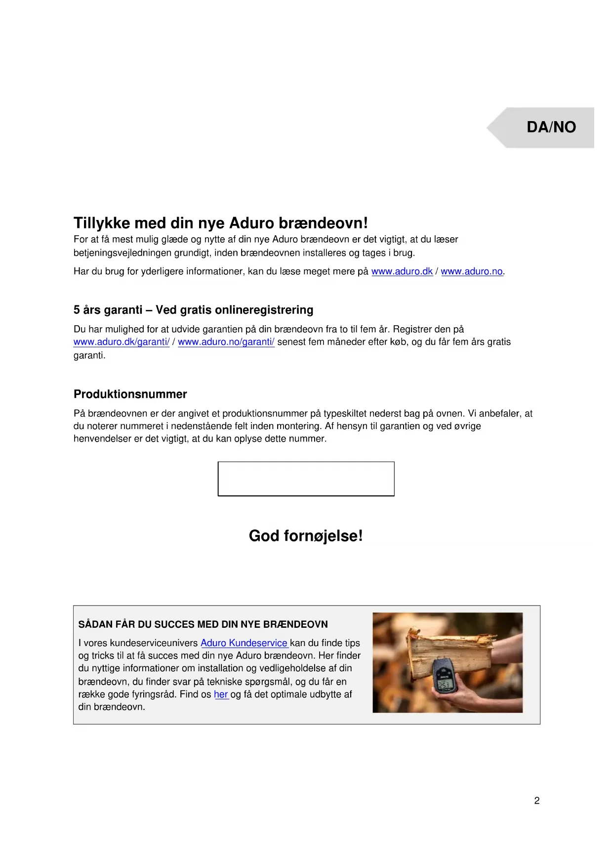 Tillykke med din nye Aduro brændeovn! For at få mest mulig glæde og nytte af din nye Aduro brændeovn er det vigtigt, at du læser betjeningsvejledningen grundigt, inden brændeovnen installeres og tages i brug. Har du brug for yderligere informationer, kan du læse meget mere på www.aduro.dk / www.aduro.no. 5 års garanti – Ved gratis onlineregistrering Du har mulighed for at udvide garantien på din brændeovn fra to til fem år. Registrer den på www.aduro.dk/garanti/ / www.aduro.no/garanti/ senest fem måneder efter køb, og du får fem års gratis garanti. Produktionsnummer På brændeovnen er der angivet et produktionsnummer på typeskiltet nederst bag på ovnen. Vi anbefaler, at du noterer nummeret i nedenstående felt inden montering. Af hensyn til garantien og ved øvrige henvendelser er det vigtigt, at du kan oplyse dette nummer.