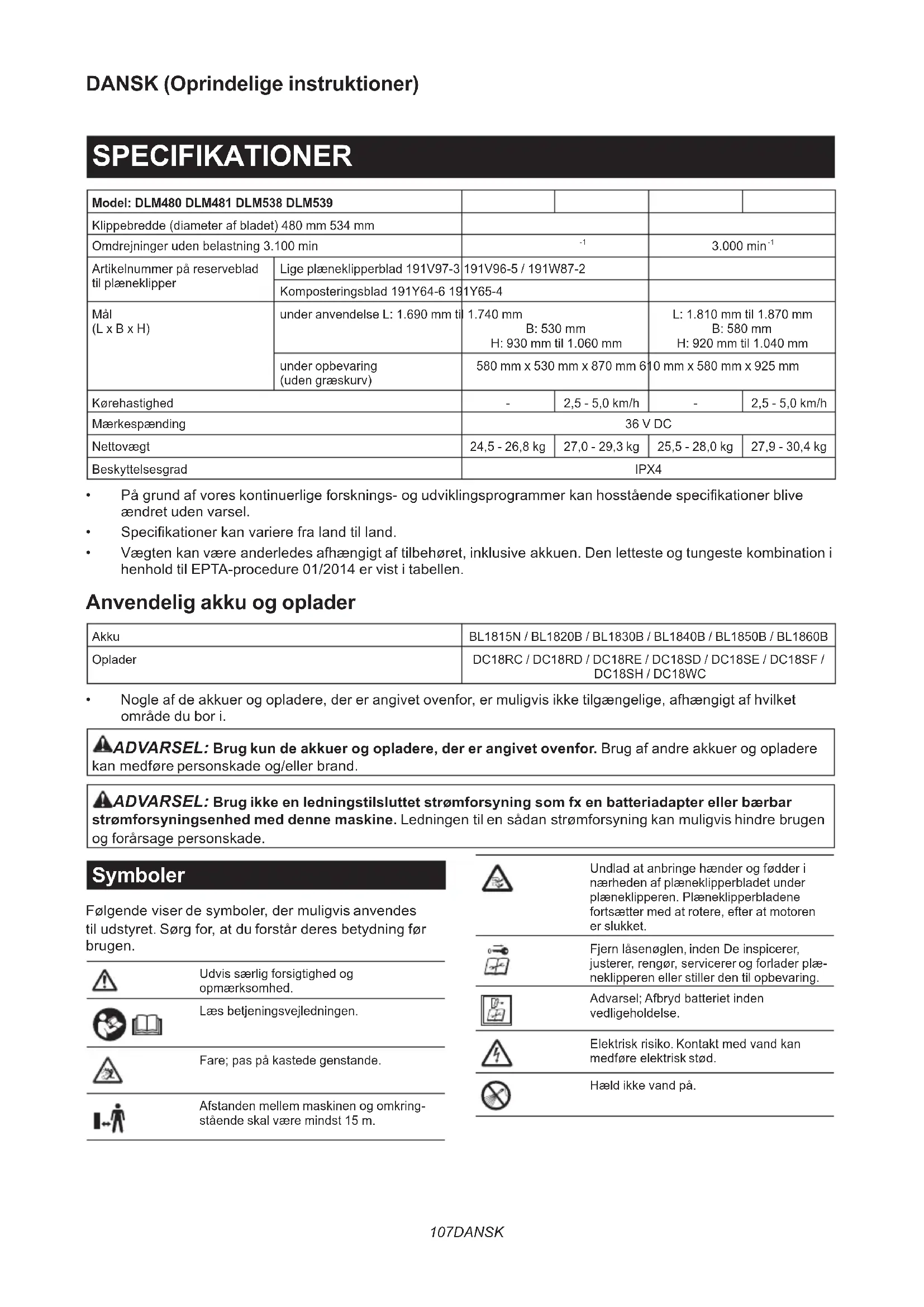- Nogle af de akkuer og opladere, der er angivet ovenfor, er muligvis ikke tilgængelige, afhængigt af hvilket område du bor i. ADVARSEL: Brug kun de akkuer og opladere, der er angivet ovenfor. Brug af andre akkuer og opladere kan medføre personskade og/eller brand. ADVARSEL: Brug ikke en ledningstilsluttet strømforsyning som fx en batteriadapter eller bærbar strømforsyningsenhed med denne maskine. Ledningen til en sådan strømforsyning kan muligvis hindre brugen og forårsage personskade. Symboler Følgende viser de symboler, der muligvis anvendes til udstyret. Sørg for, at du forstår deres betydning før brugen. Udvis særlig forsigtighed og opmærksomhed. Læs betjeningsvejledningen. Fare; pas på kastede genstande. Afstanden mellem maskinen og omkring- stående skal være mindst 15 m. Undlad at anbringe hænder og fødder i nærheden af plæneklipperbladet under plæneklipperen. Plæneklipperbladene fortsætter med at rotere, efter at motoren er slukket. Fjern låsenøglen, inden De inspicerer, justerer, rengør, servicerer og forlader plæ- neklipperen eller stiller den til opbevaring. Advarsel; Afbryd batteriet inden vedligeholdelse. Elektrisk risiko. Kontakt med vand kan medføre elektrisk stød. Hæld ikke vand på.108 DANSK Ni-MH Li-ion Kun for lande inden for EU På grund af tilstedeværelsen af farlige komponenter i udstyret kan aald af elek- trisk og elektronisk udstyr, akkumulatorer og batterier have en negativ indvirkning på miljøet og folkesundheden. Bortskaf ikke elektriske og elektroniske apparater eller batterier sammen med husholdningsaald! I overensstemmelse med EF-direktiv om aaldshåndtering af elektrisk og elektronisk udstyr og om akkumulatorer og batterier og aaldsakkumulatorer og -batterier, og i overensstemmelse med national lovgiv- ning, skal brugt elektrisk udstyr, batterier og akkumulatorer opbevares separat og leveres til et separat indsamlingssted for kommunalt aald, der er etableret i henhold til bestemmelserne om miljøbeskyttelse. Dette er angivet ved symbolet på den krydsede skraldespand, der er placeret på udstyret. Garanteret lydeektniveau i henhold til EU-direktivet om maskiner til udendørs brug. Lydeektniveau i henhold til Australiens NSW forordning om støjemission Tilsigtet anvendelse Maskinen er beregnet til at slå græs. Støj Det typiske A-vægtede støjniveau bestemt i overens- stemmelse med EN60335-2-77: Model DLM480 Lydtryksniveau (L