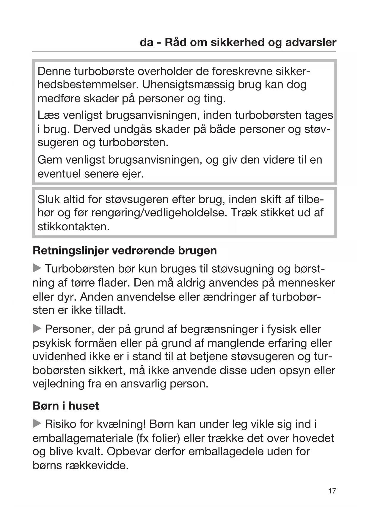 Turbobørsten bør kun bruges til støvsugning og børstning af tørre flader. Den mA aldrig anvendes på mensnesker eller dyr. Anden anvendelse eller ændringer af turbobørsten er ikke tilladt.
