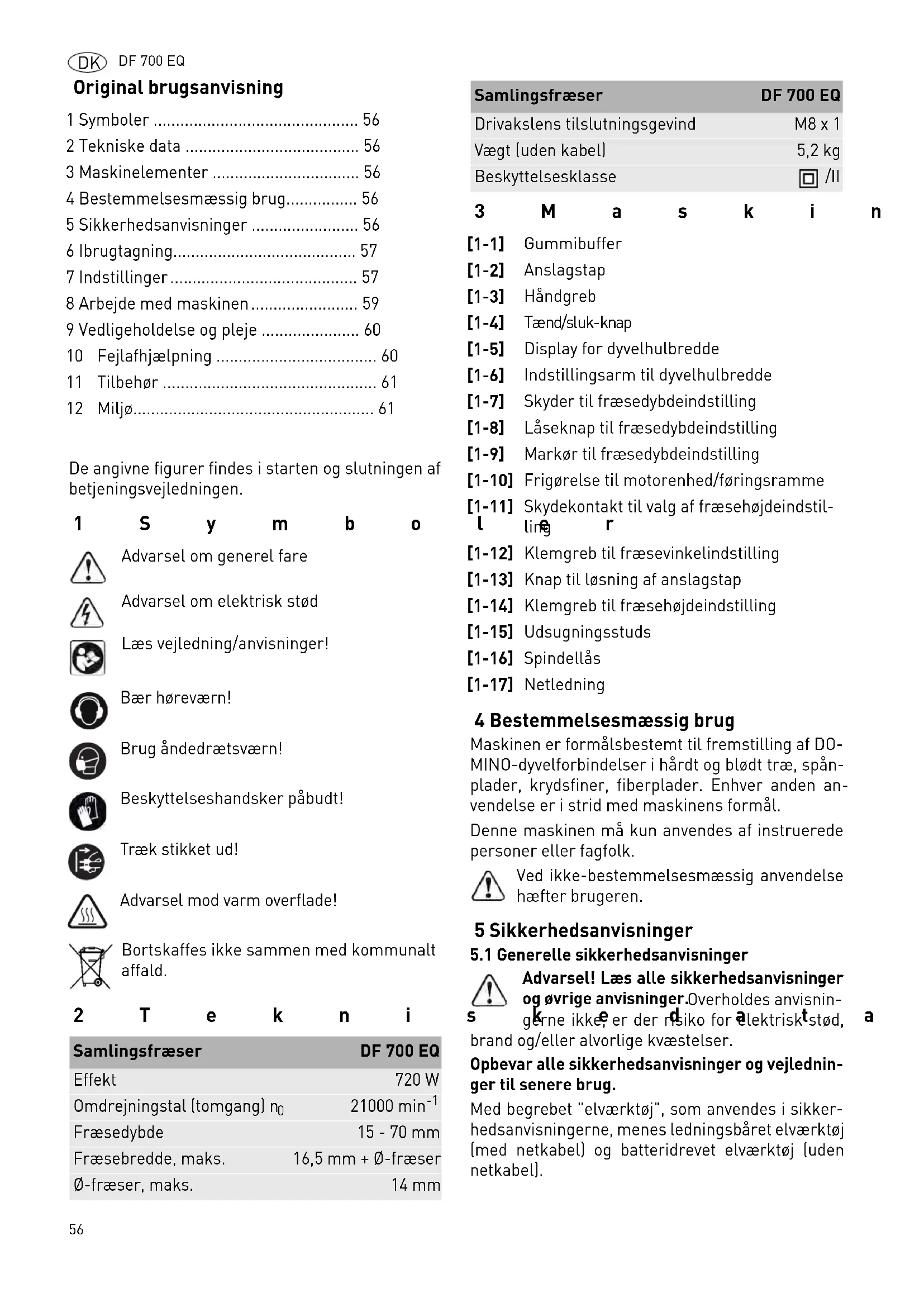 - 12 Miljø Advarsel om generel fare Advarsel om elektrisk stød Læs vejledning/anvisninger! Bær høreværn! Brug åndedrætsværn! Beskyttelseshandsker påbudt! Træk stikket ud! Advarsel mod varm overflade! Bortskaffes ikke sammen med kommunalt affald. Samlingsfræser DF 700 EQ Effekt 720 W Omdrejningstal (tomgang) n p. 61