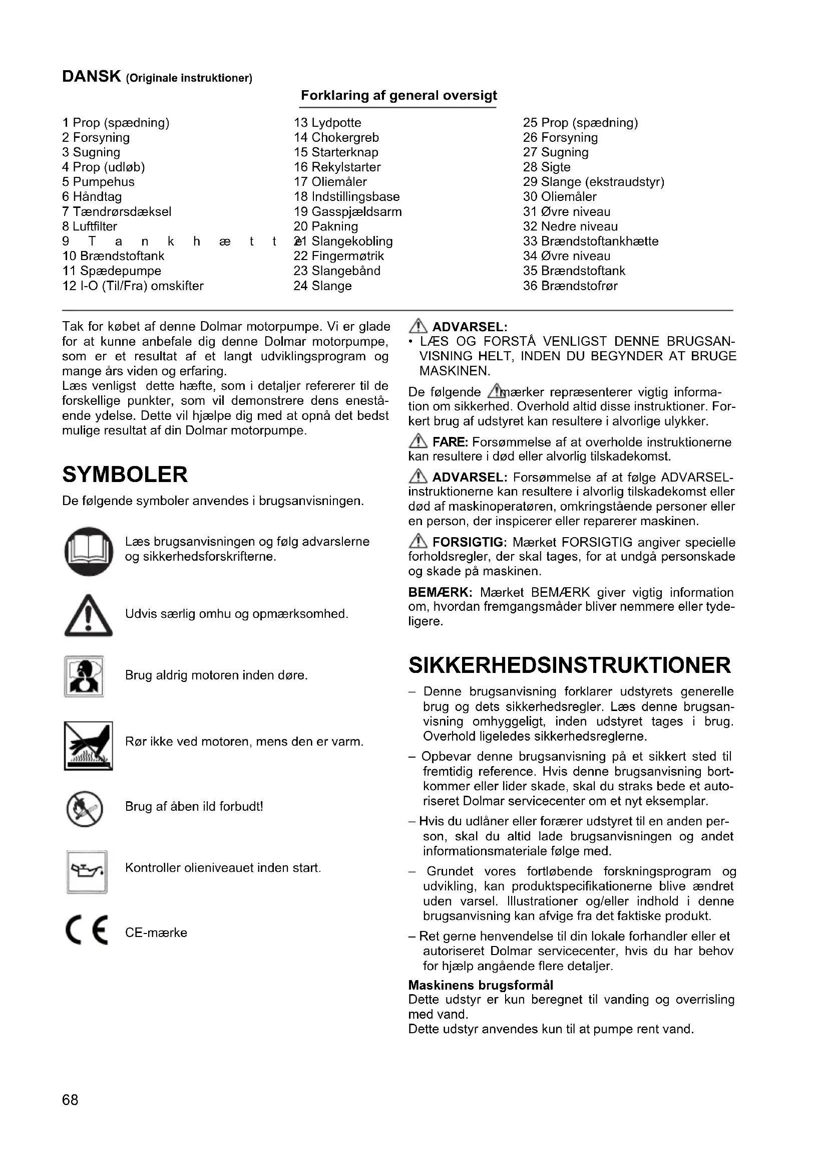 - LÆS OG FORSTÅ VENLIGST DENNE BRUGSAN- VISNING HELT, INDEN DU BEGYNDER AT BRUGE MASKINEN. De følgende mærker repræsenterer vigtig informa- tion om sikkerhed. Overhold altid disse instruktioner. For- kert brug af udstyret kan resultere i alvorlige ulykker. FARE: Forsømmelse af at overholde instruktionerne kan resultere i død eller alvorlig tilskadekomst. ADVARSEL: Forsømmelse af at følge ADVARSEL- instruktionerne kan resultere i alvorlig tilskadekomst eller død af maskinoperatøren, omkringstående personer eller en person, der inspicerer eller reparerer maskinen. FORSIGTIG: Mærket FORSIGTIG angiver specielle forholdsregler, der skal tages, for at undgå personskade og skade på maskinen. BEMÆRK: Mærket BEMÆRK giver vigtig information om, hvordan fremgangsmåder bliver nemmere eller tyde- ligere. SIKKERHEDSINSTRUKTIONER – Denne brugsanvisning forklarer udstyrets generelle brug og dets sikkerhedsregler. Læs denne brugsan- visning omhyggeligt, inden udstyret tages i brug. Overhold ligeledes sikkerhedsreglerne. – Opbevar denne brugsanvisning på et sikkert sted til fremtidig reference. Hvis denne brugsanvisning bort- kommer eller lider skade, skal du straks bede et auto- riseret Dolmar servicecenter om et nyt eksemplar. – Hvis du udlåner eller forærer udstyret til en anden per- son, skal du altid lade brugsanvisningen og andet informationsmateriale følge med. – Grundet vores fortløbende forskningsprogram og udvikling, kan produktspecifikationerne blive ændret uden varsel. Illustrationer og/eller indhold i denne brugsanvisning kan afvige fra det faktiske produkt. – Ret gerne henvendelse til din lokale forhandler eller et autoriseret Dolmar servicecenter, hvis du har behov for hjælp angående flere detaljer. Maskinens brugsformål Dette udstyr er kun beregnet til vanding og overrisling med vand. Dette udstyr anvendes kun til at pumpe rent vand. Læs brugsanvisningen og følg advarslerne og sikkerhedsforskrifterne. Udvis særlig omhu og opmærksomhed. Brug aldrig motoren inden døre. Rør ikke ved motoren, mens den er varm. Brug af åben ild forbudt! Kontroller olieniveauet inden start. CE-mærke69 FARE:
