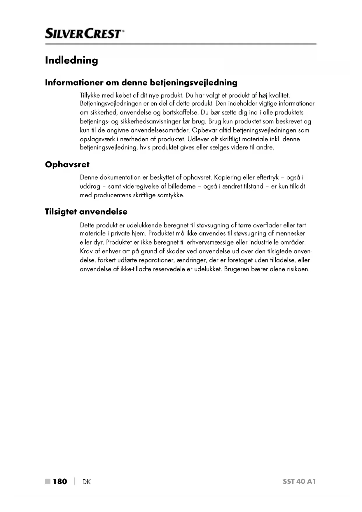 DK SST 40 A1 Indledning Informationer om denne betjeningsvejledning Tillykke med købet af dit nye produkt. Du har valgt et produkt af høj kvalitet. Betjeningsvejledningen er en del af dette produkt. Den indeholder vigtige informationer om sikkerhed, anvendelse og bortskaffelse. Du bør sætte dig ind i alle produktets betjenings- og sikkerhedsanvisninger før brug. Brug kun produktet som beskrevet og kun til de angivne anvendelsesområder. Opbevar altid betjeningsvejledningen som opslagsværk i nærheden af produktet. Udlever alt skriftligt materiale inkl. denne betjeningsvejledning, hvis produktet gives eller sælges videre til andre. Ophavsret Denne dokumentation er beskyttet af ophavsret. Kopiering eller eftertryk – også i uddrag – samt videregivelse af billederne – også i ændret tilstand – er kun tilladt med producentens skriftlige samtykke. Tilsigtet anvendelse Dette produkt er udelukkende beregnet til støvsugning af tørre overflader eller tørt materiale i private hjem. Produktet må ikke anvendes til støvsugning af mennesker eller dyr. Produktet er ikke beregnet til erhvervsmæssige eller industrielle områder. Krav af enhver art på grund af skader ved anvendelse ud over den tilsigtede anven- delse, forkert udførte reparationer, ændringer, der er foretaget uden tilladelse, eller anvendelse af ikke-tilladte reservedele er udelukket. Brugeren bærer alene risikoen. IB_329834_SST40A1_LB8.indb 180 24.09.2021 08:42:49DK