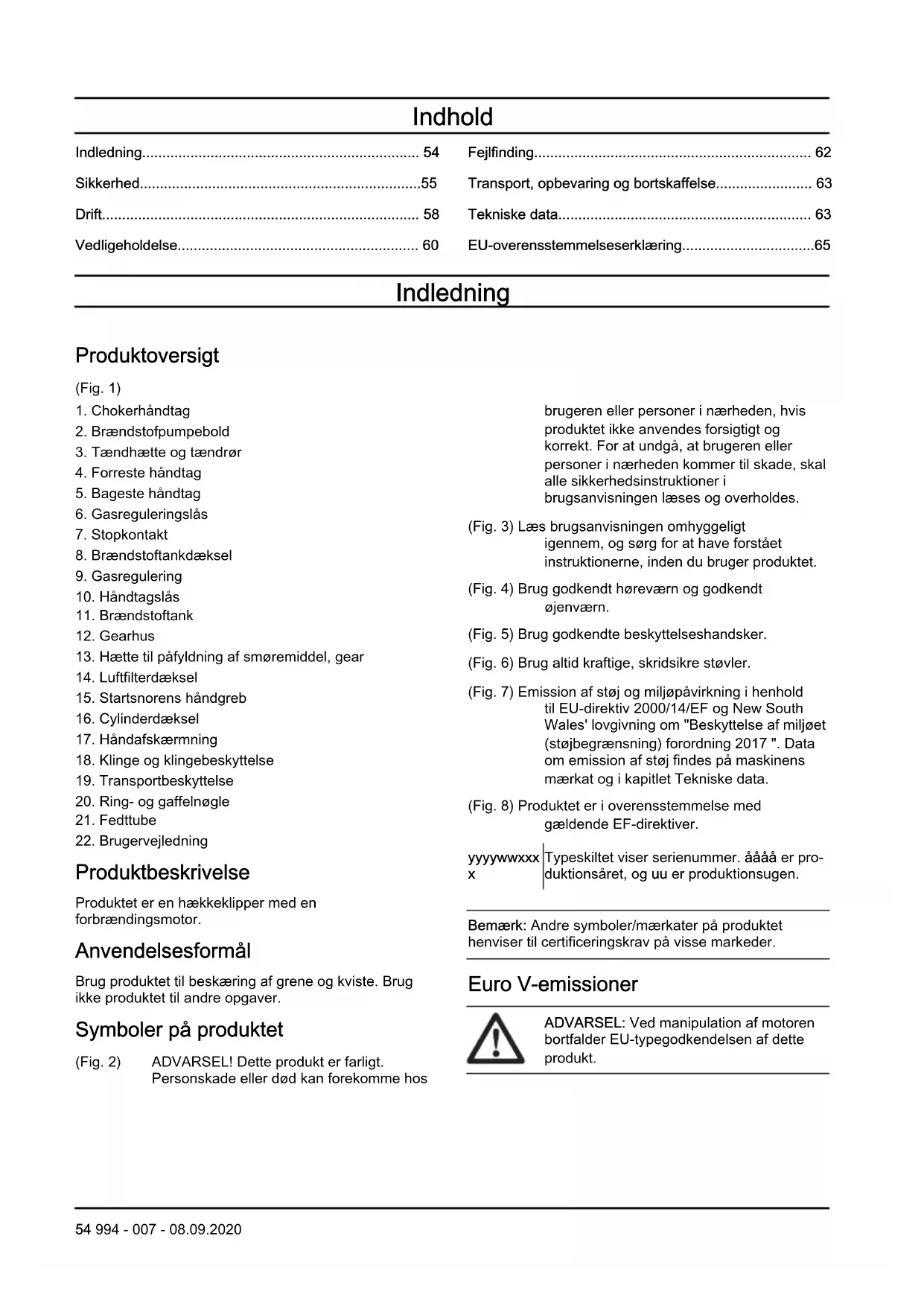 Produktbeskrivelse Produktet er en hækkeklipper med en forbrændingsmotor. Anvendelsesformål Brug produktet til beskæring af grene og kviste. Brug ikke produktet til andre opgaver. Symboler på produktet (Fig. 2) ADVARSEL! Dette produkt er farligt. Personskade eller død kan forekomme hos brugeren eller personer i nærheden, hvis produktet ikke anvendes forsigtigt og korrekt. For at undgå, at brugeren eller personer i nærheden kommer til skade, skal alle sikkerhedsinstruktioner i brugsanvisningen læses og overholdes. (Fig. 3) Læs brugsanvisningen omhyggeligt igennem, og sørg for at have forstået instruktionerne, inden du bruger produktet. (Fig. 4) Brug godkendt høreværn og godkendt øjenværn. (Fig. 5) Brug godkendte beskyttelseshandsker. (Fig. 6) Brug altid kraftige, skridsikre støvler. (Fig. 7) Emission af støj og miljøpåvirkning i henhold til EU-direktiv 2000/14/EF og New South Wales' lovgivning om "Beskyttelse af miljøet (støjbegrænsning) forordning 2017 ". Data om emission af støj findes på maskinens mærkat og i kapitlet Tekniske data. (Fig. 8) Produktet er i overensstemmelse med gældende EF-direktiver. yyyywwxxx