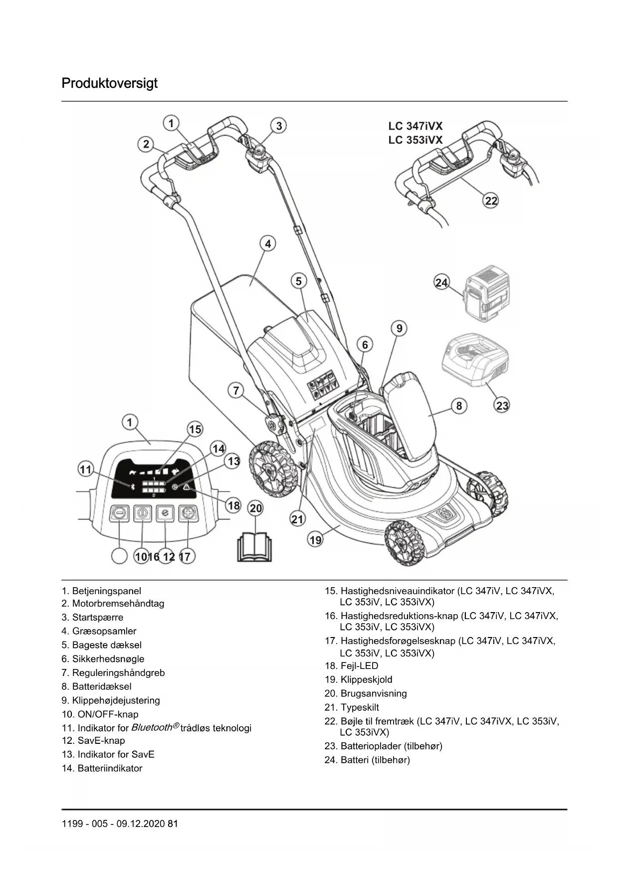 - Rengør produktet, og udfør fuld service, før du sætter produktet til opbevaring i længere tid. Bortskaffelse Symbolerne på produktet eller emballagen angiver, at produktet ikke må behandles som almindeligt husholdningsaffald. Det skal afleveres til en passende genbrugsstation med henblik på genvinding af elektrisk og elektronisk udstyr. Hvis du sørger for, at dette produkt håndteres korrekt, kan du være med til at modvirke potentielle negative indvirkninger på mennesker og miljø, som ellers kan være et resultat af fejlagtig affaldshåndtering i forbindelse med dette produkt. Nærmere oplysninger om genanvendelse af dette produkt fås hos kommunen, det lokale renovationsselskab eller forretningen, hvor produktet er købt. Tekniske data Tekniske data LC 247iX/LC 247i LC 347iVX/LC 347iV LC 353iVX/LC 353iV Klippemotor Motortype BLDC (børsteløs) 36
