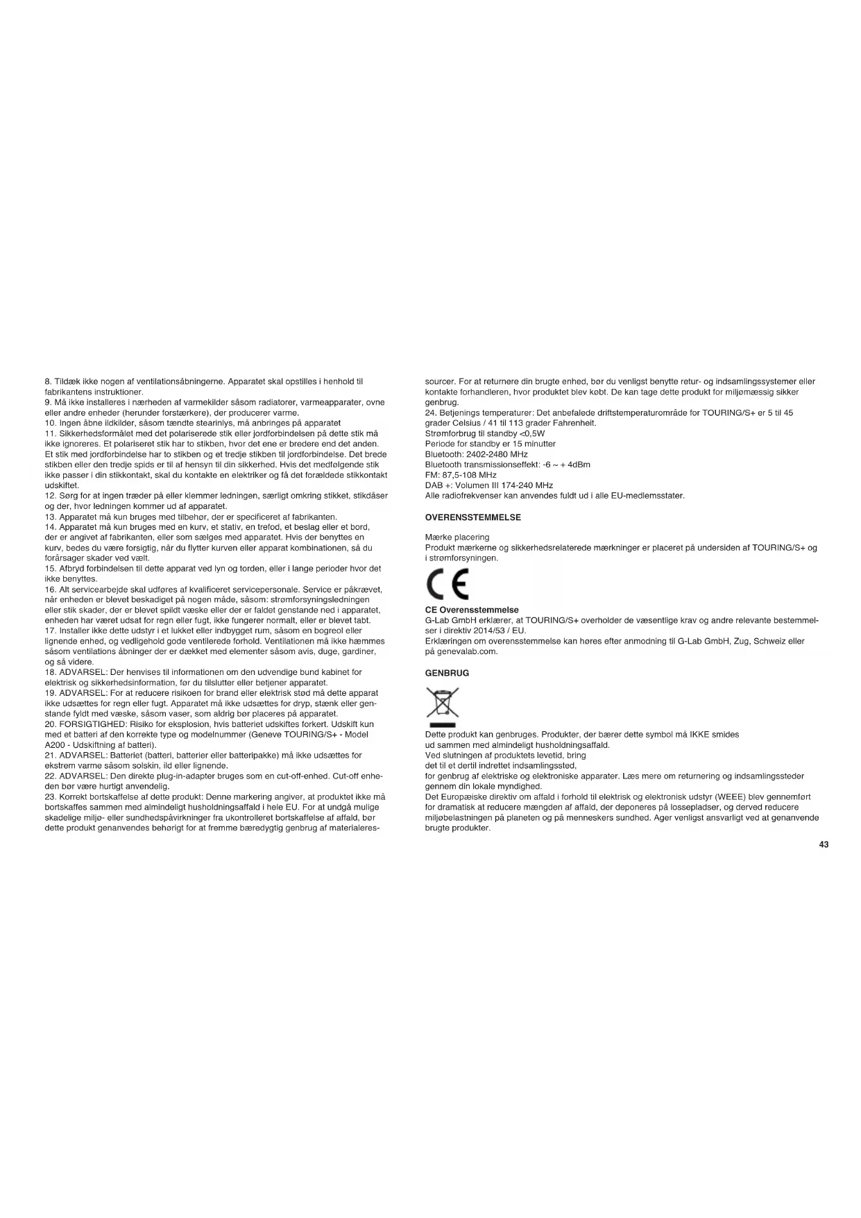 CE Overensstemmelse G-Lab GmbH erklærer, at TOURING/S+ overholder de væsentlige krav og andre relevante bestemmel- ser i direktiv 2014/53 / EU. Erklæringen om overensstemmelse kan høres efter anmodning til G-Lab GmbH, Zug, Schweiz eller på genevalab.com. GENBRUG