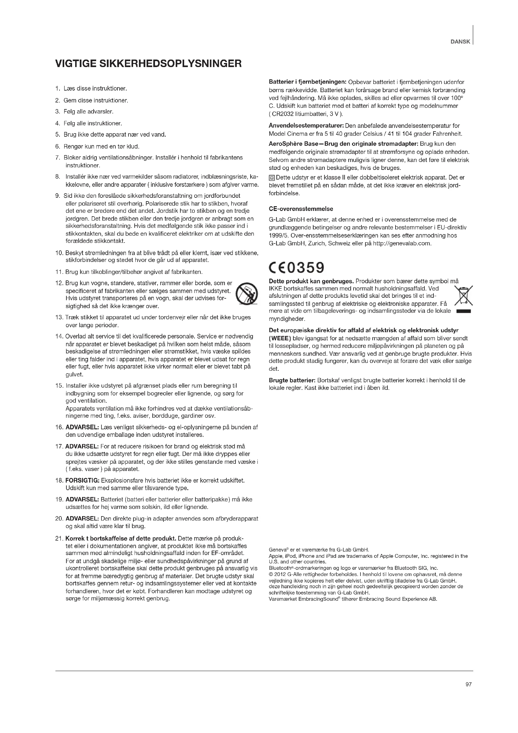 G-Lab GmbH erkräner, at denen enhed er i overensstemmelse med de grundlaaggende betingelser og andre relevante bestemmelser i EU-direktiv 1999/5. Over-ensstammelseserkläeringen kan ses after anmodning hos G-Lab GmbH, Zurich, Schweiz eller på http://genevalab.com.