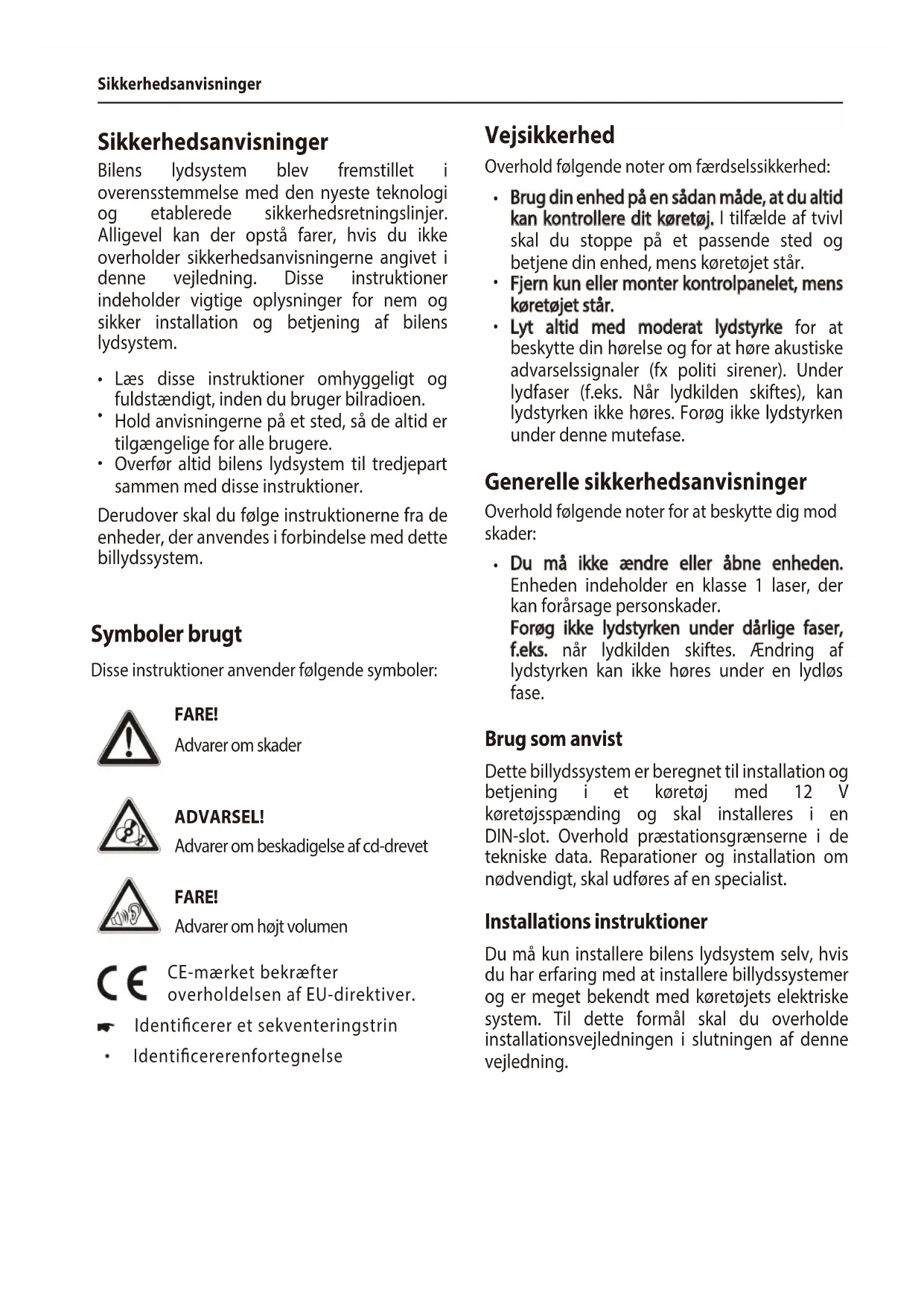 Symboler brugt Disse instruktioner anvender følgende symboler: FARE! Advarer om skader ADVARSEL! Advarer om beskadigelse af cd-drevet FARE! Advarer om højt volumen CE-mærket bekræfter overholdelsen af EU-direktiver. Identicerer et sekventeringstrin Identicererenfortegnelse Vejsikkerhed Overhold følgende noter om færdselssikkerhed: Generelle sikkerhedsanvisninger Overhold følgende noter for at beskytte dig mod skader: Brug som anvist Sikkerhedsanvisninger Bilens lydsystem blev fremstillet i overensstemmelse med den nyeste teknologi og etablerede sikkerhedsretningslinjer. Alligevel kan der opstå farer, hvis du ikke overholder sikkerhedsanvisningerne angivet i denne vejledning. Disse instruktioner indeholder vigtige oplysninger for nem og sikker installation og betjening af bilens lydsystem. Dette billydssystem er beregnet til installation og betjening i et køretøj med 12 V køretøjsspænding og skal installeres i en DIN-slot. Overhold præstationsgrænserne i de tekniske data. Reparationer og installation om nødvendigt, skal udføres af en specialist. Installations instruktioner Du må kun installere bilens lydsystem selv, hvis du har erfaring med at installere billydssystemer og er meget bekendt med køretøjets elektriske system. Til dette formål skal du overholde installationsvejledningen i slutningen af denne vejledning. Derudover skal du følge instruktionerne fra de enheder, der anvendes i forbindelse med dette billydssystem. Læs disse instruktioner omhyggeligt og fuldstændigt, inden du bruger bilradioen. Hold anvisningerne på et sted, så de altid er tilgængelige for alle brugere. Overfør altid bilens lydsystem til tredjepart sammen med disse instruktioner.