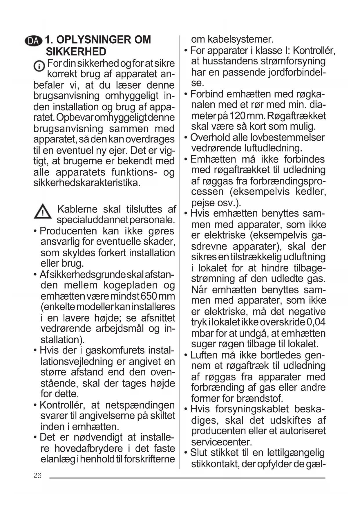 SIKKERHED For din sikkerhed og for at sikre korrekt brug af apparatet an- befaler vi, at du læser denne brugsanvisning omhyggeligt in- den installation og brug af appa- ratet. Opbevar omhyggeligt denne brugsanvisning sammen med apparatet, så den kan overdrages til en eventuel ny ejer. Det er vig- tigt, at brugerne er bekendt med alle apparatets funktions- og sikkerhedskarakteristika. Kablerne skal tilsluttes af specialuddannet personale.