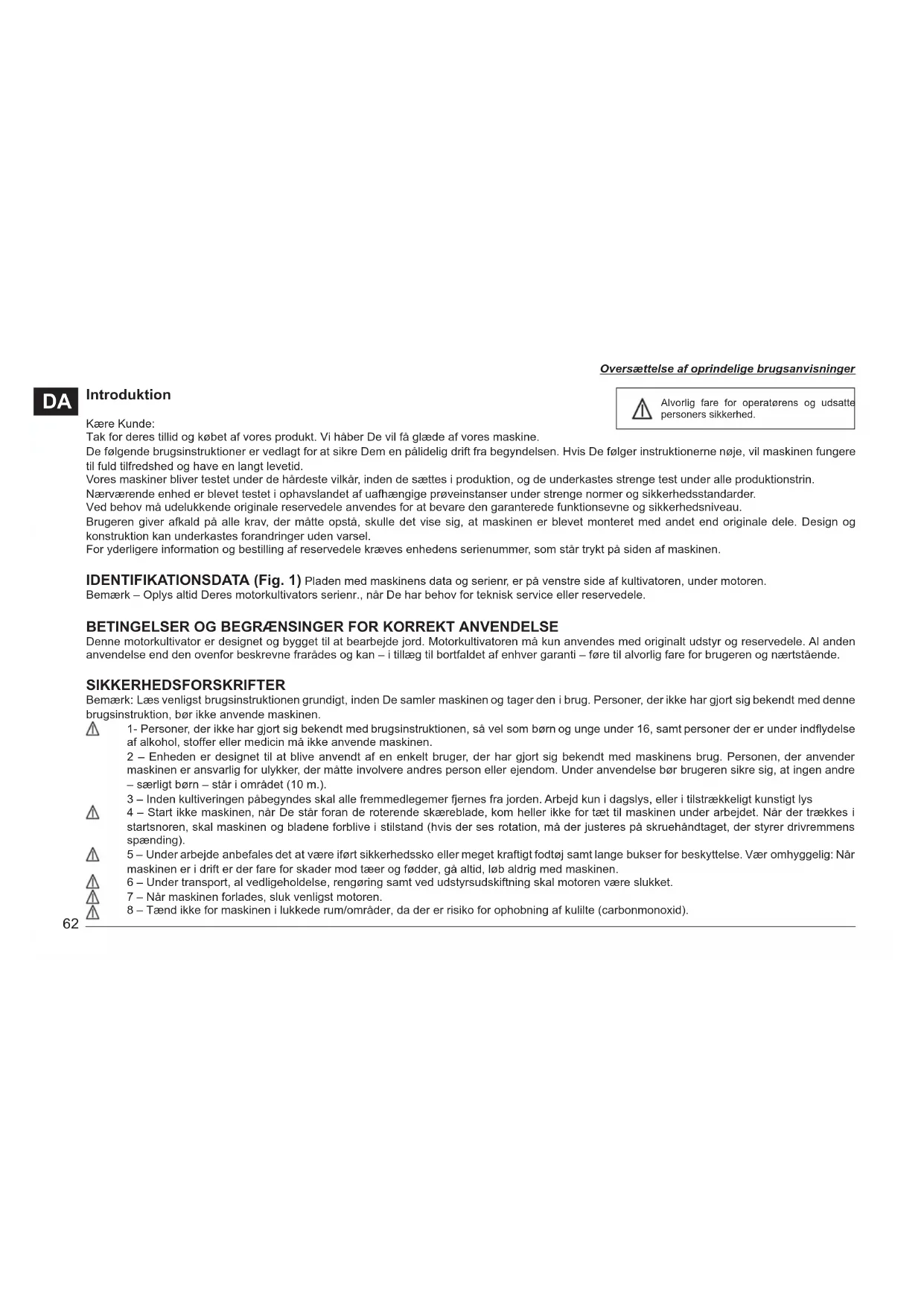Alvorlig fare for operatørens og udsatte personers sikkerhed. Oversættelse af oprindelige brugsanvisninger63