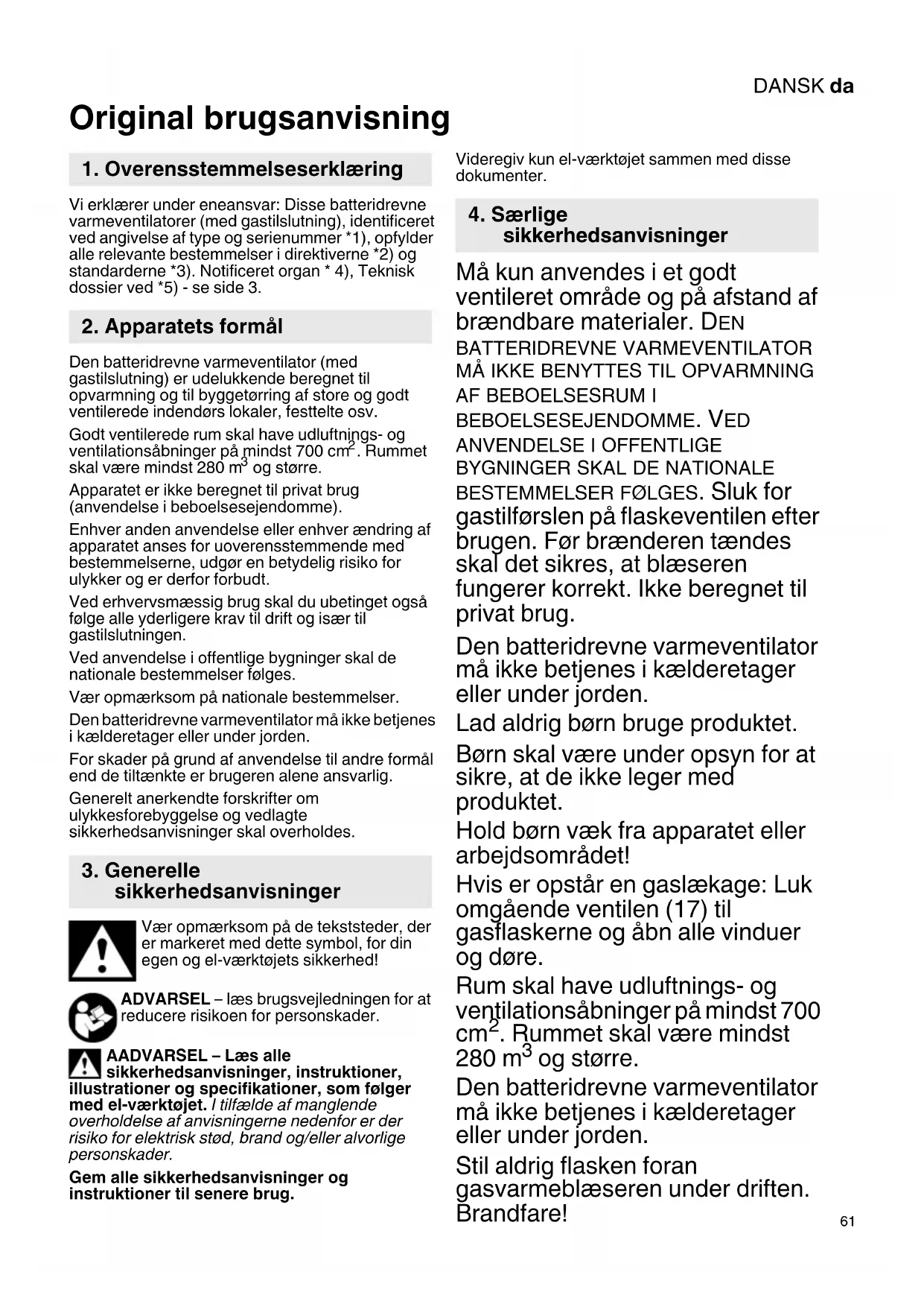 Original brugsanvisning Vi erklærer under eneansvar: Disse batteridrevne varmeventilatorer (med gastilslutning), identificeret ved angivelse af type og serienummer *1), opfylder alle relevante bestemmelser i direktiverne *2) og standarderne *3). Notificeret organ * 4), Teknisk dossier ved *5) - se side 3. Den batteridrevne varmeventilator (med gastilslutning) er udelukkende beregnet til opvarmning og til byggetørring af store og godt ventilerede indendørs lokaler, festtelte osv. Godt ventilerede rum skal have udluftnings- og ventilationsåbninger på mindst 700 cm