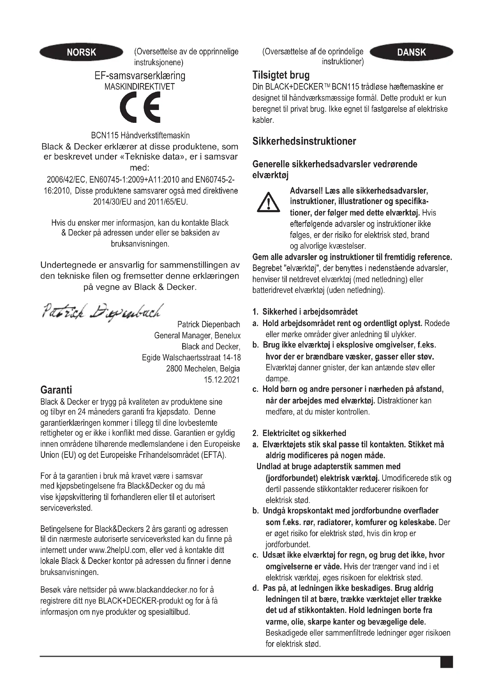 BCN115 Håndværks-hæftemaskine Black & Decker erklærer, at produkterne beskrevet under "Tekniske data" er i overensstemmelse med: 2006/42/EC, EN60745‑1:2009+A11:2010 and EN60745‑2‑ 16:2010, Disse produkterne er også i overensstemmelse med direktiver 2014/30/EU and 2011/65/EU. Kontakt Black & Decker på nedenstående adresse eller se vejledningens bagside for at få yderligere oplysninger. Undertegnede er ansvarlig for kompilering af den tekniske l og udsteder denne erklæring på vegne af Black & Decker. Patrick Diepenbach General Manager, Benelux Black and Decker, Egide Walschaertsstraat 14-18 2800 Mechelen, Belgien 15-12-2021(Oversættelse af de oprindelige instruktioner) DANSK (Alkuperäisten ohjeiden käännös) SUOMI Garanti Black & Decker er overbevist om den gode kvalitet af sine produkter og giver forbrugerne en garanti på 24 måneder fra købsdatoen. Garantien er et tillæg til forbrugerens lovmæssige rettigheder og påvirker ikke disse. Garantien er gyldig inden for medlemsstaterne af Den Europæiske Union og Det Europæiske Frihandelsområde. Når du gør krav på garantien, skal kravet være i overensstemmelse med Black&Decker vilkår og betingelser, og du skal indsende dokumentation for købet til sælgeren eller til en autoriseret reparatør. Vilkår og betingelser for Black & Decker 2 års garanti og placeringen af dit nærmeste autoriserede serviceværksted kan fås på internettet på www.2helpU.com, eller ved at kontakte dit lokale Black & Decker kontor på den adresse, der er angivet i denne vejledning. Besøg venligst vores websted www.blackanddecker.co.uk for at registrere dit nye BLACK+DECKER produkt og modtage opdateringer om nye produkter og specielle tilbud. (Alkuperäisten ohjeiden käännös) SUOMI Käyttötarkoitus Langaton BLACK+DECKER