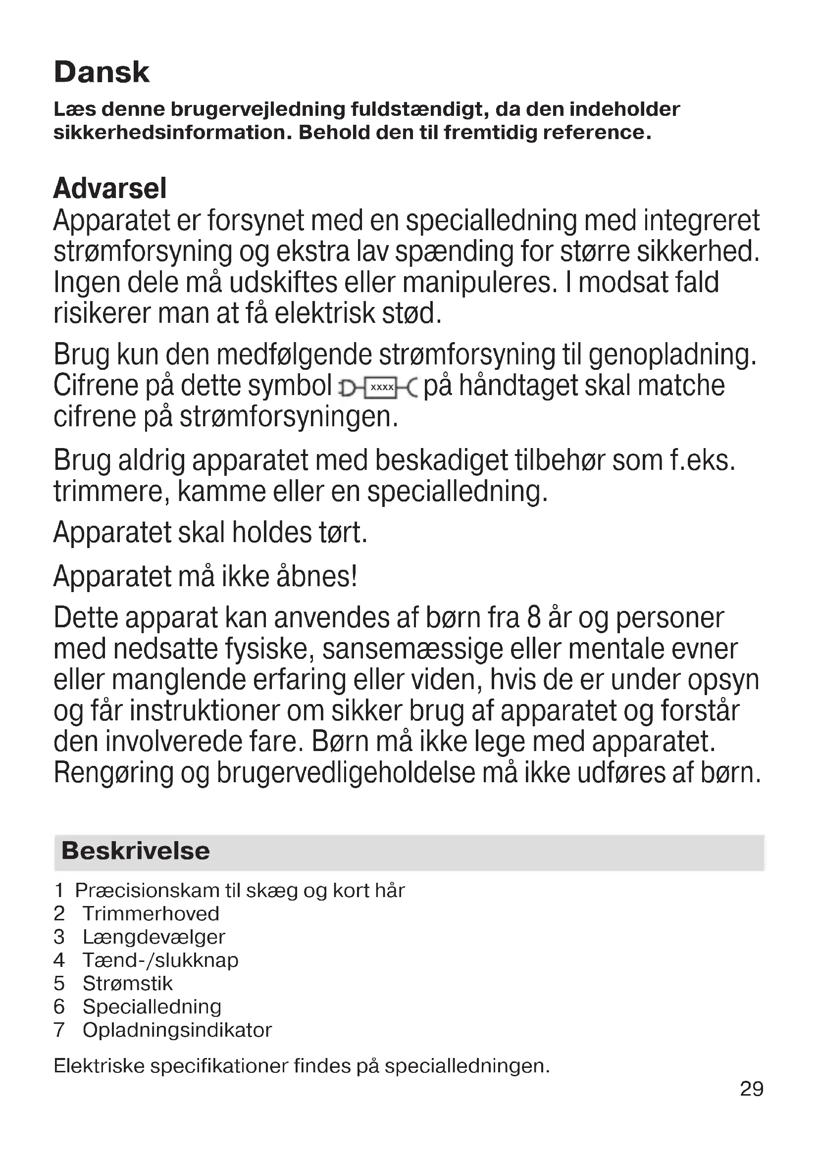 - Bakkenbarter, overskæg og kort skæg kan formes, når præcisionskammen tages af. Rengøring og vedligeholdelse