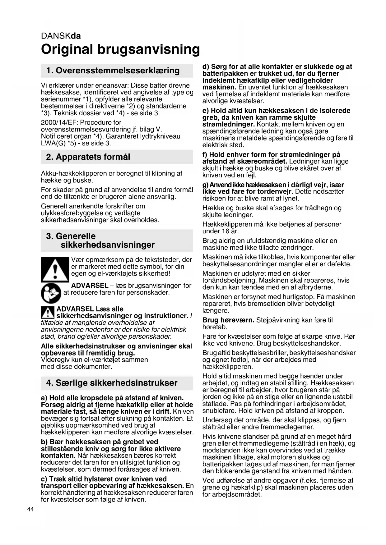 Original brugsanvisning Vi erklærer under eneansvar: Disse batteridrevne hækkesakse, identificeret ved angivelse af type og serienummer *1), opfylder alle relevante bestemmelser i direktiverne *2) og standarderne *3). Teknisk dossier ved *4) - se side 3. 2000/14/EF: Procedure for overensstemmelsesvurdering jf. bilag V. Notificeret organ *4). Garanteret lydtrykniveau LWA(G) *5) - se side 3. Akku-hækkeklipperen er beregnet til klipning af hække og buske. For skader på grund af anvendelse til andre formål end de tiltænkte er brugeren alene ansvarlig. Generelt anerkendte forskrifter om ulykkesforebyggelse og vedlagte sikkerhedsanvisninger skal overholdes. Vær opmærksom på de tekststeder, der er markeret med dette symbol, for din egen og el-værktøjets sikkerhed! ADVARSEL – læs brugsanvisningen for at reducere faren for personskader. ADVARSEL Læs alle sikkerhedsanvisninger og instruktioner. I tilfælde af manglende overholdelse af anvisningerne nedenfor er der risiko for elektrisk stød, brand og/eller alvorlige personskader. Alle sikkerhedsinstrukser og anvisninger skal opbevares til fremtidig brug. Videregiv kun el-værktøjet sammen med disse dokumenter. a) Hold alle kropsdele på afstand af kniven. Forsøg aldrig at fjerne hækafklip eller at holde materiale fast, så længe kniven er i drift. Kniven bevæger sig fortsat efter slukning på kontakten. Et øjebliks uopmærksomhed ved brug af hækkeklipperen kan medføre alvorlige kvæstelser. b) Bær hækkesaksen på grebet ved stillestående kniv og sørg for ikke aktivere kontakten. Når hækkesaksen bæres korrekt reducerer det faren for en utilsigtet funktion og kvæstelser, som dermed forårsages af kniven. c) Træk altid hylsteret over kniven ved transport eller opbevaring af hækkesaksen. En korrekt håndtering af hækkesaksen reducerer faren for kvæstelser som følge af kniven. d) Sørg for at alle kontakter er slukkede og at batteripakken er trukket ud, før du fjerner indeklemt hækafklip eller vedligeholder maskinen. En uventet funktion af hækkesaksen ved fjernelse af indeklemt materiale kan medføre alvorlige kvæstelser. e) Hold altid kun hækkesaksen i de isolerede greb, da kniven kan ramme skjulte strømledninger. Kontakt mellem kniven og en spændingsførende ledning kan også gøre maskinens metaldele spændingsførende og føre til elektrisk stød. f) Hold enhver form for strømledninger på afstand af skæreområdet. Ledninger kan ligge skjult i hække og buske og blive skåret over af kniven ved en fejl. g) Anvend ikke hækkesaksen i dårligt vejr, især ikke ved fare for tordenvejr. Dette nedsætter risikoen for at blive ramt af lynet. Hække og buske skal afsøges for trådhegn og skjulte ledninger. Hækkeklipperen må ikke betjenes af personer under 16 år. Brug aldrig en ufuldstændig maskine eller en maskine med ikke tilladte ændringer. Maskinen må ikke tilkobles, hvis komponenter eller beskyttelsesanordninger mangler eller er defekte. Maskinen er udstyret med en sikker tohåndsbetjening. Maskinen skal repareres, hvis den kun kan tændes med en af afbryderne. Maskinen er forsynet med hurtigstop. Få maskinen repareret, hvis bremsetiden bliver betydeligt længere. Brug høreværn. Støjpåvirkning kan føre til høretab. Fare for kvæstelser som følge af skarpe knive. Rør ikke ved knivene. Brug beskyttelseshandsker. Brug altid beskyttelsesbriller, beskyttelseshandsker og egnet fodtøj, når der arbejdes med hækkeklipperen. Hold altid maskinen med begge hænder under arbejdet, og indtag en stabil stilling. Hækkesaksen er beregnet til arbejder, hvor brugeren står på jorden og ikke på en stige eller en lignende ustabil ståflade. Pas på forhindringer i arbejdsområdet, snublefare. Hold kniven på afstand af kroppen. Undersøg det område, der skal klippes, og fjern ståltråd eller andre fremmedlegemer. Hvis knivene standser på grund af en meget hård gren eller et fremmedlegeme (ståltråd i en hæk), og modstanden ikke kan overvindes ved at trække maskinen tilbage, skal motoren slukkes og batteripakken tages ud af maskinen, før man fjerner den blokerende genstand fra kniven med hånden. Ved udførelse af andre opgaver (f.eks. fjernelse af grene og hækafklip) skal maskinen placeres uden for arbejdsområdet.