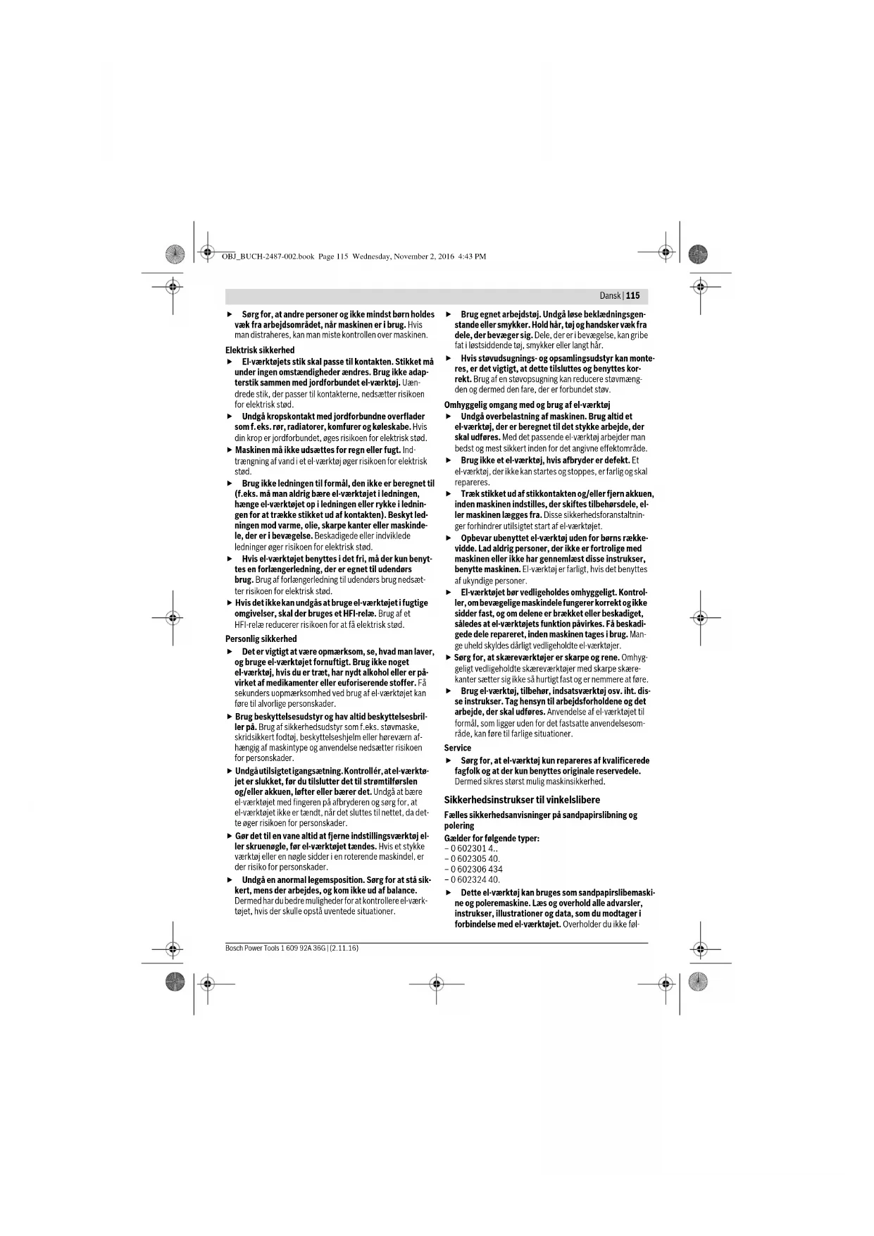 OBJ_BUCH-2487-002.book Page 122 Wednesday, November 2, 2016 4:43 PMDansk | 123 Bosch Power Tools 1 609 92A 36G | (2.11.16) Det svingningsniveau, der er angivet i nærværende instruktio- ner, er blevet målt iht. en standardiseret måleproces i EN 60745, og kan bruges til at sammenligne el-værktøjer. Det er også egnet til en foreløbig vurdering af svingningsbelast- ningen. Det angivede svingningsniveau repræsenterer de væsentlige anvendelser af el-værktøjet. Hvis el-værktøjet dog anvendes til andre formål, med forskellige tilbehørsdele, med afvigende indsatsværktøj eller utilstrækkelig vedligeholdelse, kan sving- ningsniveauet afvige. Dette kan føre til en betydelig forøgelse af svingningsbelastningen i hele arbejdstidsrummet. Til en nøjagtig vurdering af svingningsbelastningen bør der også tages højde for de tider, i hvilke værktøjet er slukket eller godt nok kører, men rent faktisk ikke anvendes. Dette kan fø- re til en betydelig reduktion af svingningsbelastningen i hele arbejdstidsrummet. Fastlæg ekstra sikkerhedsforanstaltninger til beskyttelse af brugeren mod svingningers virkning som f.eks.: Vedligehol- delse af el-værktøj og indsatsværktøj, holde hænder varme, organisation af arbejdsforløb. Overensstemmelseserklæring Vi erklærer som eneansvarlig, at det produkt, der er beskrevet under „Tekniske data“, opfylder alle bestemmelser i direkti- verne 2011/65/EU, 2014/30/EU, 2006/42/EF med tilhø- rende ændringer samt følgende standarder: EN 60745-1, EN 60745-2-3, EN 50581. Teknisk dossier (2006/42/EF) ved: Robert Bosch Power Tools GmbH, PT/ECS, 70538 Stuttgart, GERMANY Robert Bosch Power Tools GmbH 70538 Stuttgart, GERMANY Stuttgart, 01.01.2017 Montering Montering af beskyttelsesanordninger Generelle henvisninger Afbryd energiforsyningen, før der foretages indstillin- ger på værktøjet, før tilbehørsdele udskiftes eller før el-værktøjet tages ud af brug i længere tid. Disse sikker- Samlede vibrationsværdier a