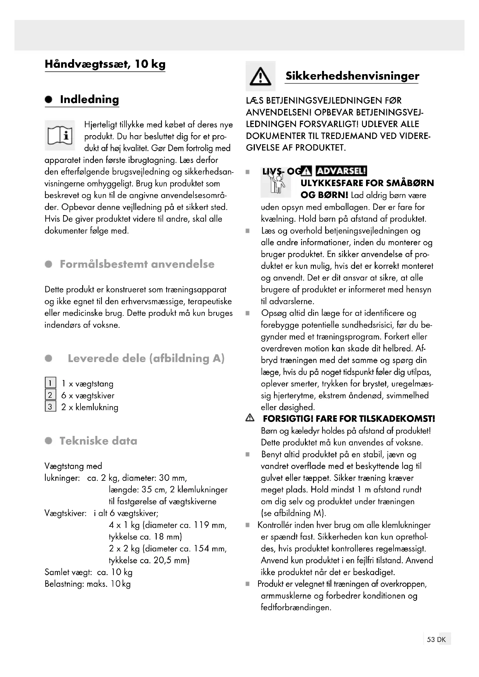2 x klemlukning Tekniske data Vægtstang med lukninger: ca. 2 kg, diameter: 30 mm, længde: 35 cm, 2 klemlukninger til fastgørelse af vægtskiverne Vægtskiver: i alt 6 vægtskiver; 4 x 1 kg (diameter ca. 119 mm, tykkelse ca. 18 mm) 2 x 2 kg (diameter ca. 154 mm, tykkelse ca. 20,5 mm) Samlet vægt: ca. 10 kg Belastning: maks. 10 kg Sikkerhedshenvisninger