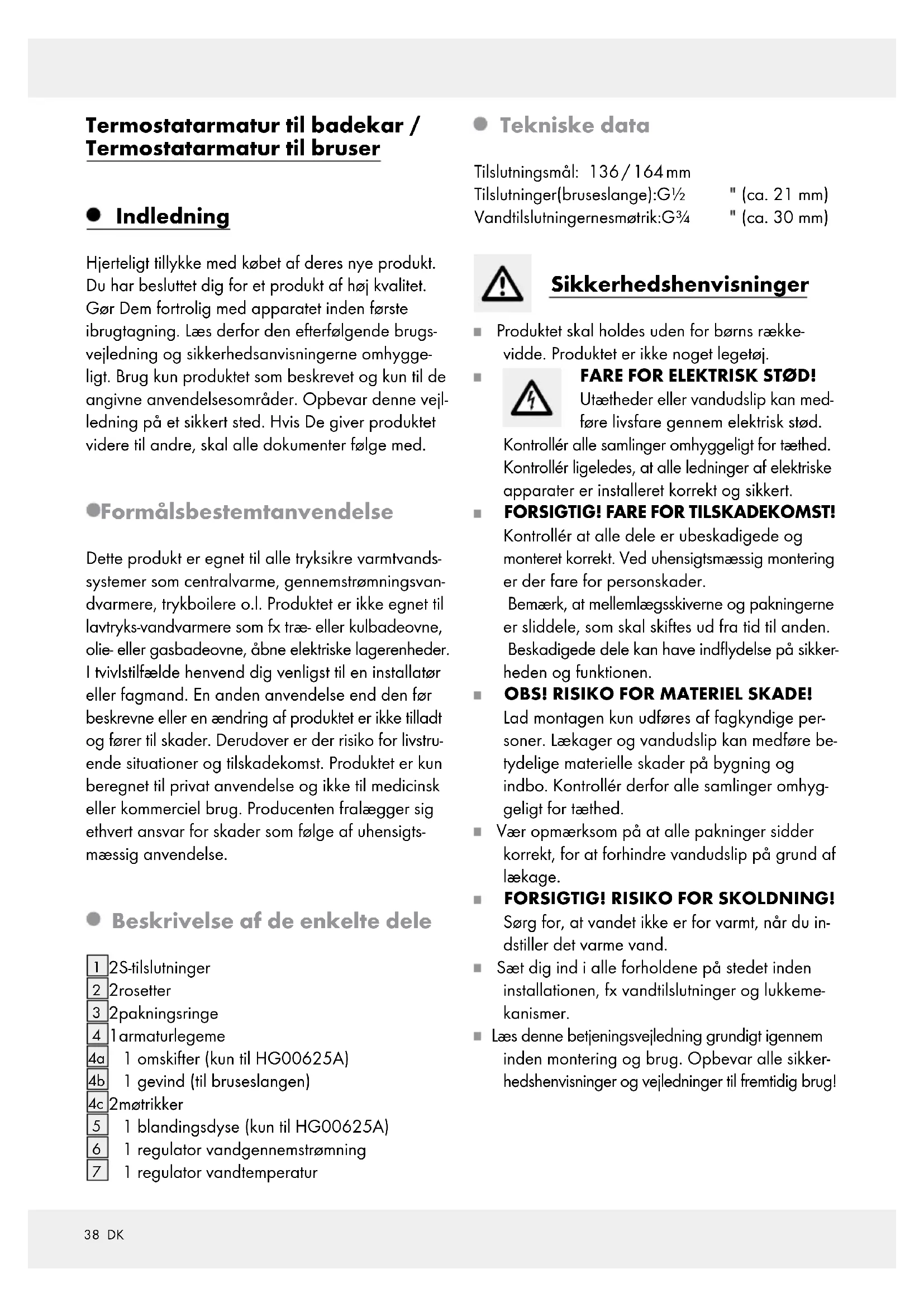 1 regulator vandtemperatur Tekniske data Tilslutningsmål: 136 / 164 mm Tilslutninger (bruseslange): G½ (ca. 21 mm) Vandtilslutningernes møtrik: G¾ (ca. 30 mm) Sikkerhedshenvisninger Produktet skal holdes uden for børns række- vidde. Produktet er ikke noget legetøj. FARE FOR ELEKTRISK STØD! Utætheder eller vandudslip kan med- føre livsfare gennem elektrisk stød. Kontrollér alle samlinger omhyggeligt for tæthed. Kontrollér ligeledes, at alle ledninger af elektriske apparater er installeret korrekt og sikkert. FORSIGTIG! FARE FOR TILSKADEKOMST! Kontrollér at alle dele er ubeskadigede og monteret korrekt. Ved uhensigtsmæssig montering er der fare for personskader. Bemærk, at mellemlægsskiverne og pakningerne er sliddele, som skal skiftes ud fra tid til anden. Beskadigede dele kan have indflydelse på sikker- heden og funktionen. OBS! RISIKO FOR MATERIEL SKADE! Lad montagen kun udføres af fagkyndige per- soner. Lækager og vandudslip kan medføre be- tydelige materielle skader på bygning og indbo. Kontrollér derfor alle samlinger omhyg- geligt for tæthed. Vær opmærksom på at alle pakninger sidder korrekt, for at forhindre vandudslip på grund af lækage. FORSIGTIG! RISIKO FOR SKOLDNING! Sørg for, at vandet ikke er for varmt, når du in- dstiller det varme vand. Sæt dig ind i alle forholdene på stedet inden installationen, fx vandtilslutninger og lukkeme- kanismer. Læs denne betjeningsvejledning grundigt igennem inden montering og brug. Opbevar alle sikker- hedshenvisninger og vejledninger til fremtidig brug!39 DK Montage Installation af armaturet Bemærk: Tildæk delene som skal skrues i med henholdsvis en fugtig klud eller kunstofklemmer, så delene ikke bliver ridsede. Sluk for hovedvandtilførslen for at undgå van- dudslip på grund af utæthed. Installér armaturet på vandtilslutningen som vist på afbildning A. Tilslutning af tilbehør (brusehoved og bruseslange)*: Bemærk: Tildæk delene som skal skrues i med henholdsvis en fugtig klud eller kunstofklemmer, så delene ikke bliver ridsede. Skru en gængs bruseslange* fast på gevindet