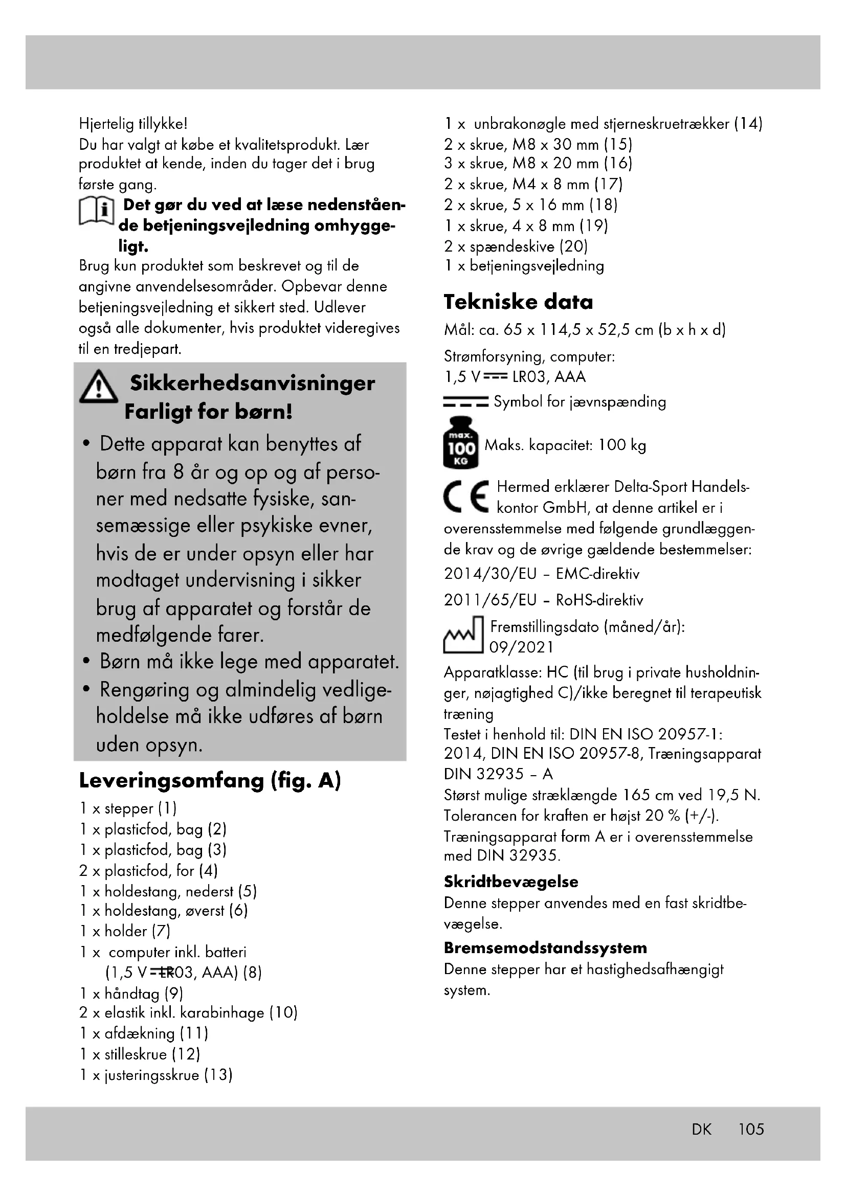 - Rengøring og almindelig vedlige- holdelse må ikke udføres af børn uden opsyn. Leveringsomfang (fig. A) 1 x stepper (1) 1 x plasticfod, bag (2) 1 x plasticfod, bag (3) 2 x plasticfod, for (4) 1 x holdestang, nederst (5) 1 x holdestang, øverst (6) 1 x holder (7) 1 x computer inkl. batteri (1,5 V LR03, AAA) (8) 1 x håndtag (9) 2 x elastik inkl. karabinhage (10) 1 x afdækning (11) 1 x stilleskrue (12) 1 x justeringsskrue (13) 1 x unbrakonøgle med stjerneskruetrækker (14) 2 x skrue, M8 x 30 mm (15) 3 x skrue, M8 x 20 mm (16) 2 x skrue, M4 x 8 mm (17) 2 x skrue, 5 x 16 mm (18) 1 x skrue, 4 x 8 mm (19) 2 x spændeskive (20) 1 x betjeningsvejledning Tekniske data Mål: ca. 65 x 114,5 x 52,5 cm (b x h x d) Strømforsyning, computer: 1,5 V LR03, AAA Symbol for jævnspænding Maks. kapacitet: 100 kg Hermed erklærer Delta-Sport Handels- kontor GmbH, at denne artikel er i overensstemmelse med følgende grundlæggen- de krav og de øvrige gældende bestemmelser: 2014/30/EU – EMC-direktiv 2011/65/EU – RoHS-direktiv Fremstillingsdato (måned/år): 09/2021 Apparatklasse: HC (til brug i private husholdnin- ger, nøjagtighed C)/ikke beregnet til terapeutisk træning Testet i henhold til: DIN EN ISO 20957-1: 2014, DIN EN ISO 20957-8, Træningsapparat DIN 32935 – A Størst mulige stræklængde 165 cm ved 19,5 N. Tolerancen for kraften er højst 20 % (+/-). Træningsapparat form A er i overensstemmelse med DIN 32935. Skridtbevægelse Denne stepper anvendes med en fast skridtbe- vægelse. Bremsemodstandssystem Denne stepper har et hastighedsafhængigt system. DK106 Bestemmelsesmæssig brug Artiklen er udelukkende egnet til brug som træ- ningsapparat. Artiklen er beregnet til privat brug og er ikke egnet til medicinske og erhvervsmæs- sige formål. Artiklen er beregnet til indendørs brug. Sikkerhedsanvisninger Generel fare