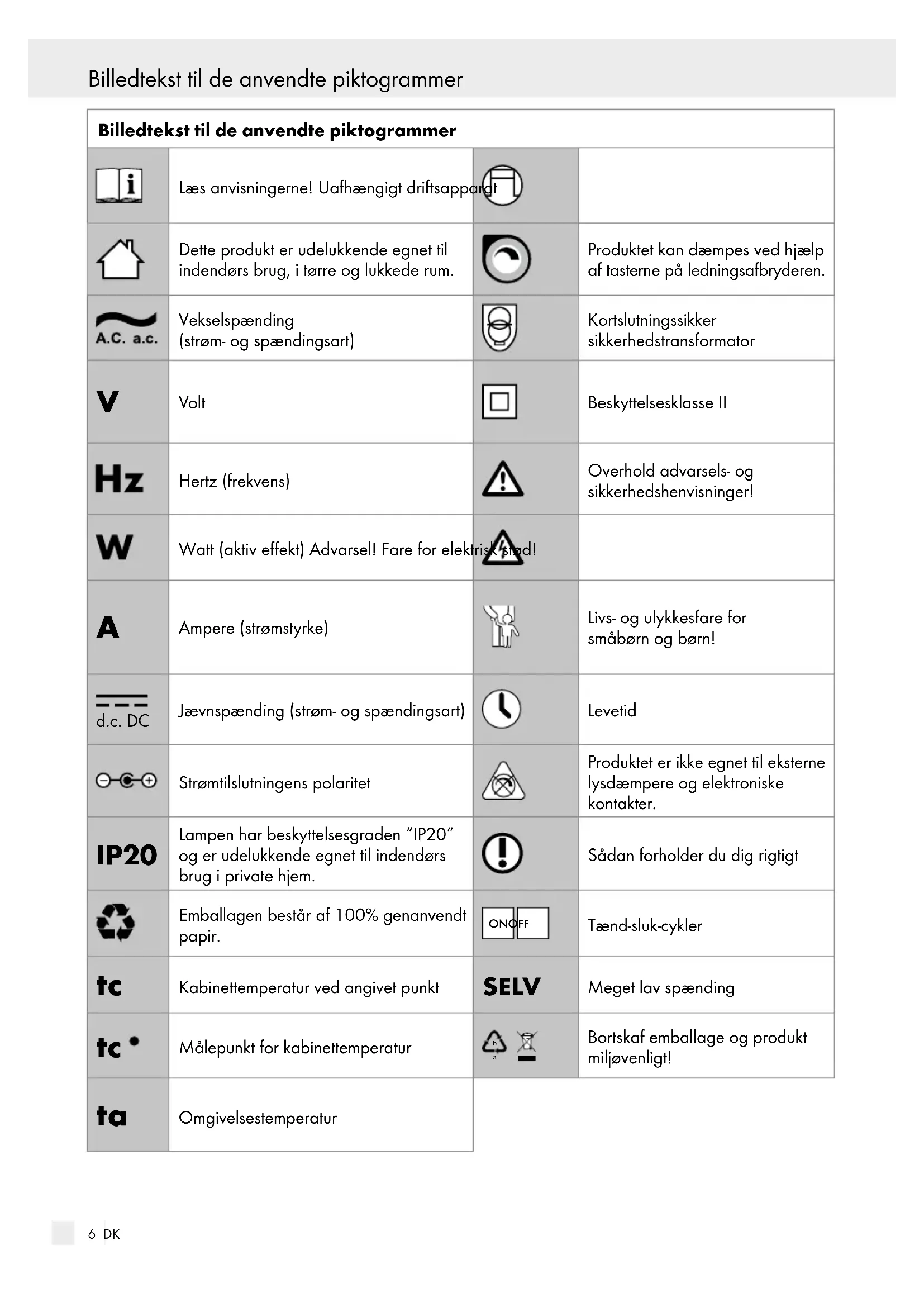 Ampere (strømstyrke) Livs- og ulykkesfare for småbørn og børn! d.c. DC Jævnspænding (strøm- og spændingsart) Levetid Strømtilslutningens polaritet Produktet er ikke egnet til eksterne lysdæmpere og elektroniske kontakter. IP20 Lampen har beskyttelsesgraden “IP20” og er udelukkende egnet til indendørs brug i private hjem. Sådan forholder du dig rigtigt Emballagen består af 100% genanvendt papir. ON OFF Tænd-sluk-cykler