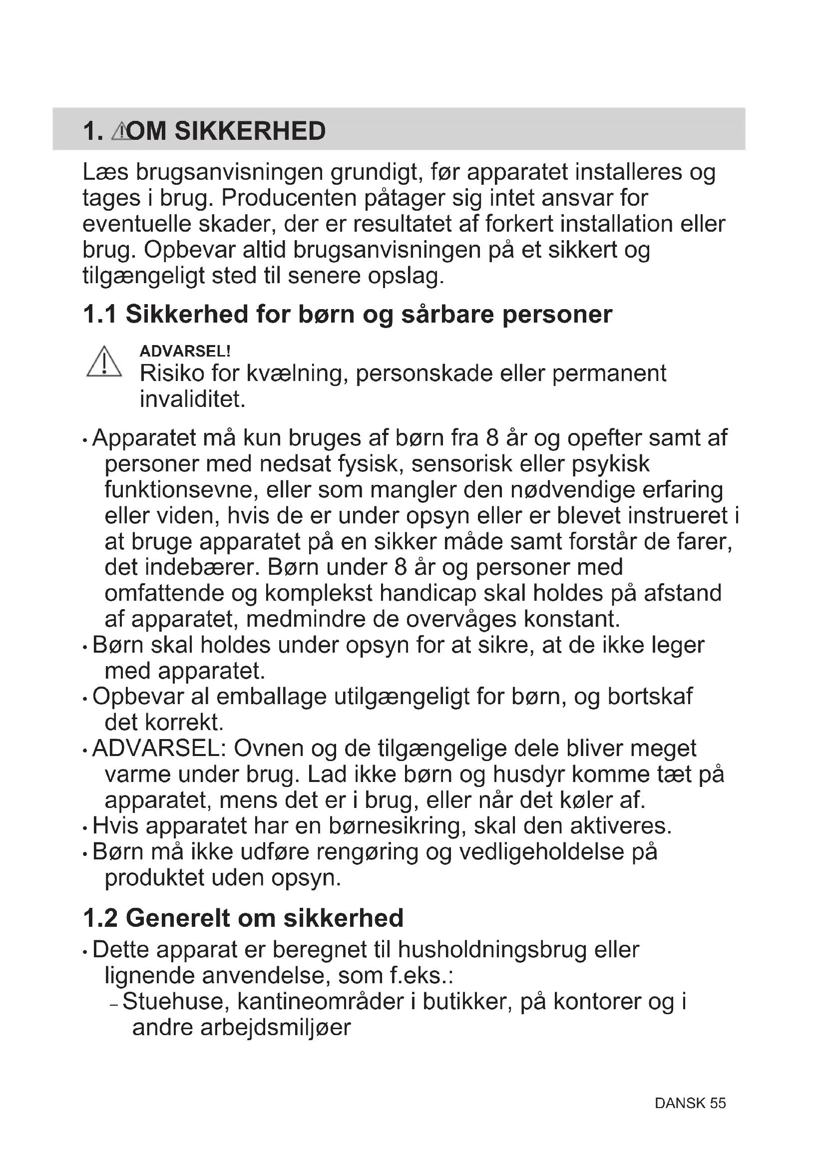- Apparatet må kun bruges af børn fra 8 år og opefter samt af personer med nedsat fysisk, sensorisk eller psykisk funktionsevne, eller som mangler den nødvendige erfaring eller viden, hvis de er under opsyn eller er blevet instrueret i at bruge apparatet på en sikker måde samt forstår de farer, det indebærer. Børn under 8 år og personer med omfattende og komplekst handicap skal holdes på afstand af apparatet, medmindre de overvåges konstant.