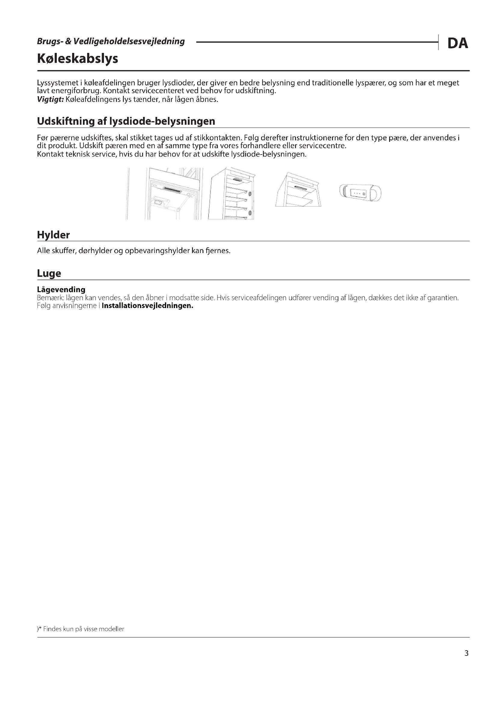Brugs- & Vedligeholdelsesvejledning Køleskabslys Lyssystemet i køleafdelingen bruger lysdioder, der giver en bedre belysning end traditionelle lyspærer, og som har et meget lavt energiforbrug. Kontakt servicecenteret ved behov for udskiftning. Vigtigt: Køleafdelingens lys tænder, når lågen åbnes. Udskiftning af lysdiode-belysningen Før pærerne udskiftes, skal stikket tages ud af stikkontakten. Følg derefter instruktionerne for den type pære, der anvendes i dit produkt. Udskift pæren med en af samme type fra vores forhandlere eller servicecentre. Kontakt teknisk service, hvis du har behov for at udskifte lysdiode-belysningen. Hylder Alle skuer, dørhylder og opbevaringshylder kan ernes. Luge Lågevending Bemærk: lågen kan vendes, så den åbner i modsatte side. Hvis serviceafdelingen udfører vending af lågen, dækkes det ikke af garantien. Følg anvisningerne i Installationsvejledningen.)* Findes kun på visse modeller4 Brugs- & Vedligeholdelsesvejledning Brug af apparatet Førstegangsbrug Vent mindst to timer efter installation, før apparatet forbindes til strømforsyningen. Apparatet starter automatisk, når det forbindes til strømforsyningen. De ideelle opbevaringstemperaturer for madvarerne er allerede indstillet på fabrikken. Når du har tændt for apparatet, skal du vente i 4-6 timer for at opnå den korrekte opbevaringstemperatur for et normalt fyldt apparat. Anbring det bakterie- og lugtlteret som vist på dets emballage (hvis lteret ndes). Hvis lydalarmen starter, betyder det, at temperaturalarmen er blevet aktiveret: Tryk på knappen, for at slukke for lydalarmen. Køle- og fødevareopbevaringsafdeling Køleafdelingen er velegnet til opbevaring af friske mad- og drikkevarer. Afrimningen af køleafdelingen er fuldautomatisk. Dannelse af vanddråber på køleafdelingens bagvæg betyder, at den automatiske afrimning er i gang. Afrimningsvandet ledes automatisk via en aøbskanal ud i en beholder, hvor det fordamper. Bemærk: Rumtemperaturen, hvor ofte dørene åbnes og apparatets placering kan påvirke temperaturen i de to afdelinger. Indstil temperaturen i funktion af disse faktorer. Der kan dannes kondens i køleafdelingen, især på glashylderne, hvis luftfugtigheden er meget høj. Hvis dette skulle forekomme, anbefales det at lukke alle beholdere med væske (f.eks. gryder med suppe eller bouillon), pakke madvarer med et højt indhold af væsker ind (f.eks. grøntsager) og tænde for blæseren, hvis der er en. Alle skuffer, dørhylder og opbevaringshylder kan ernes. Multiflow-luftfordeling Multiowet fremmer en jævn fordeling af den kolde luft i rummet, for en bedre opbevaring af madvarer. Fødevarer kan placeres på enhver hylde i apparatet. Pas på ikke at blokere luftfordelingens åbninger, for herved at sikre dens frie bevægelse. Opbevaring af friske fødevarer og drikkevarer Fødevarer, som afgiver store mængder ætylen gas (æbler, abrikoser, pærer, ferskner, avokadofrugter, gner, blommer, blåbær, meloner, bønner), og dem som er følsomme overfor denne gas, så som frugt, grønsager og salat, bør altid opbevares separat eller indpakket, så deres holdbarhed ikke forkortes; for eksempel, bør tomater ikke opbevares sammen med kiwifrugter eller kål. Opbevar ikke fødevarer for tæt sammen for at tillade tilstrækkelig luftcirkulation. Brug genanvendelige plast-, metal-, aluminiums- og glasbeholdere og lm til at indpakke fødevarerne. Hvis der kun opbevares en lille mængde fødevarer i køleskabet, anbefaler vi at bruge hylderne lige over frugt-/ grønsagsskuen, da dette er det køligste område. Brug altid lukkede beholdere til drikkevarer og fødevarer, der kan afgive eller være behæftet med stærk lugt eller smag eller tildæk dem. Brug askeholderen for at undgå, at asker vælter (tilgængelig på udvalgte modeller).