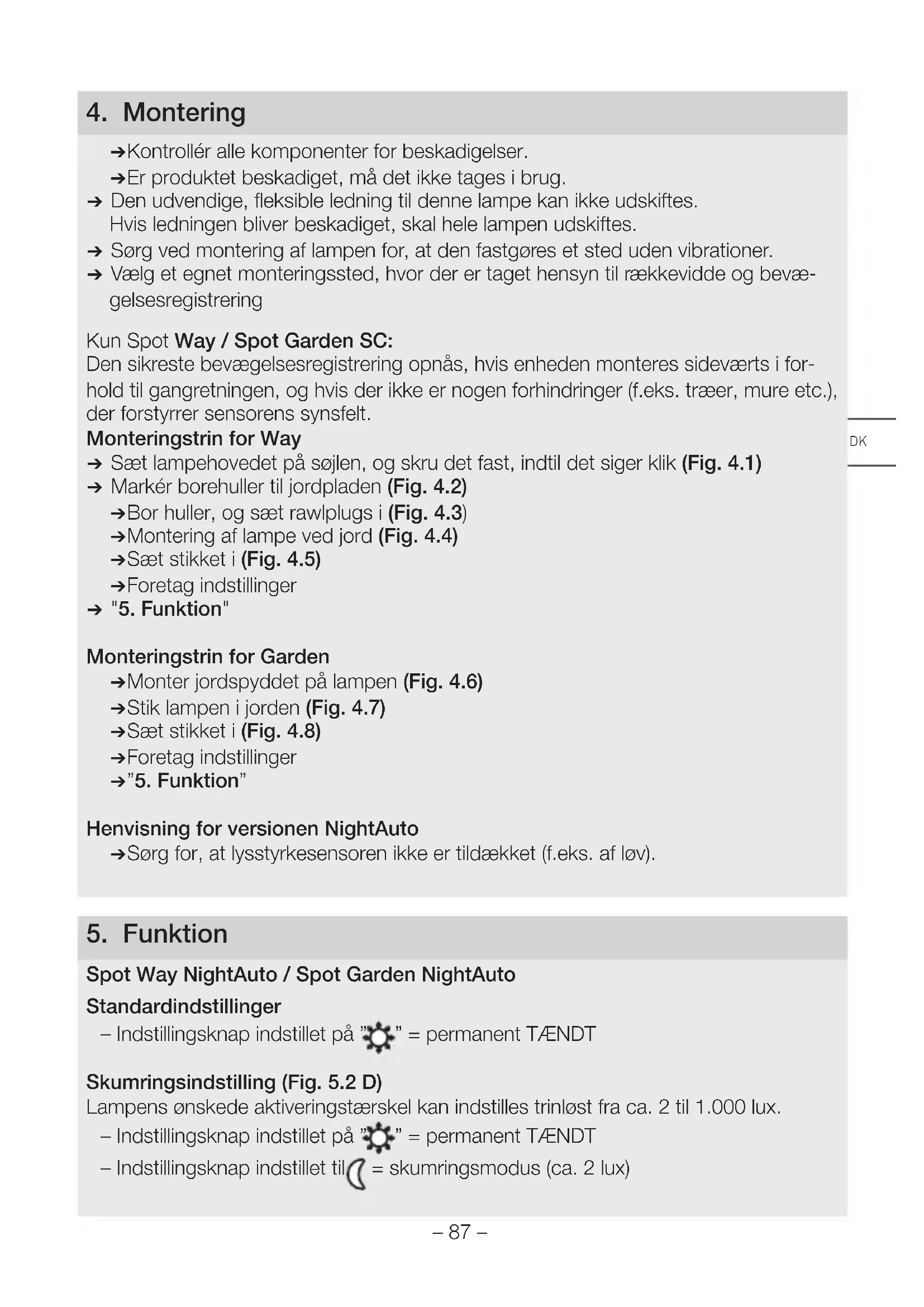 ( Kontrollér alle komponenter for beskadigelser. ( Er produktet beskadiget, må det ikke tages i brug. ( Den udvendige, fleksible ledning til denne lampe kan ikke udskiftes. Hvis ledningen bliver beskadiget, skal hele lampen udskiftes. ( Sørg ved montering af lampen for, at den fastgøres et sted uden vibrationer. ( Vælg et egnet monteringssted, hvor der er taget hensyn til rækkevidde og bevæ- gelsesregistrering Kun Spot Way / Spot Garden SC: Den sikreste bevægelsesregistrering opnås, hvis enheden monteres sideværts i for- hold til gangretningen, og hvis der ikke er nogen forhindringer (f.eks. træer, mure etc.), der forstyrrer sensorens synsfelt. Monteringstrin for Way ( Sæt lampehovedet på søjlen, og skru det fast, indtil det siger klik (Fig. 4.1) ( Markér borehuller til jordpladen (Fig. 4.2) ( Bor huller, og sæt rawlplugs i (Fig. 4.3) ( Montering af lampe ved jord (Fig. 4.4) ( Sæt stikket i (Fig. 4.5) ( Foretag indstillinger ( "5. Funktion" Monteringstrin for Garden ( Monter jordspyddet på lampen (Fig. 4.6) ( Stik lampen i jorden (Fig. 4.7) ( Sæt stikket i (Fig. 4.8) ( Foretag indstillinger ( ”5. Funktion” Henvisning for versionen NightAuto ( Sørg for, at lysstyrkesensoren ikke er tildækket (f.eks. af løv).
