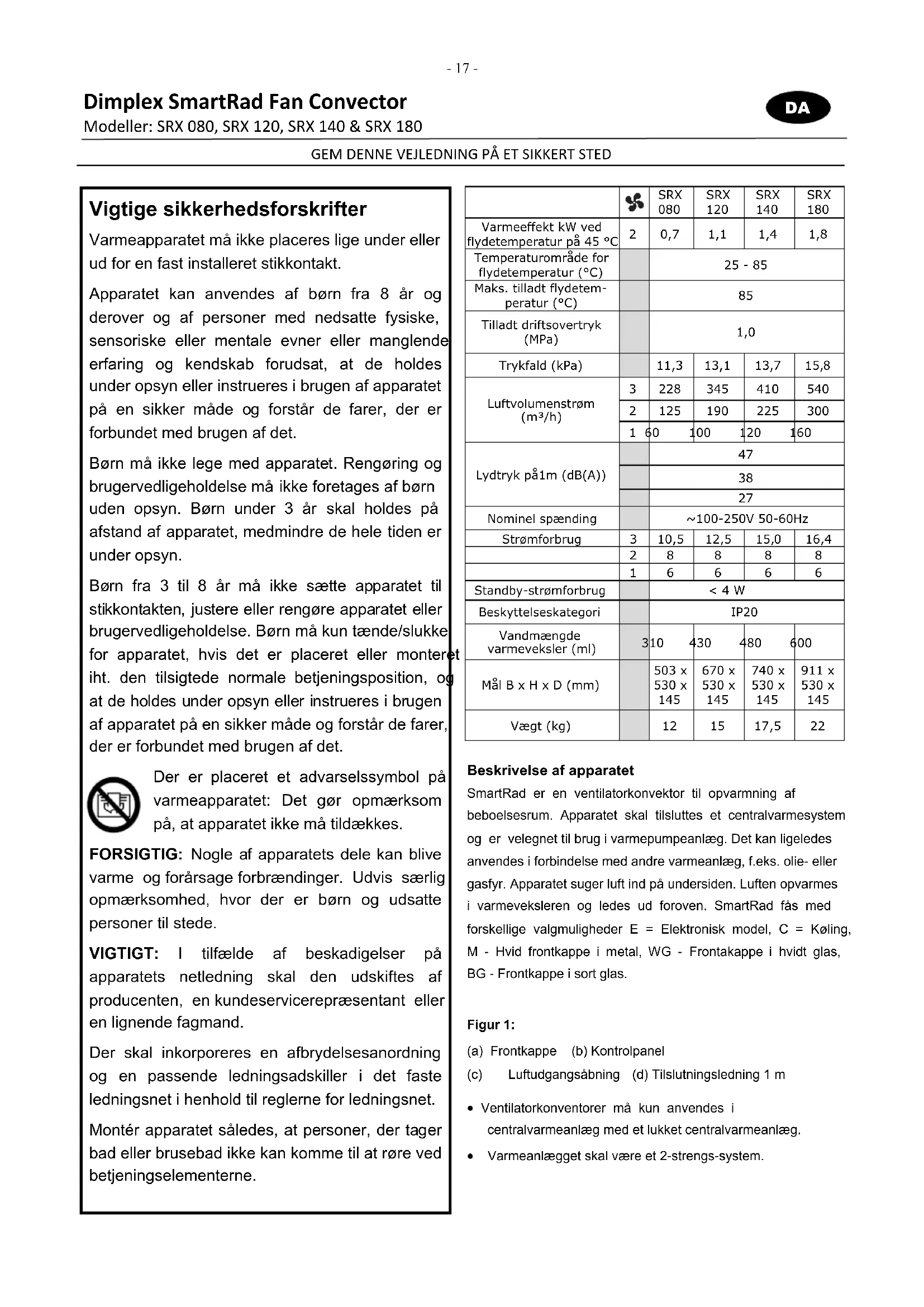 Dimplex SmartRad Fan Convector Modeller: SRX 080, SRX 120, SRX 140 & SRX 180 GEM DENNE VEJLEDNING PÅ ET SIKKERT STED Vigtige sikkerhedsforskrifter Varmeapparatet må ikke placeres lige under eller ud for en fast installeret stikkontakt. Apparatet kan anvendes af børn fra 8 år og derover og af personer med nedsatte fysiske, sensoriske eller mentale evner eller manglende erfaring og kendskab forudsat, at de holdes under opsyn eller instrueres i brugen af apparatet på en sikker måde og forstår de farer, der er forbundet med brugen af det. Børn må ikke lege med apparatet. Rengøring og brugervedligeholdelse må ikke foretages af børn uden opsyn. Børn under 3 år skal holdes på afstand af apparatet, medmindre de hele tiden er under opsyn. Børn fra 3 til 8 år må ikke sætte apparatet til stikkontakten, justere eller rengøre apparatet eller brugervedligeholdelse. Børn må kun tænde/slukke for apparatet, hvis det er placeret eller monteret iht. den tilsigtede normale betjeningsposition, og at de holdes under opsyn eller instrueres i brugen af apparatet på en sikker måde og forstår de farer, der er forbundet med brugen af det. Der er placeret et advarselssymbol på varmeapparatet: Det gør opmærksom på, at apparatet ikke må tildækkes. FORSIGTIG: Nogle af apparatets dele kan blive varme og forårsage forbrændinger. Udvis særlig opmærksomhed, hvor der er børn og udsatte personer til stede. VIGTIGT: I tilfælde af beskadigelser på apparatets netledning skal den udskiftes af producenten, en kundeservicerepræsentant eller en lignende fagmand. Der skal inkorporeres en afbrydelsesanordning og en passende ledningsadskiller i det faste ledningsnet i henhold til reglerne for ledningsnet. Montér apparatet således, at personer, der tager bad eller brusebad ikke kan komme til at røre ved betjeningselementerne. SRX