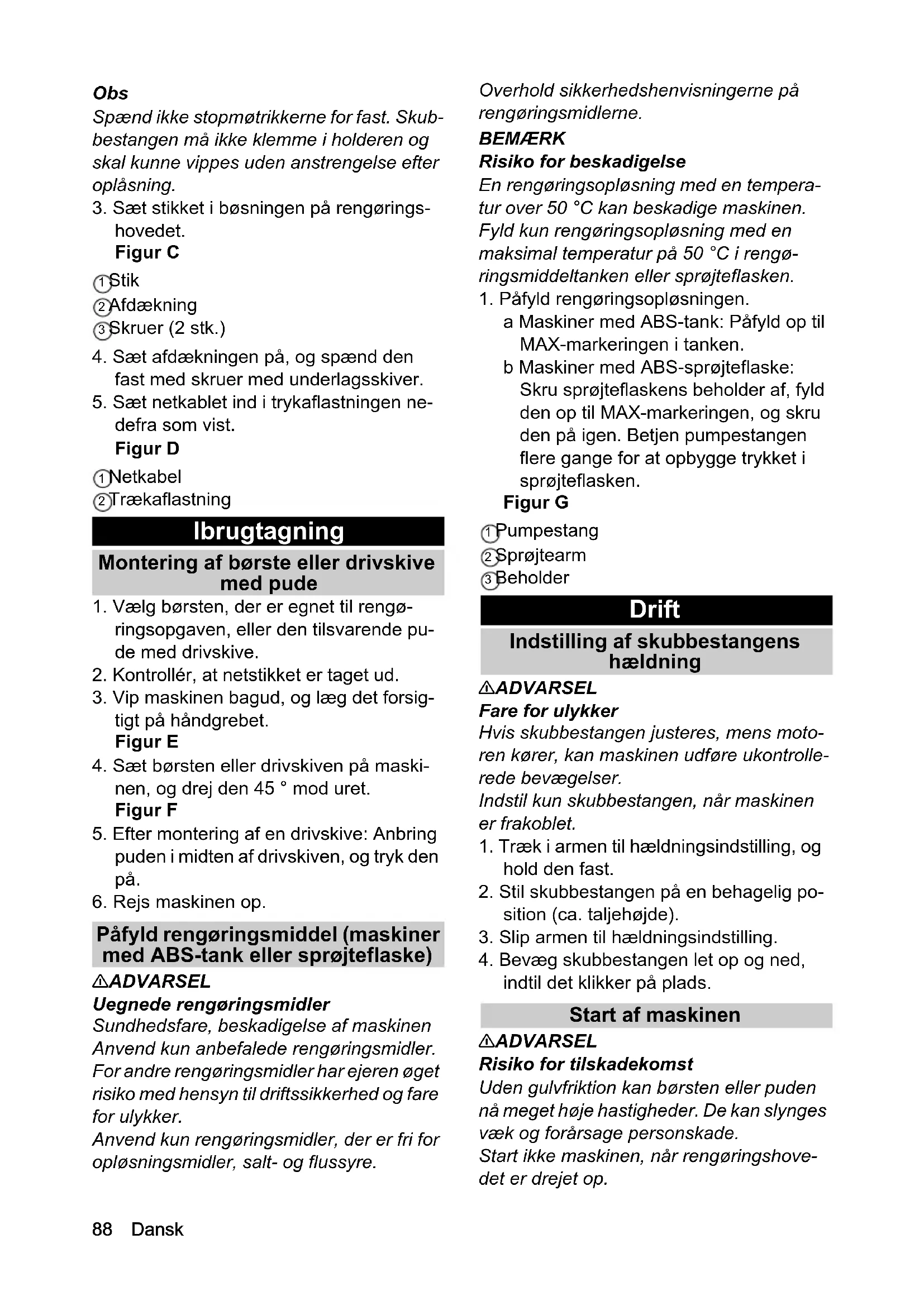 indtil det klikker på plads. Start af maskinen 몇 ADVARSEL Risiko for tilskadekomst Uden gulvfriktion kan børsten eller puden nå meget høje hastigheder. De kan slynges væk og forårsage personskade. Start ikke maskinen, når rengøringshove- det er drejet op.Dansk 89 Den maksimalt tilladte netimpedans ved det elektriske tilslutningspunkt (se tek- niske data) må ikke overskrides. Ved uklarheder vedrørende netimpedan- sen ved dit tilslutningspunkt, skal du kon- takte dit forsyningsselskab. BEMÆRK Risiko for beskadigelse Hvis maskinen kører på samme sted i læn- gere tid, kan gulvbelægningen blive beska- diget. Bevæg altid maskinen, når den er tændt.