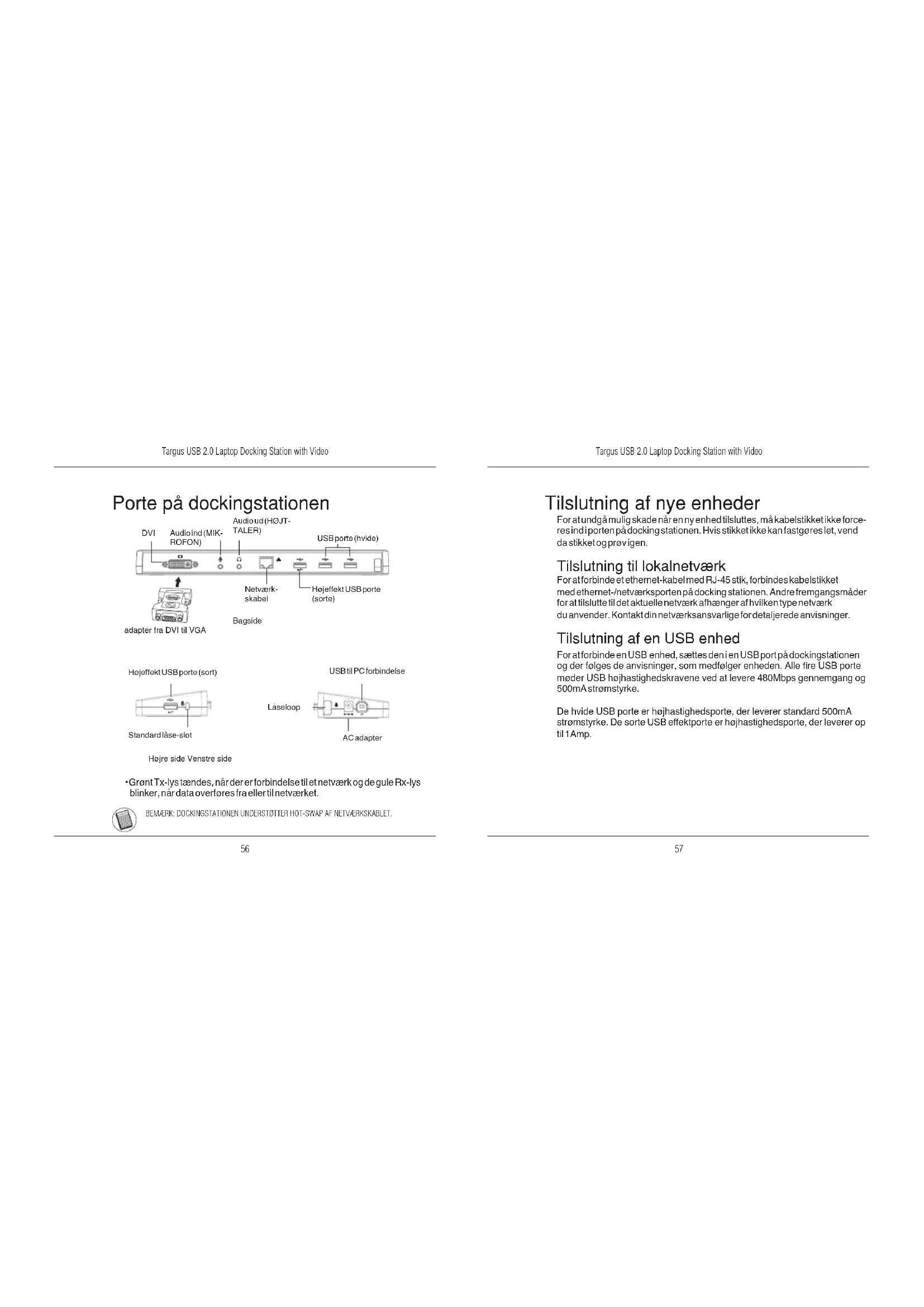 - Grønt Tx-lys tændes, når der er forbindelse til et netværk og de gule Rx-lys blinker, når data overføres fra eller til netværket. BEMÆRK: DOCKINGSTATIONEN UNDERSTØTTER HOT-SWAP AF NETVÆRKSKABLET. Porte på dockingstationen DVI Audio ind (MIK- ROFON) Audio ud (HØJT- TALER) Netværk- skabel USB porte (hvide) Højeffekt USB porte (sorte) Højeffekt USB porte (sort) USB til PC forbindelse Låseloop AC adapter Standard låse-slot Bagside Højre side Venstre side Tilslutning af nye enheder For at undgå mulig skade når en ny enhed tilsluttes, må kabelstikket ikke force- res ind i porten på docking stationen. Hvis stikket ikke kan fastgøres let, vend da stikket og prøv igen. Tilslutning til lokalnetværk For at forbinde et ethernet-kabel med RJ-45 stik, forbindes kabelstikket med ethernet-/netværksporten på docking stationen. Andre fremgangsmåder for at tilslutte til det aktuelle netværk afhænger af hvilken type netværk du anvender. Kontakt din netværksansvarlige for detaljerede anvisninger. Tilslutning af en USB enhed For at forbinde en USB enhed, sættes den i en USB port på dockingstationen og der følges de anvisninger, som medfølger enheden. Alle re USB porte møder USB højhastighedskravene ved at levere 480Mbps gennemgang og 500mA strømstyrke. De hvide USB porte er højhastighedsporte, der leverer standard 500mA strømstyrke. De sorte USB effektporte er højhastighedsporte, der leverer op til 1Amp. adapter fra DVI til VGATargus USB 2.0 Laptop Docking Station with Video