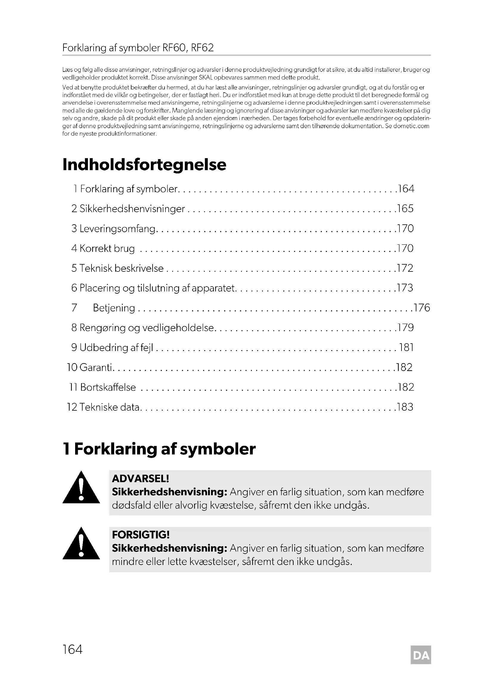 - Læs og følg alle disse anvisninger, retningslinjer og advarsler i denne produktvejledning grundigt for at sikre, at du altid installerer, bruger og vedligeholder produktet korrekt. Disse anvisninger SKAL opbevares sammen med dette produkt. Ved at benytte produktet bekræfter du hermed, at du har læst alle anvisninger, retningslinjer og advarsler grundigt, og at du forstår og er indforstået med de vilkår og betingelser, der er fastlagt heri. Du er indforstået med kun at bruge dette produkt til det beregnede formål og anvendelse i overensstemmelse med anvisningerne, retningslinjerne og advarslerne i denne produktvejledningen samt i overensstemmelse med alle de gældende love og forskrifter. Manglende læsning og ignorering af disse anvisninger og advarsler kan medføre kvæstelser på dig selv og andre, skade på dit produkt eller skade på anden ejendom i nærheden. Der tages forbehold for eventuelle ændringer og opdaterin- ger af denne produktvejledning samt anvisningerne, retningslinjerne og advarslerne samt den tilhørende dokumentation. Se dometic.com for de nyeste produktinformationer. Indholdsfortegnelse 1 Forklaring af symboler p. 164