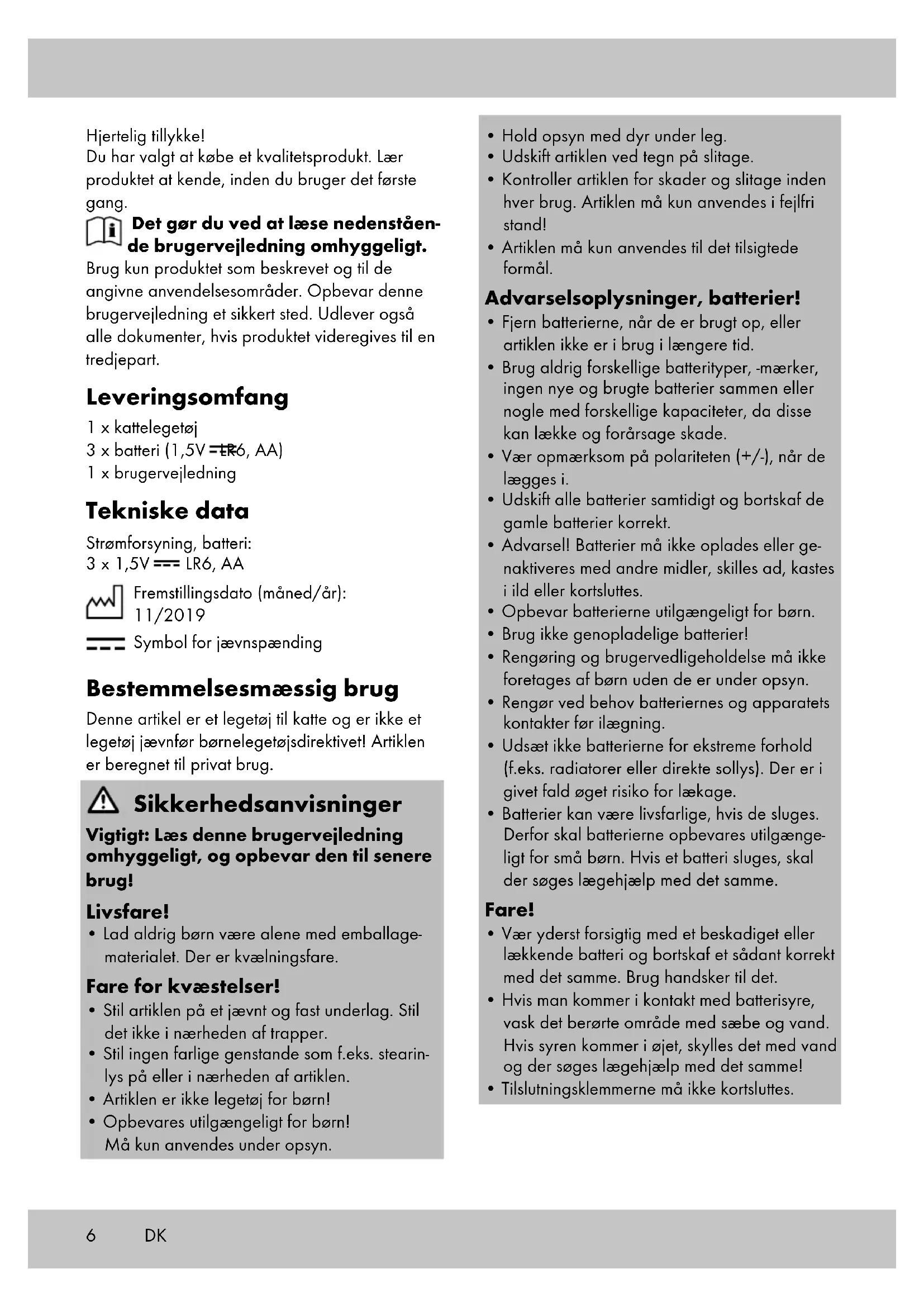 artiklens funktion. Opbevaring, rengøring Opbevar altid artiklen tør, ren, uden batterier og ved stuetemperatur, når den ikke er i brug. Tør den kun af med en tør rengøringsklud. VIGTIGT! Må aldrig rengøres med skrappe rengøringsmidler. Henvisninger vedr. bortskaffelse Med henblik på at beskytte miljøet bedst muligt, er det vigtigt, at du ikke smider dit produkt ud sammen med husholdningsaf- faldet, når det ikke længere kan anven- des, men i stedet sørger for at bortskaffe det på en forsvarlig måde. For at få oplysninger om genbrugsstationer og deres åbningstider, bedes du kontakte deres ansvarlige administration. Defekte eller brugte batterier, genopladelige eller ej, skal genbruges i overensstemmelse med direktiv 2006/66/EF samt alle ændringer heraf. Du skal indlevere batterierne, genopladelige eller ej, og/ eller produktet hos de genbrugsstationer, der findes i dit lokalområde. Emballagematerialer som f.eks. plasticposer er ikke beregnede til børn. Opbevar emballagematerialet utilgængeligt for børn. Miljøskader på grund af ukorrekt bortskaffelse af batterierne, genopladelige eller ej! Batterier, genopladelige eller ej, må ikke bortskaffes sammen med husholdningsaf- faldet. De kan indeholde giftige tungmetaller, og er derfor underlagt den samme håndtering som farligt affald. Tungmetallernes kemiske symboler er som følger: Cd = cadmium, Hg = kviksølv, Pb = bly. Indlever derfor de brugte batterier, genopla- delige eller ej, på en af de kommunale genbrugs- stationer. Bortskaf produktet og emballagemateria- lerne miljørigtigt. Vær opmærksom på emballagemateria- lernes mærkning under affaldssorteringen. Disse er markeret med forkortelser (a) og tal (b), der har følgende betydning: 1-7: Kunststoffer/20-22: Papir og pap/80-98: Kompositmaterialer. Produktet og emballagema- terialerne kan genbruges, hvorfor du bedes bortskaffe dem separat for at opnå en bedre affaldshåndtering. Triman-logoet er kun gældende for Frankrig. De forskellige bortskaffel- sesmuligheder, der eksisterer for det udtjente produkt, kan du få mere information om hos kommune- eller byforvaltningen.8 DK Oplysninger om garanti og servicehåndtering Produktet er fremstillet med største omhu og un- der vedvarende kontrol. Der ydes en garanti på tre år fra købsdatoen på dette produkt. Opbevar venligst kvitteringen fra købet. Garantien gælder kun for materiale- og fabrikationsfejl og bortfalder ved misbrug eller uhensigtsmæssig anvendelse. Deres lovpligtige rettigheder, særligt garantikrav, begrænses ikke af denne garanti. Ved eventuelle klager bedes du henvende dig til nedenstående service-hotline eller tage kontakt til os via e-mail. Medarbejderne i vores kundetjeneste vil så aftale den videre fremgangs- måde med dig. Vi vil under alle omstændigheder rådgive dig personlig. Garantiperioden forlænges ikke ved eventuel- le reparationer inden for garantien eller ved kulance. Dette gælder også for udskiftede og reparerede dele. Efter udløb af garantien er forefaldende reparationer forbundet med omkostninger. IAN: 307316_1904 Service Danmark Tel.: 32 710005 E-Mail: deltasport@lidl.dk9FR/BE Félicitations ! Vous venez d’acquérir un article de grande qualité. Avant la première utilisation, familiari- sez-vous avec l’article. Pour cela, veuillez lire attentive- ment la notice d’utilisation suivante. Utilisez l’article uniquement comme indiqué et pour les domaines d’utilisation mentionnés. Conservez bien cette notice d’utilisation. Si vous cédez l’article à un tiers, veillez à lui remettre l’ensemble de la documentation. Étendue de la livraison 1 jouet pour chat 3 piles (1,5V LR6, AA) 1 notice d’utilisation Caractéristiques techniques Alimentation en énergie à piles : 3 piles 1,5V LR6, AA Date de fabrication (mois/année) : 11/2019 Symbole de tension continue Utilisation conforme à sa des- tination Cet article est un jouet pour chats et n’est pas un jouet au sens de la directive sur les jouets ! L’article est destiné à un usage privé. Consignes de sécurité Important : lisez attentivement cette notice d’utilisation et conservez-la abso- lument ! Danger de mort !
