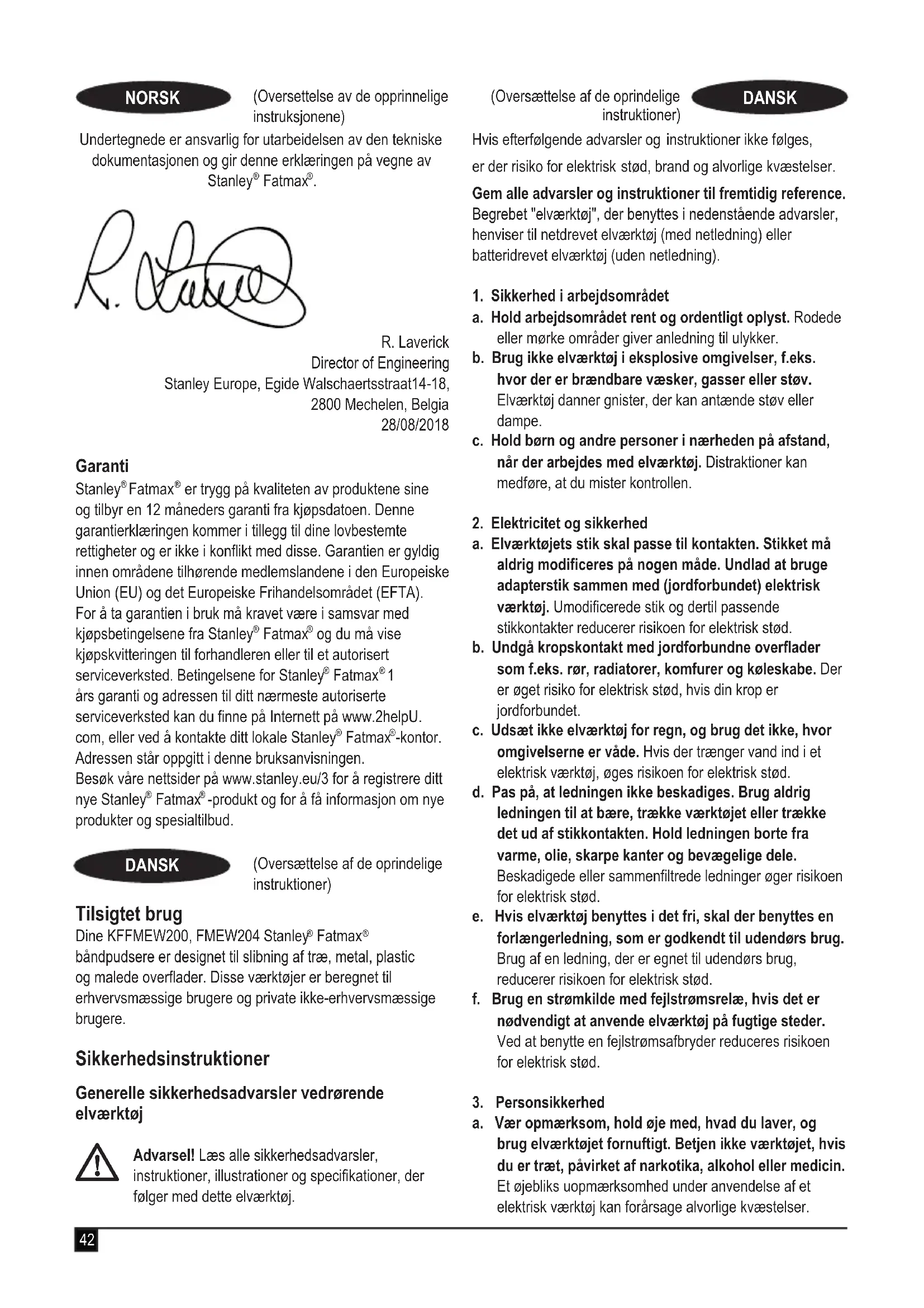 KFFMEW200, FMEW204 Båndpudser Stanley Europe erklærer, at produkterne beskrevet under "Tekniske data" er i overensstemmelse med: 2006/42/EC, EN 62841-1:2015; EN 62841-2-4:2014 Disse produkter er endvidere i overensstemmelse med direktiv 2014/30/EU og 2011/65/EU. Kontakt Stanley Europe på nedenstående adresse, eller se vejledningens bagside for at få ere oplysninger. Undertegnede er ansvarlig for udarbejdelsen af de tekniske data og fremsætter denne erklæring på vegne af Stanley