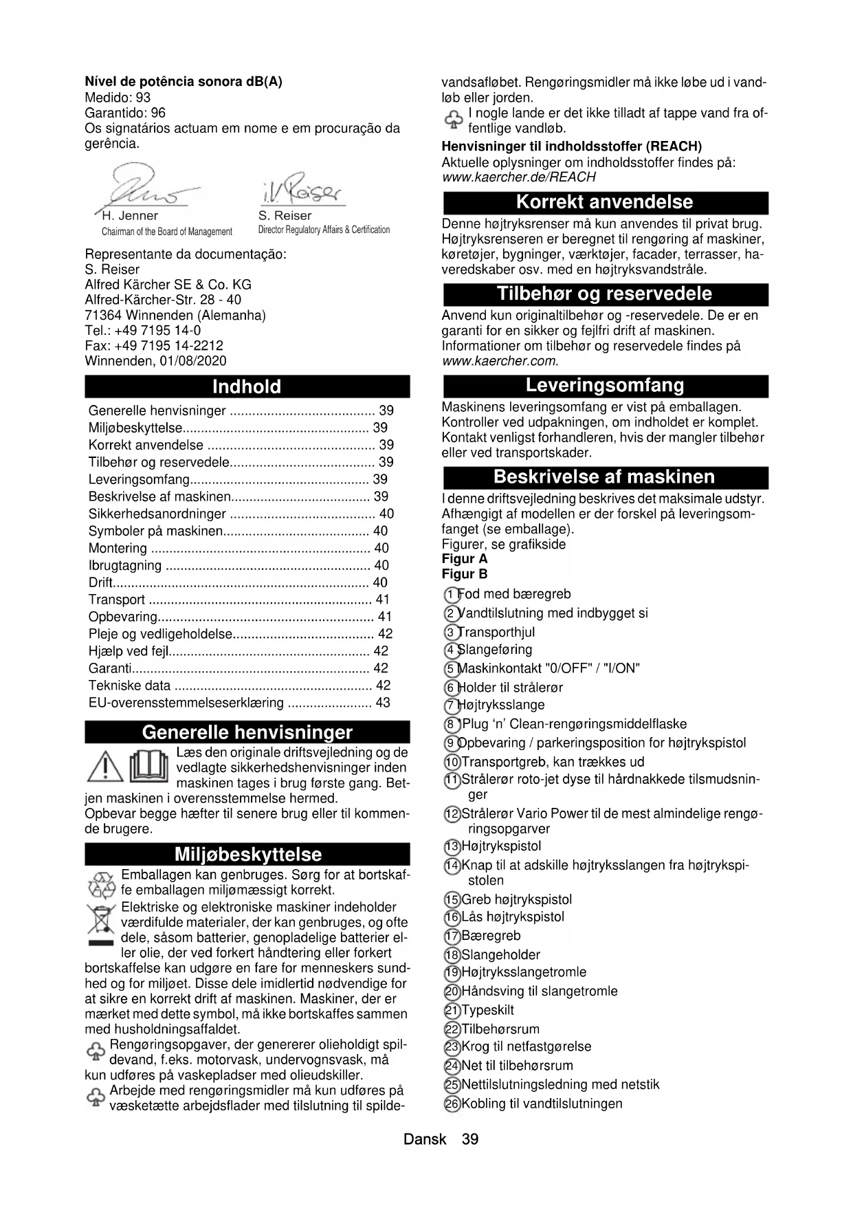 - dB(A) 96 96 K 7 Power Premium PowerDansk 39 Nível de potência sonora dB(A) Medido: 93 Garantido: 96 Os signatários actuam em nome e em procuração da gerência. Representante da documentação: S. Reiser Alfred Kärcher SE & Co. KG Alfred-Kärcher-Str. 28 - 40 71364 Winnenden (Alemanha) Tel.: +49 7195 14-0 Fax: +49 7195 14-2212 Winnenden, 01/08/2020 Indhold Generelle henvisninger Læs den originale driftsvejledning og de vedlagte sikkerhedshenvisninger inden maskinen tages i brug første gang. Bet- jen maskinen i overensstemmelse hermed. Opbevar begge hæfter til senere brug eller til kommen- de brugere. Miljøbeskyttelse Emballagen kan genbruges. Sørg for at bortskaf- fe emballagen miljømæssigt korrekt. Elektriske og elektroniske maskiner indeholder værdifulde materialer, der kan genbruges, og ofte dele, såsom batterier, genopladelige batterier el- ler olie, der ved forkert håndtering eller forkert bortskaffelse kan udgøre en fare for menneskers sund- hed og for miljøet. Disse dele imidlertid nødvendige for at sikre en korrekt drift af maskinen. Maskiner, der er mærket med dette symbol, må ikke bortskaffes sammen med husholdningsaffaldet. Rengøringsopgaver, der genererer olieholdigt spil- devand, f.eks. motorvask, undervognsvask, må kun udføres på vaskepladser med olieudskiller. Arbejde med rengøringsmidler må kun udføres på væsketætte arbejdsflader med tilslutning til spilde- vandsafløbet. Rengøringsmidler må ikke løbe ud i vand- løb eller jorden. I nogle lande er det ikke tilladt af tappe vand fra of- fentlige vandløb. Henvisninger til indholdsstoffer (REACH) Aktuelle oplysninger om indholdsstoffer findes på: www.kaercher.de/REACH Korrekt anvendelse Denne højtryksrenser må kun anvendes til privat brug. Højtryksrenseren er beregnet til rengøring af maskiner, køretøjer, bygninger, værktøjer, facader, terrasser, ha- veredskaber osv. med en højtryksvandstråle. Tilbehør og reservedele Anvend kun originaltilbehør og -reservedele. De er en garanti for en sikker og fejlfri drift af maskinen. Informationer om tilbehør og reservedele findes på www.kaercher.com. Leveringsomfang Maskinens leveringsomfang er vist på emballagen. Kontroller ved udpakningen, om indholdet er komplet. Kontakt venligst forhandleren, hvis der mangler tilbehør eller ved transportskader. Beskrivelse af maskinen I denne driftsvejledning beskrives det maksimale udstyr. Afhængigt af modellen er der forskel på leveringsom- fanget (se emballage). Figurer, se grafikside Figur A Figur B 1 Fod med bæregreb 2 Vandtilslutning med indbygget si 3 Transporthjul 4 Slangeføring 5 Maskinkontakt "0/OFF" / "I/ON" 6 Holder til strålerør 7 Højtryksslange 8 *Plug ‘n’ Clean-rengøringsmiddelflaske 9 Opbevaring / parkeringsposition for højtrykspistol 10 Transportgreb, kan trækkes ud 11 Strålerør roto-jet dyse til hårdnakkede tilsmudsnin- ger 12 Strålerør Vario Power til de mest almindelige rengø- ringsopgarver 13 Højtrykspistol 14 Knap til at adskille højtryksslangen fra højtrykspi- stolen 15 Greb højtrykspistol 16 Lås højtrykspistol 17 Bæregreb 18 Slangeholder 19 Højtryksslangetromle 20 Håndsving til slangetromle 21 Typeskilt 22 Tilbehørsrum 23 Krog til netfastgørelse 24 Net til tilbehørsrum 25 Nettilslutningsledning med netstik 26 Kobling til vandtilslutningen Generelle henvisninger p. 39